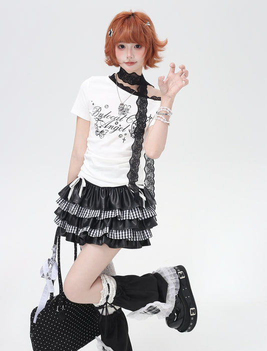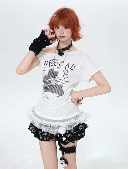 甘辛ムード♡レース切替キャットプリントゆるTシャツ