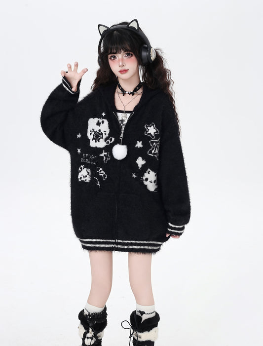 ねこモチーフ フード付きルーズニット|黒×グレー サブカル