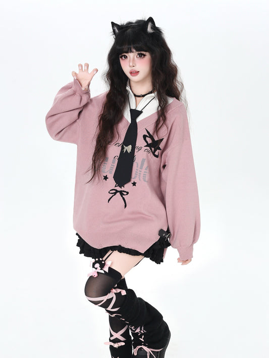 ゆるギャル系 Vネック配色リボンニット♡秋冬甘辛ミックス