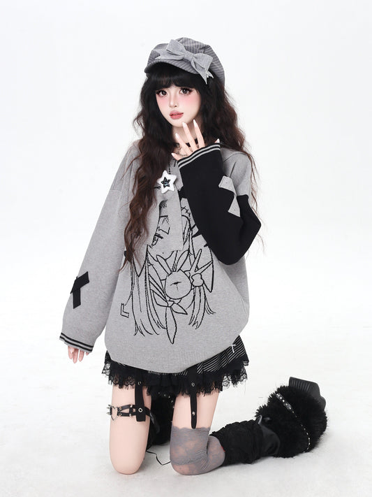 白黒ねこモチーフ ルーズニットプルオーバー|秋冬ゆるサブカル