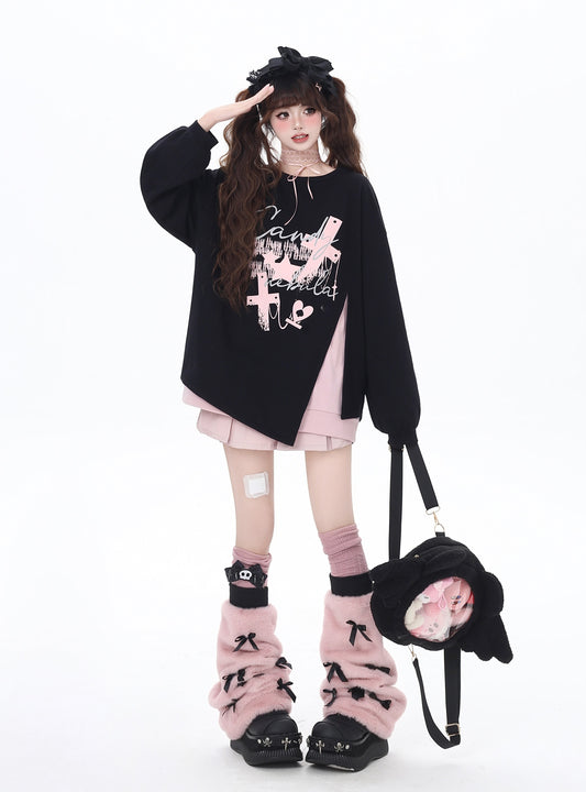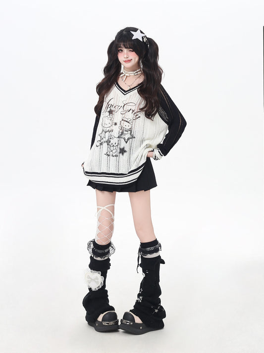 黒白ねこプリント 甘辛配色ゆるニット 秋の着痩せトップス