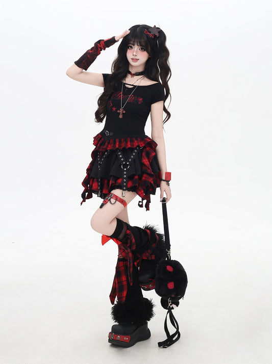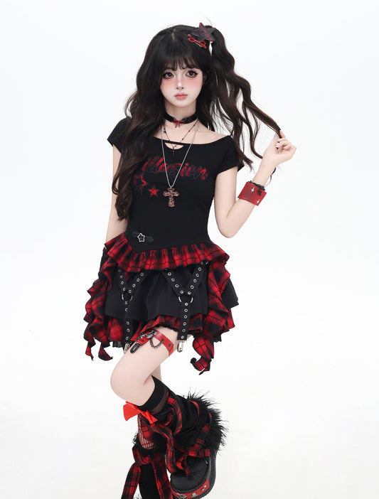 赤チェック×ティアードスカート