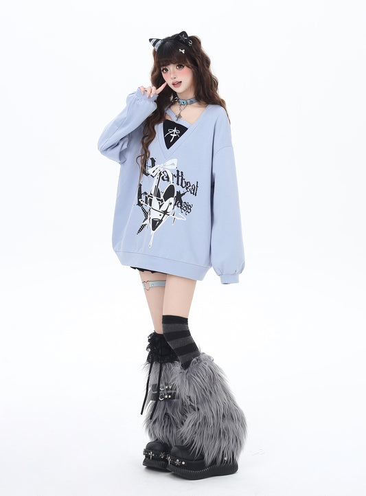 蝶結びVネック重ね着風デザインゆるふわスウェット