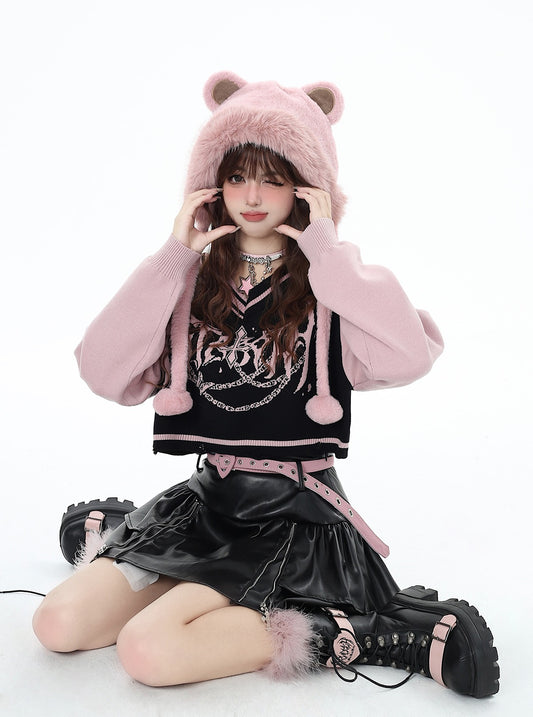 Black and pink V-neck off-shoulder sweater