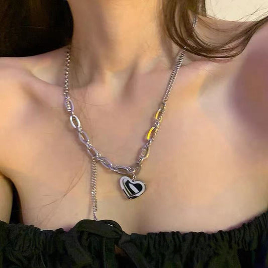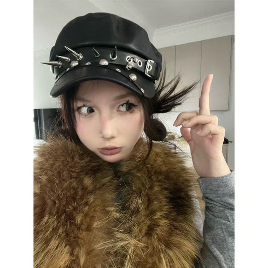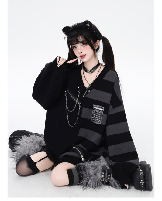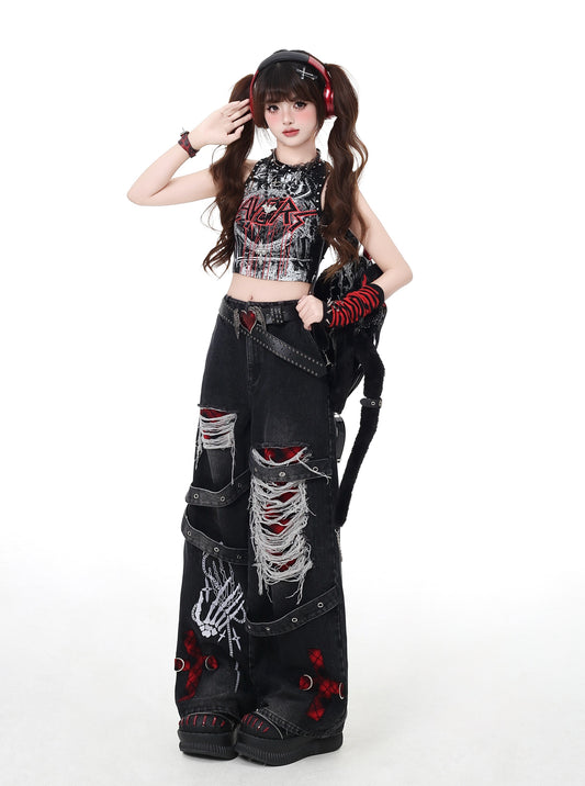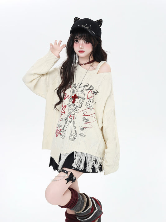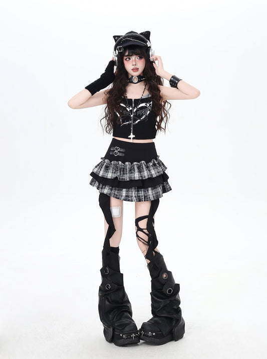 パンク風チェック柄オープンショルダーゆったりTシャツ
