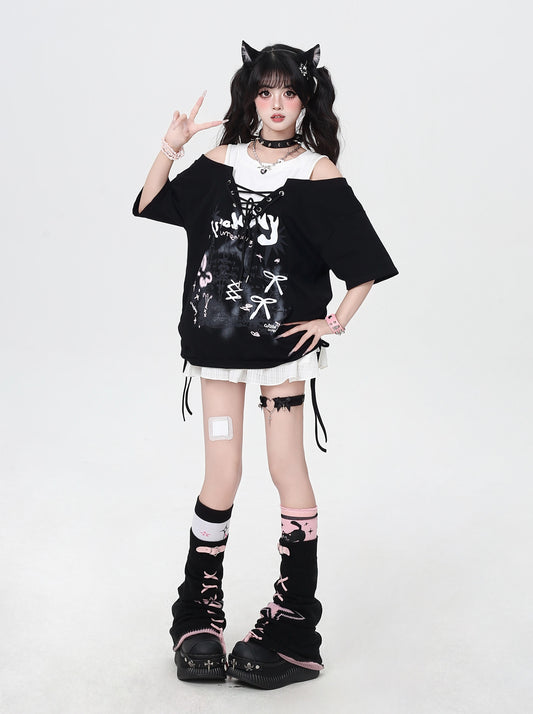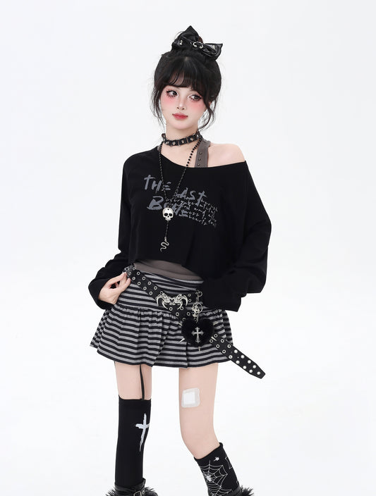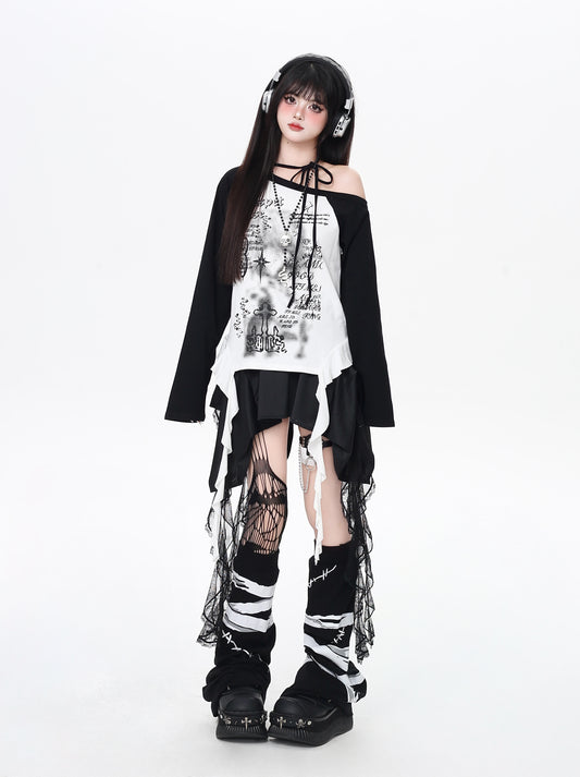 レトロY2K斜め肩ホルターネック配色ゆる細見えTシャツ秋