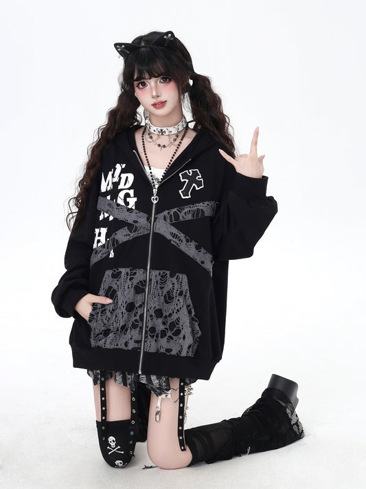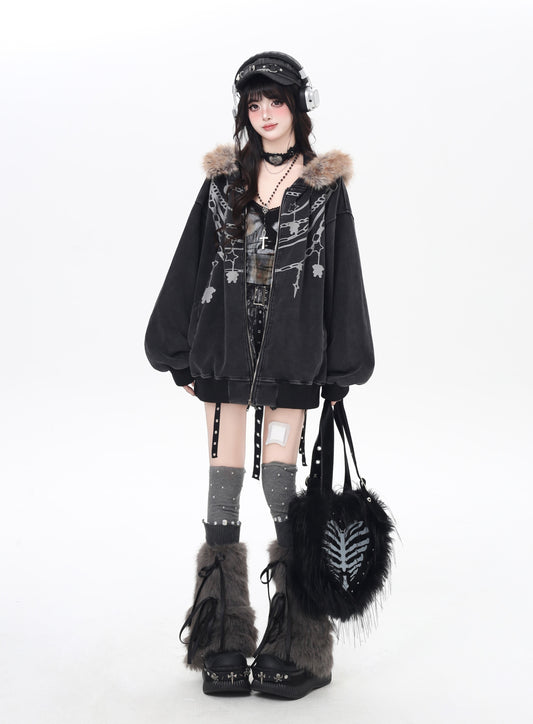 レトロストリート ネックレスプリント ヴィンテージ加工 オーバーサイズパーカー 秋冬