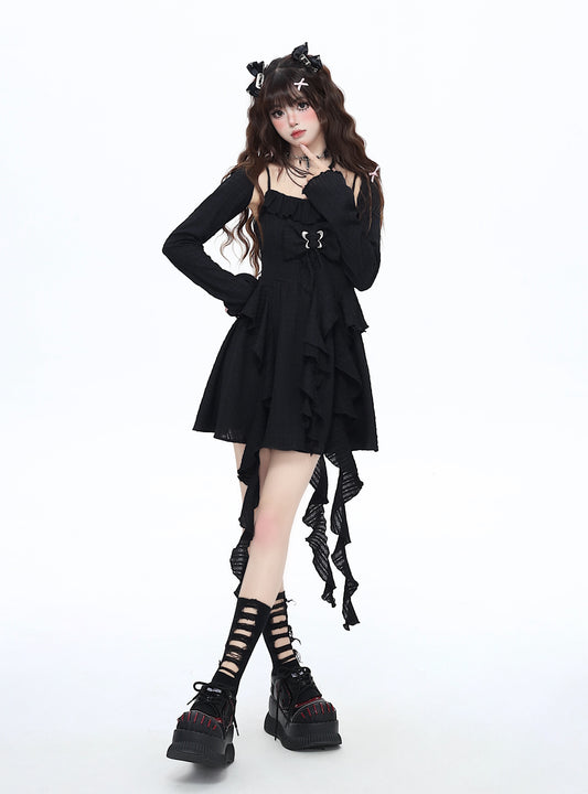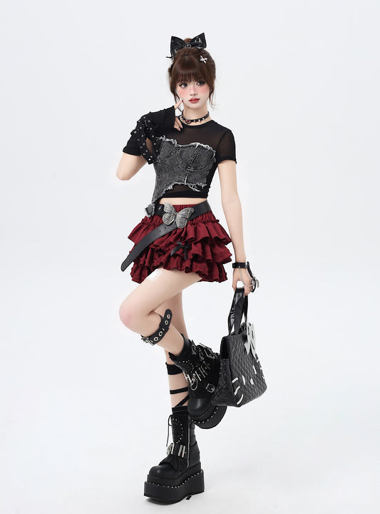 リボン付きデニムレイヤードジャケット|甘辛ストリート