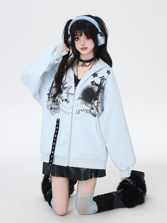 水色ガーリー 二次元アニメプリントゆるパーカー 可愛い系