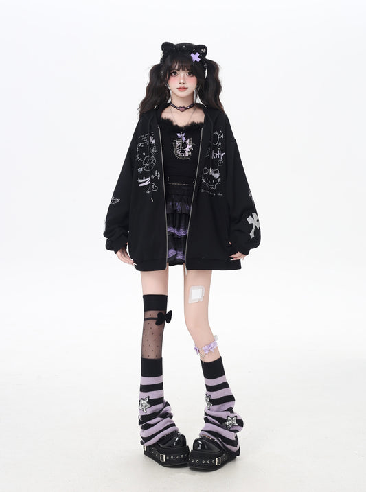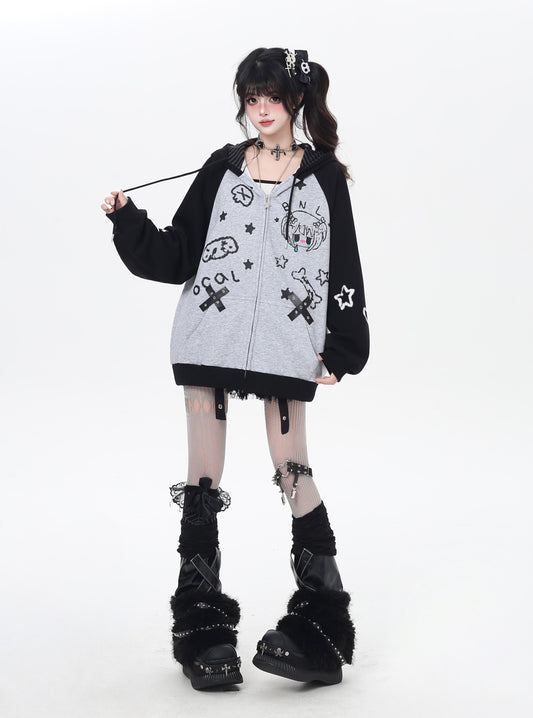 <tc>On Sale</tc>地雷系ダークキャット 黒グレーゆるパーカー 秋のジップアップ