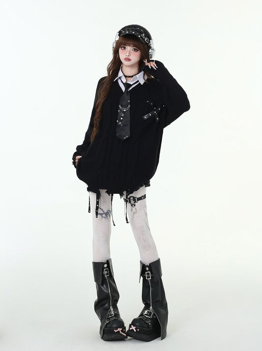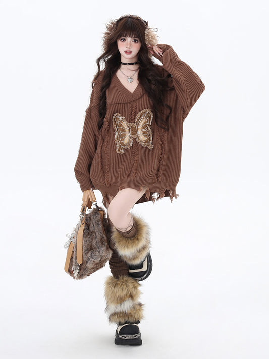 流れるフリンジ×蝶パッチ♡ゆるVネックニット