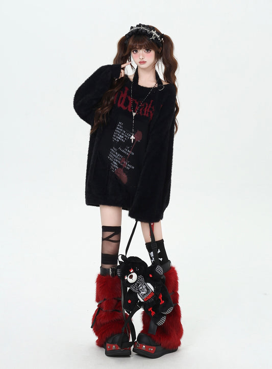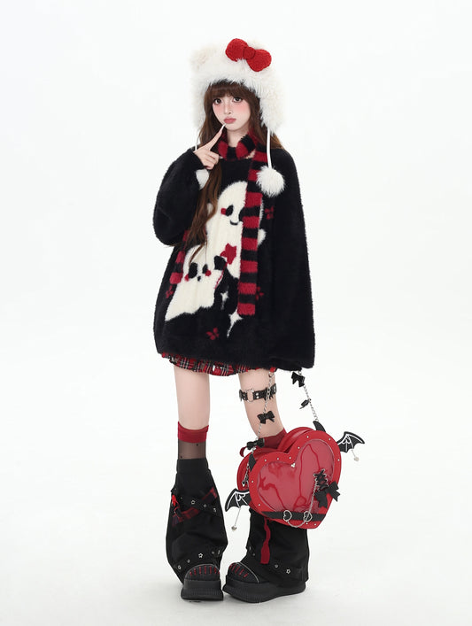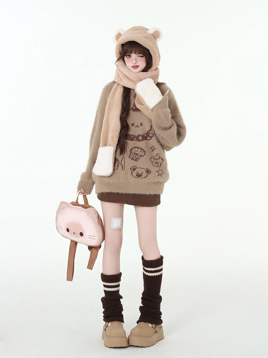 可愛いクマ刺繍フード付きフェイクミンクゆったりニット