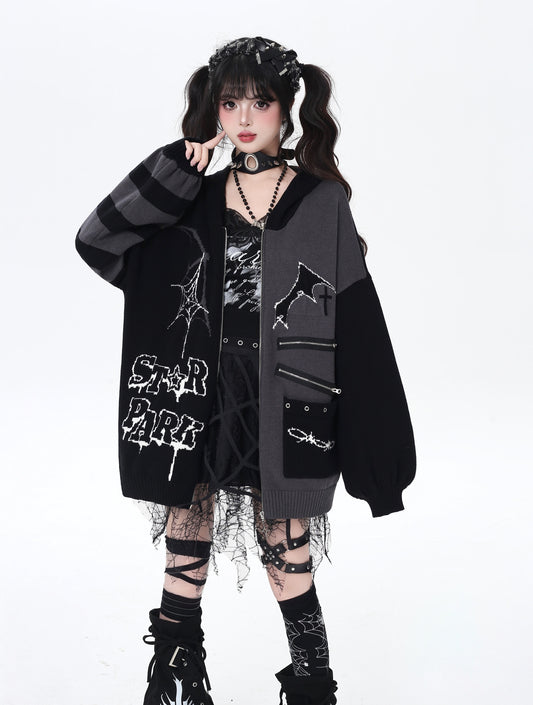 <tc>On Sale</tc>地雷系ダークキャット 黒グレーゆるパーカー 秋のジップアップ