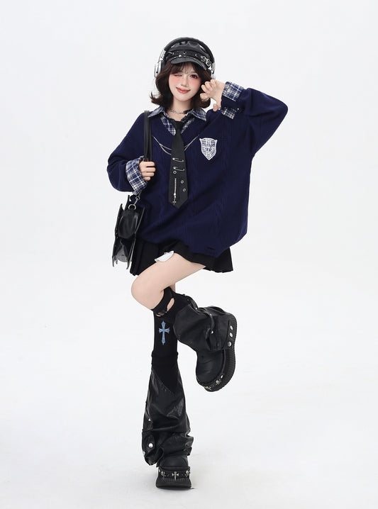 学院系シャツ風フェイクレイヤードニットトップス