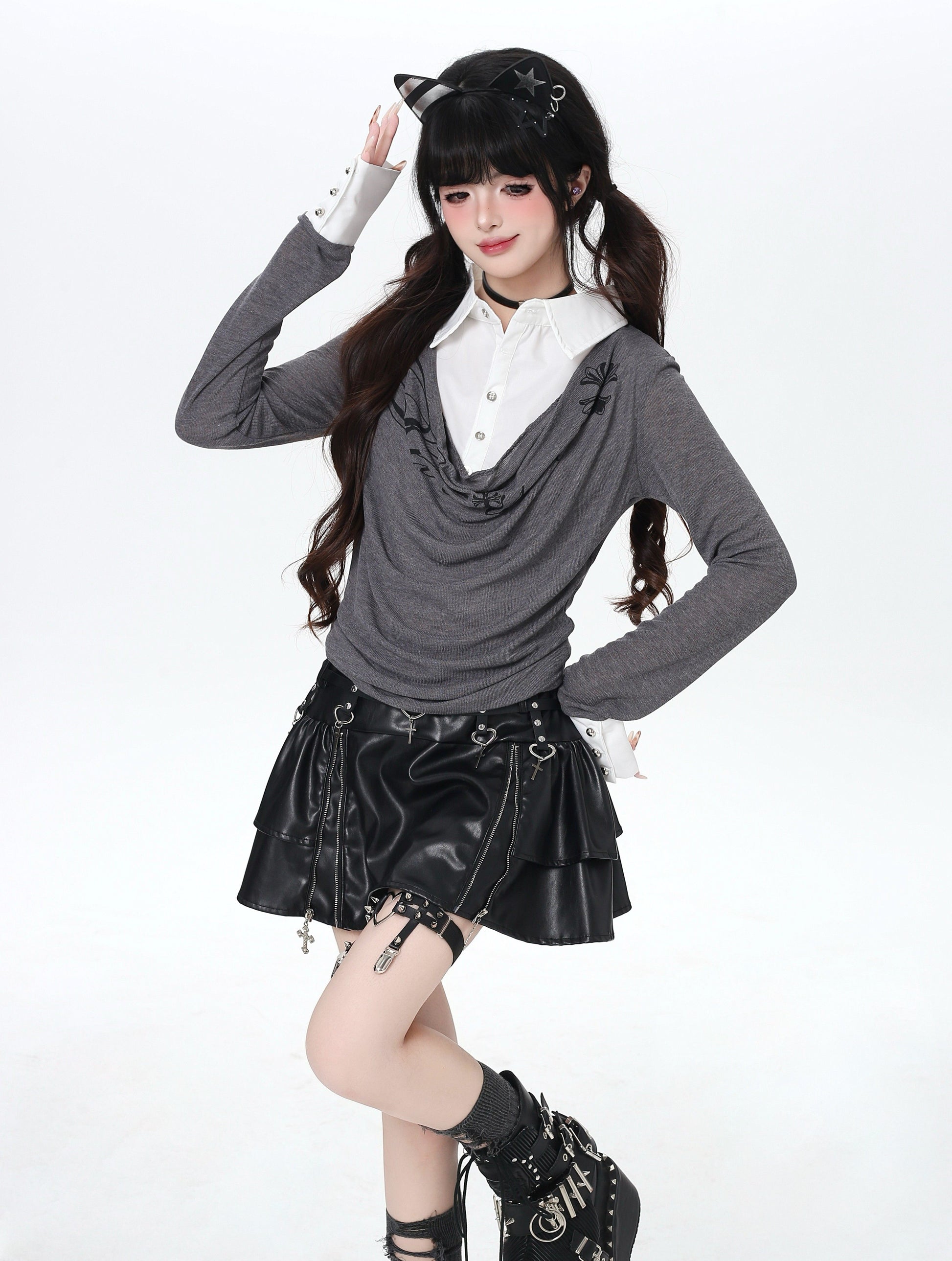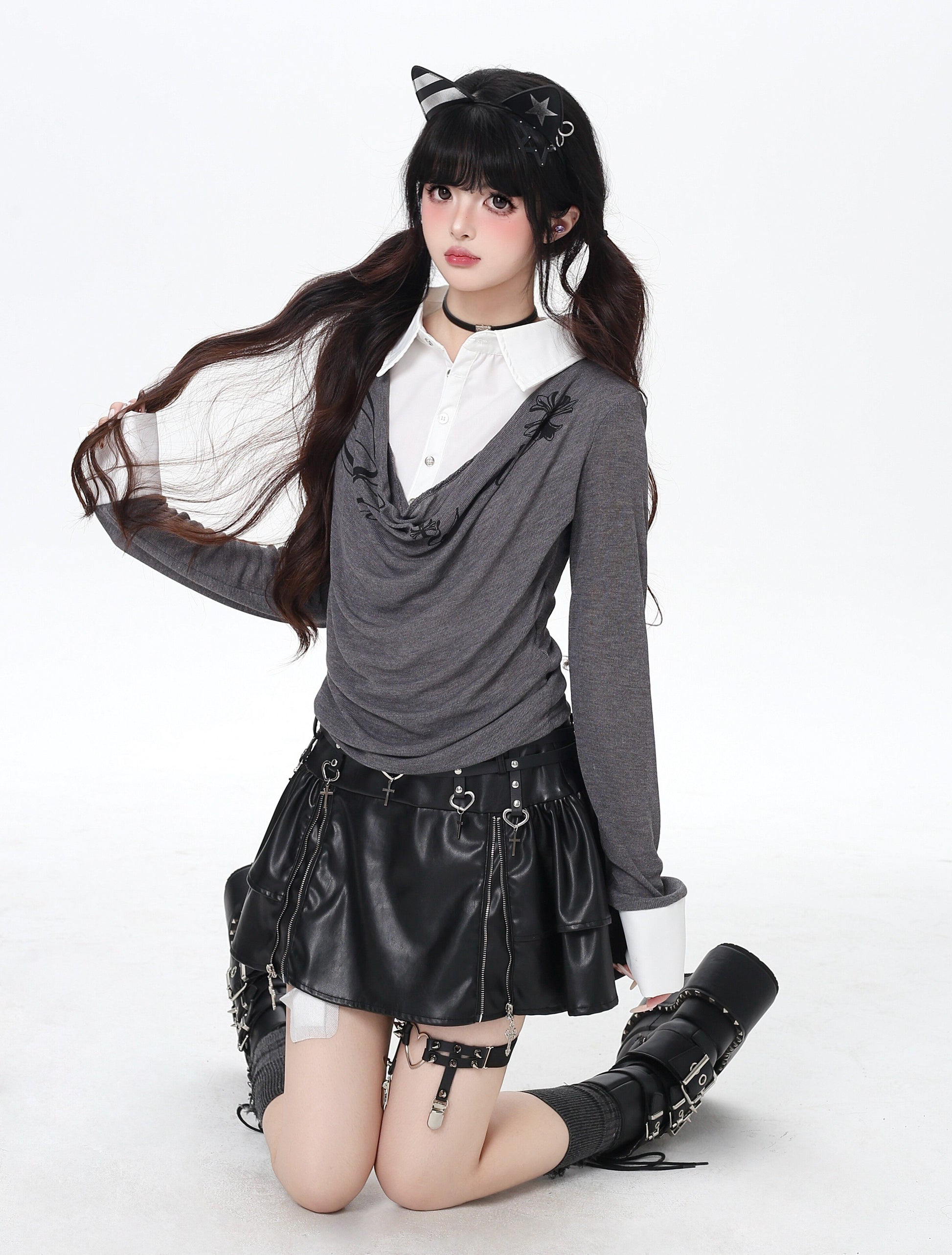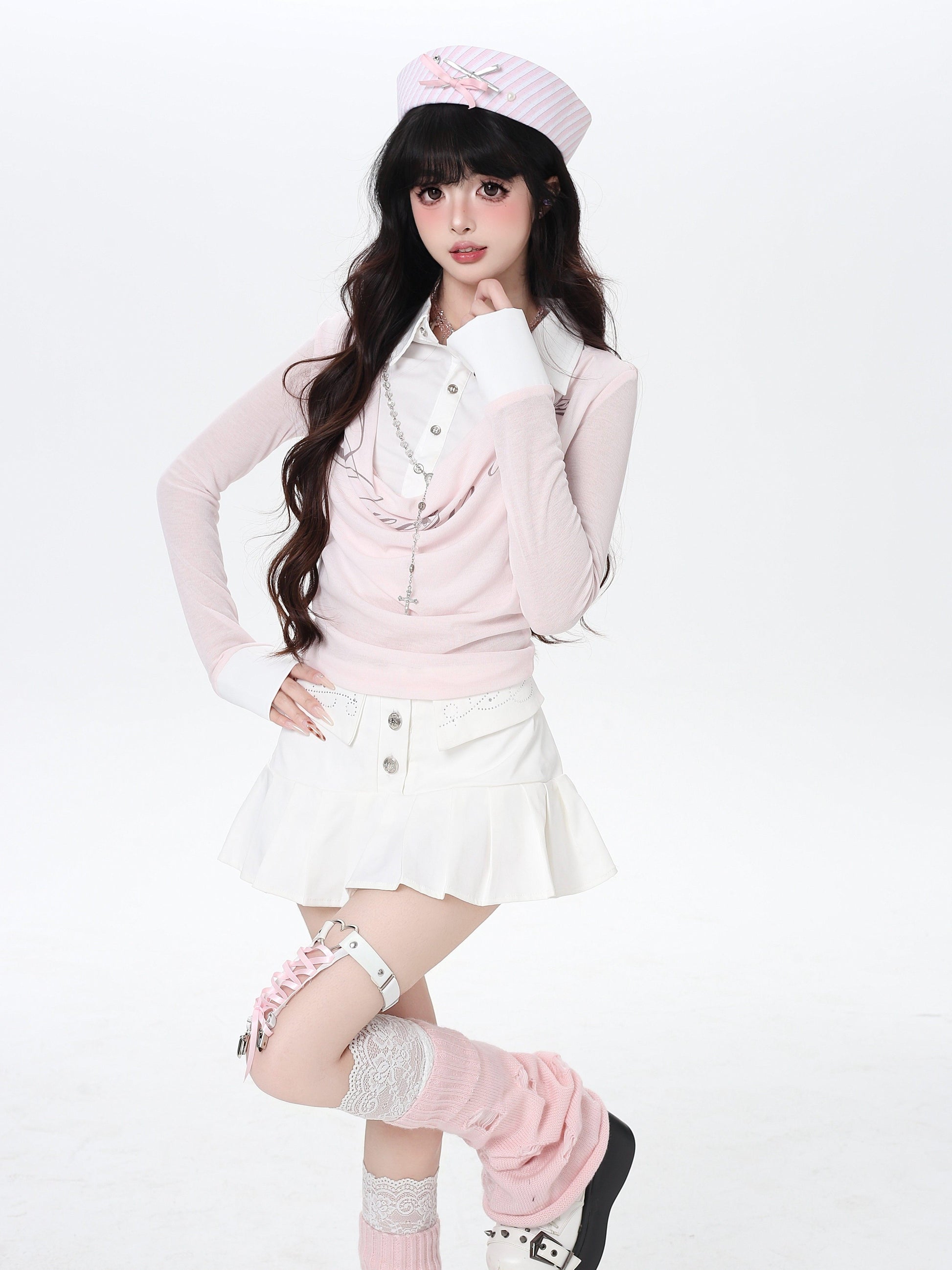 ポロ風レイヤードトップス|韓国ガーリー・細見え