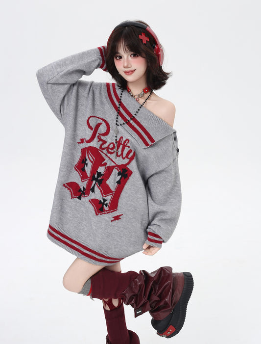 襟付きクロスプリントオフショルニット|甘辛ストリート