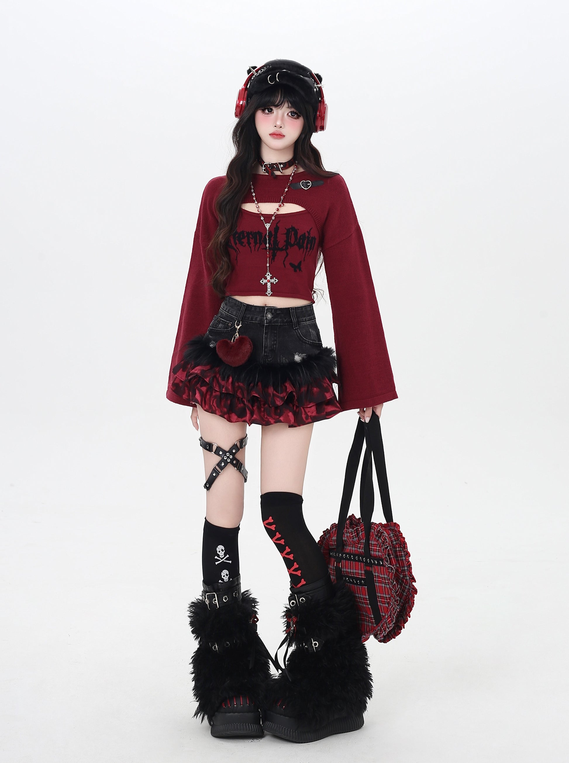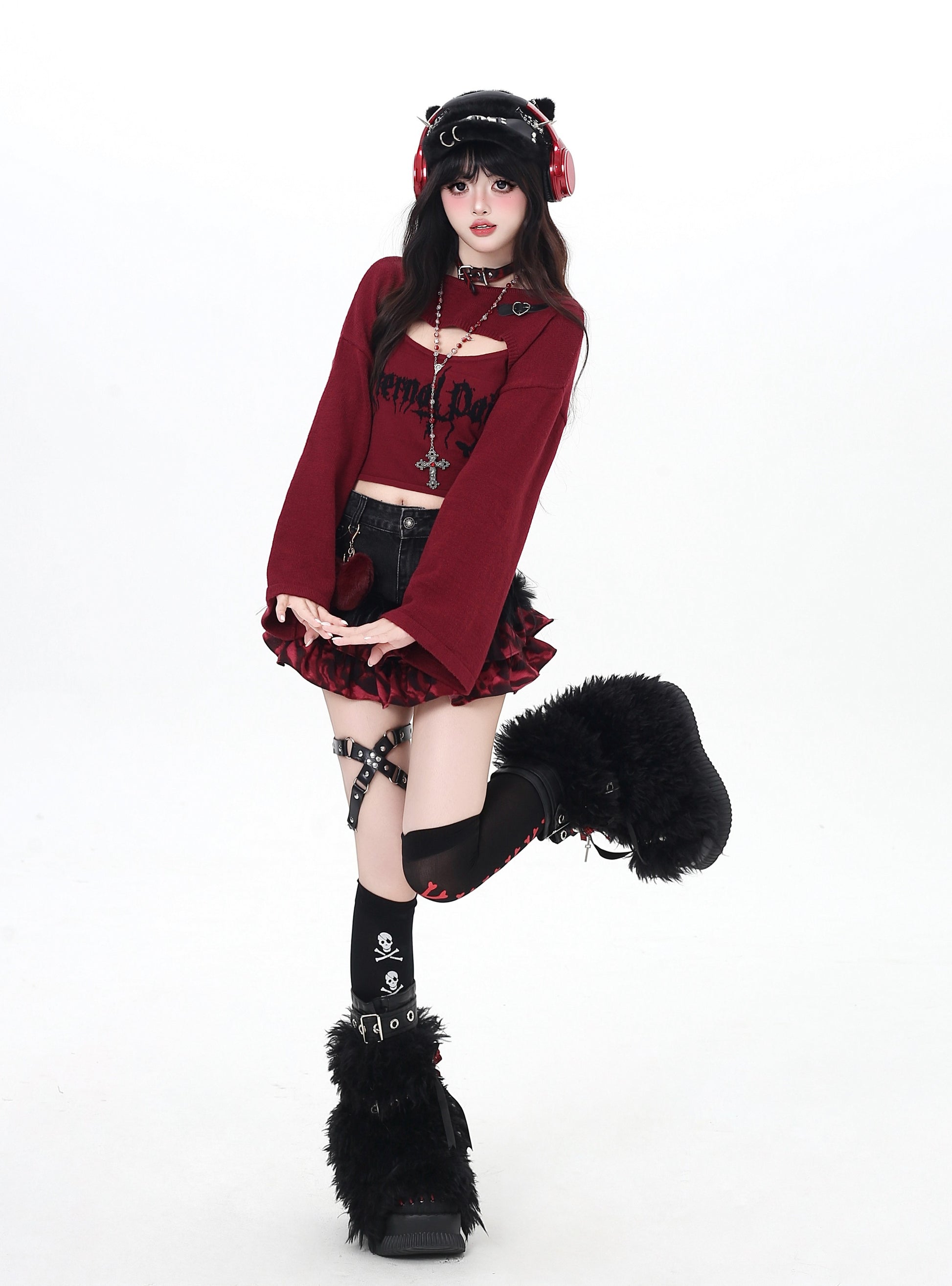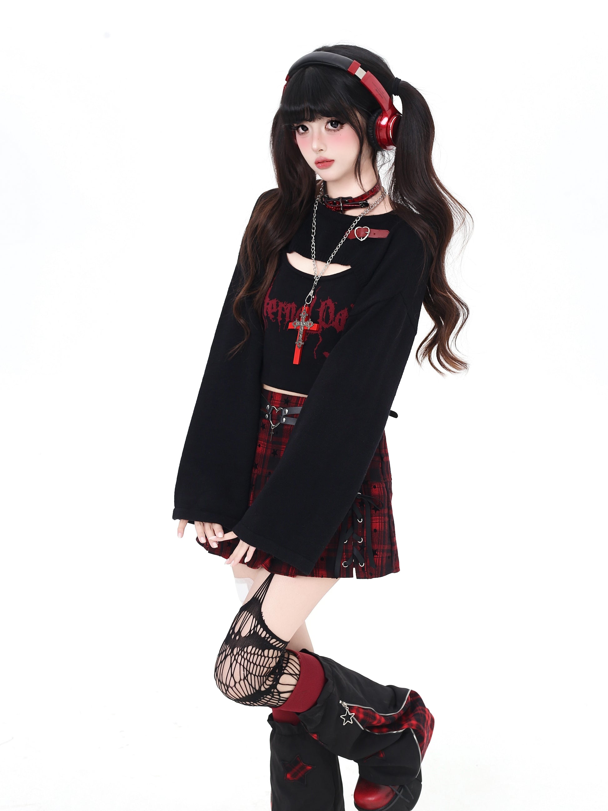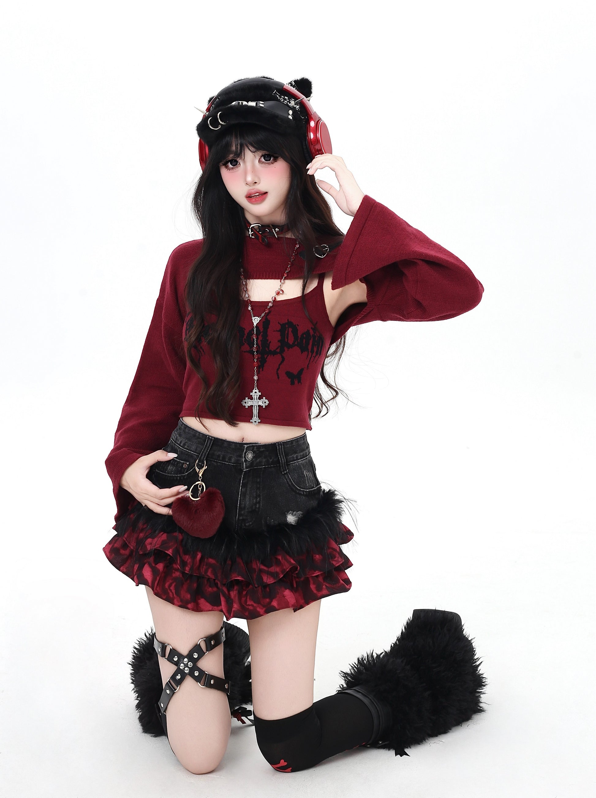 甘さとスパイスのバランスがかわいいレイヤード風ニット2点セットで、秋冬の長袖コーデはもちろん、地下アイドルのライブやチェキ会、参戦服としても使いやすいデザイン。アイドル衣装風のレイヤード感が、推し活でも日常でも映える万能アイテムです。