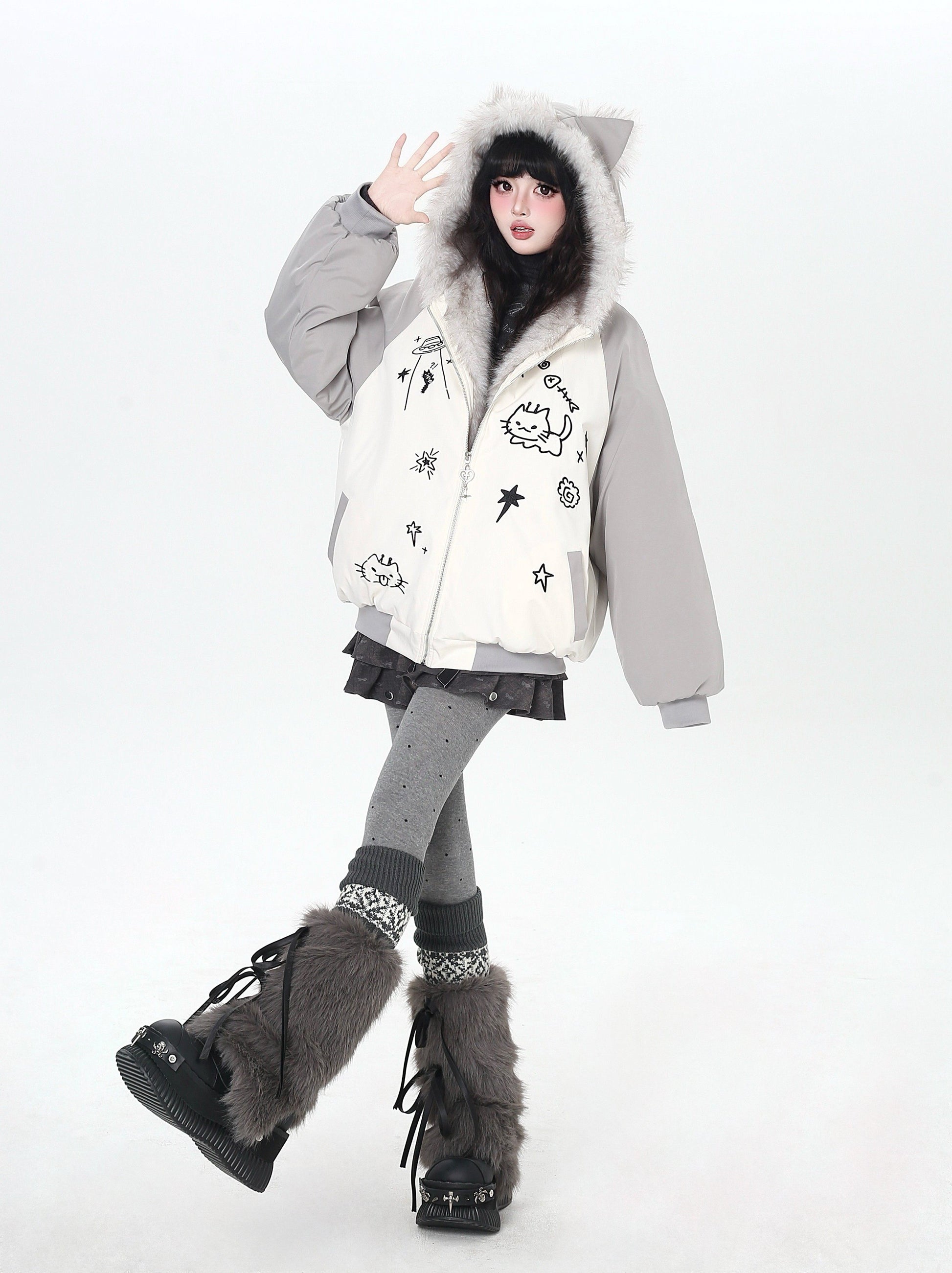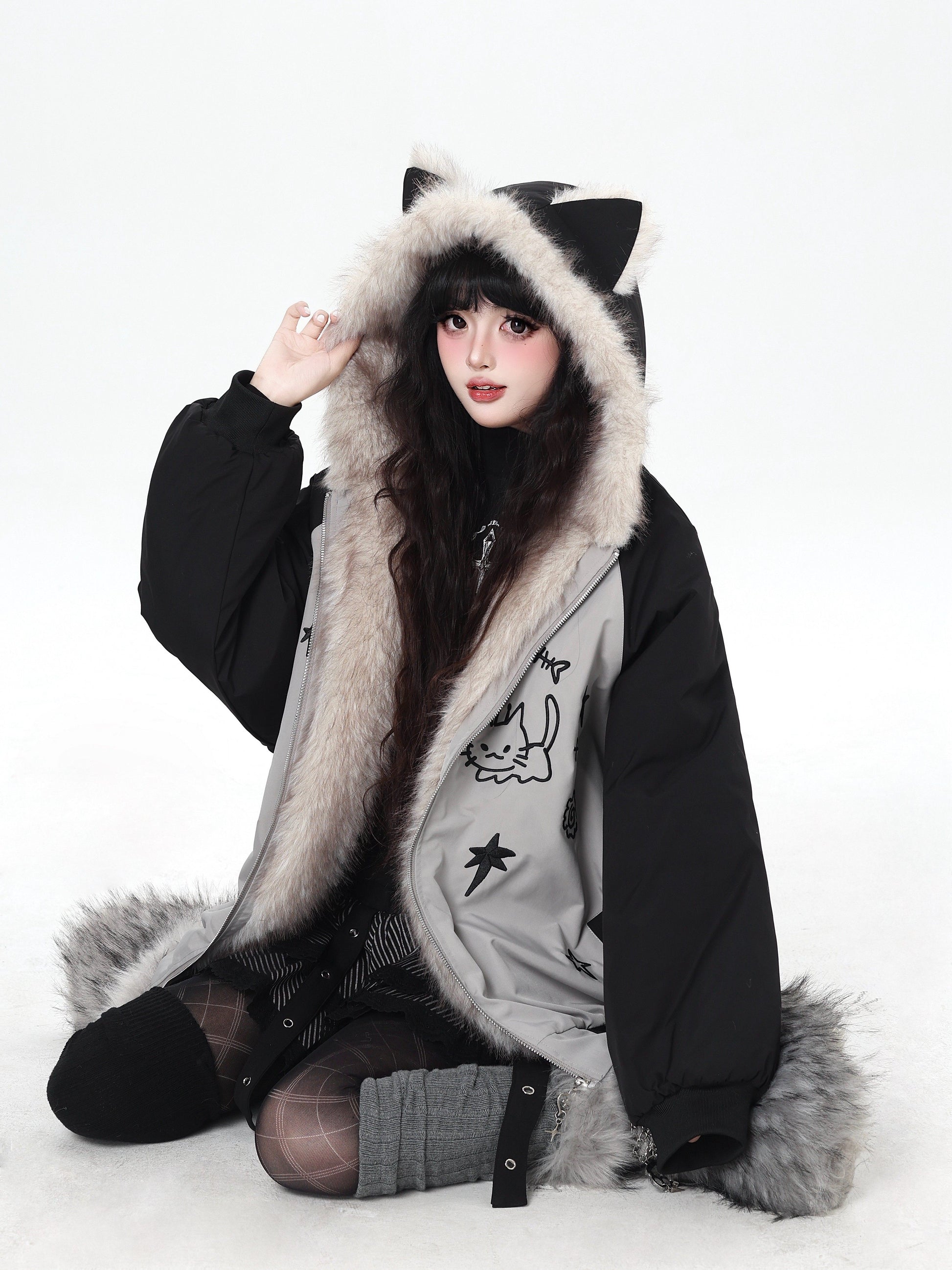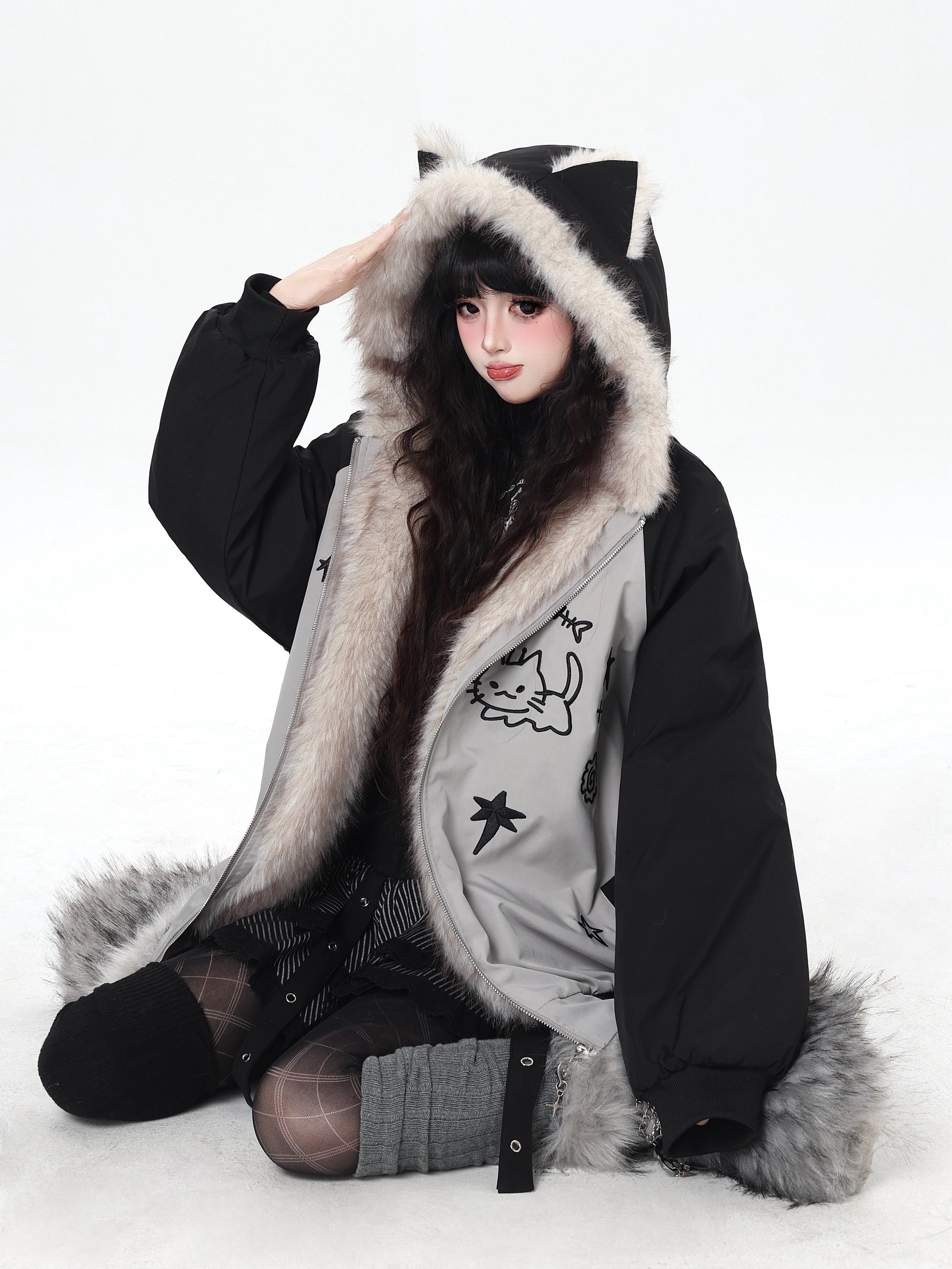 猫耳刺繍 ボリューム中綿アウター