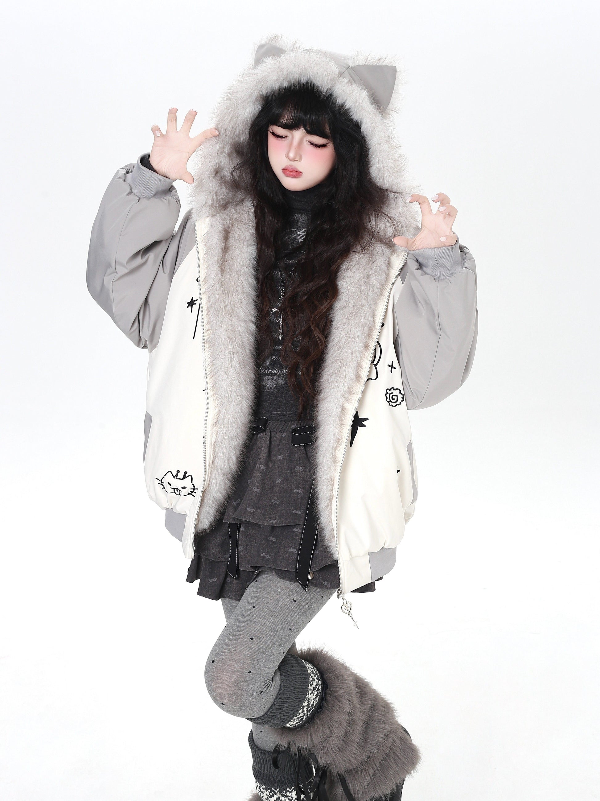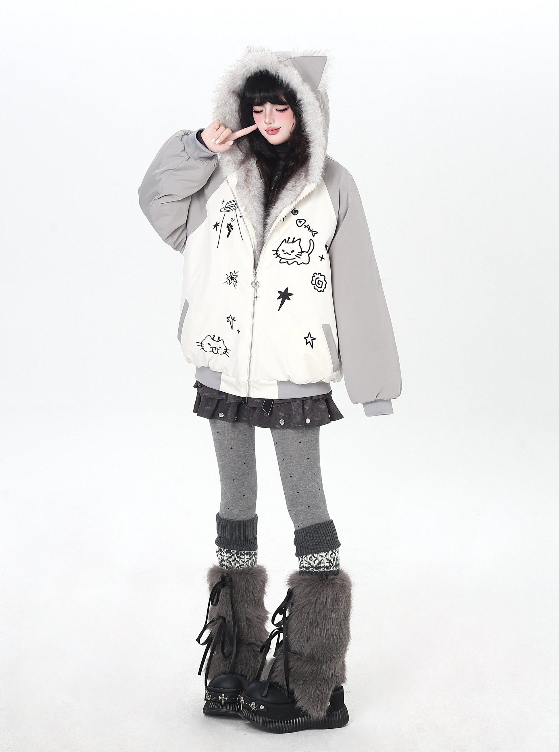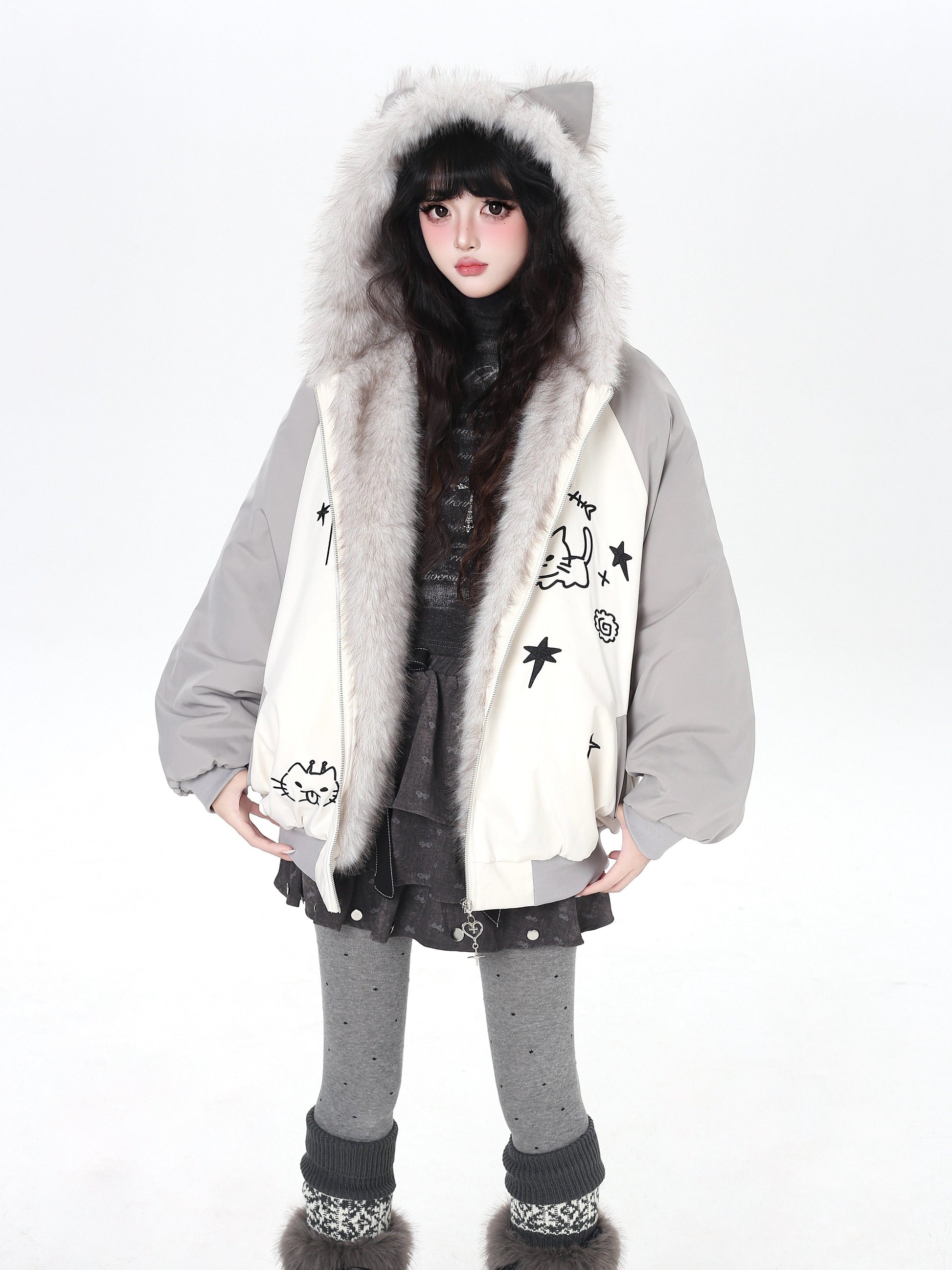 猫耳刺繍 ボリューム中綿アウター