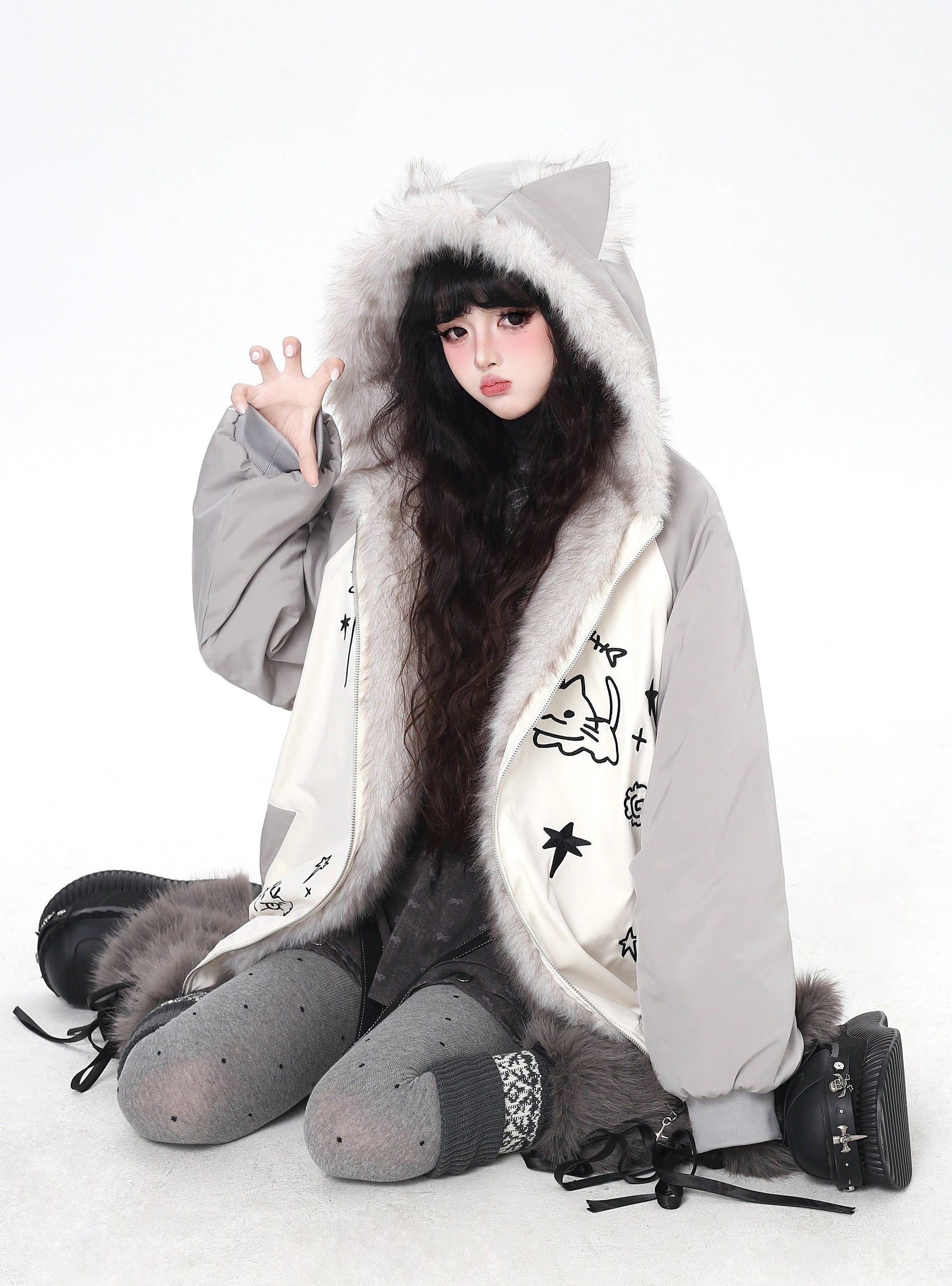 猫耳フード×繊細な猫刺繍。