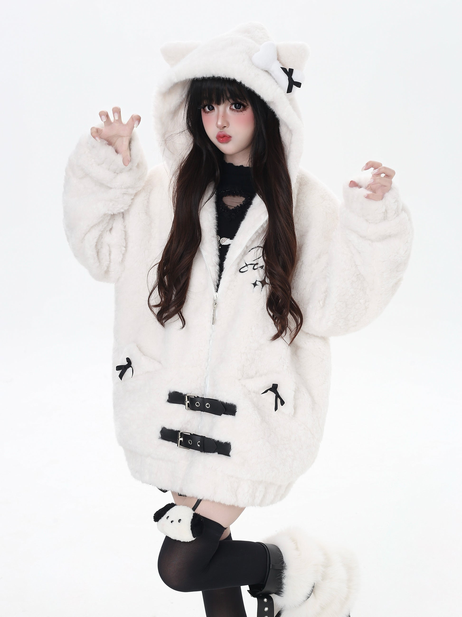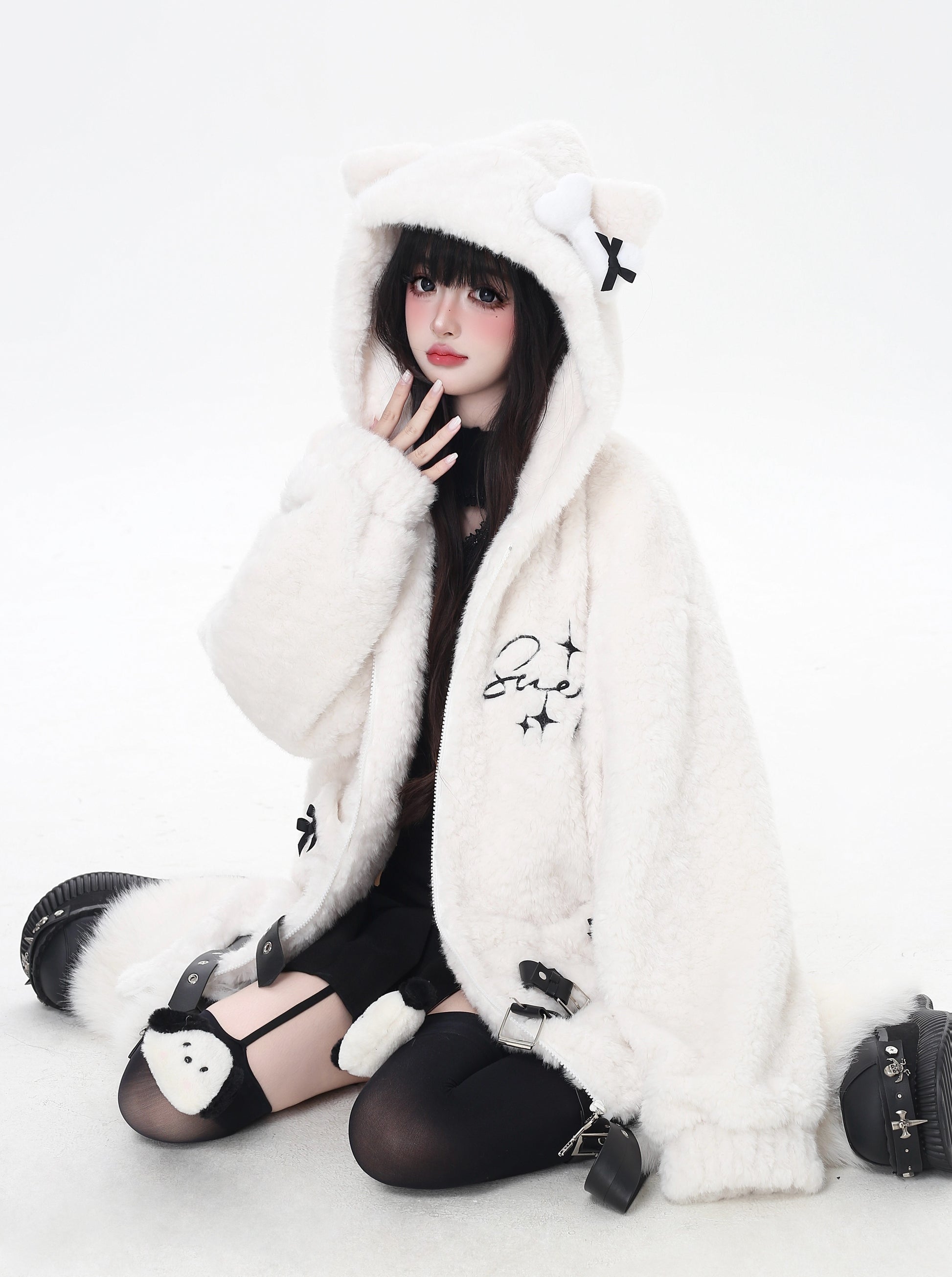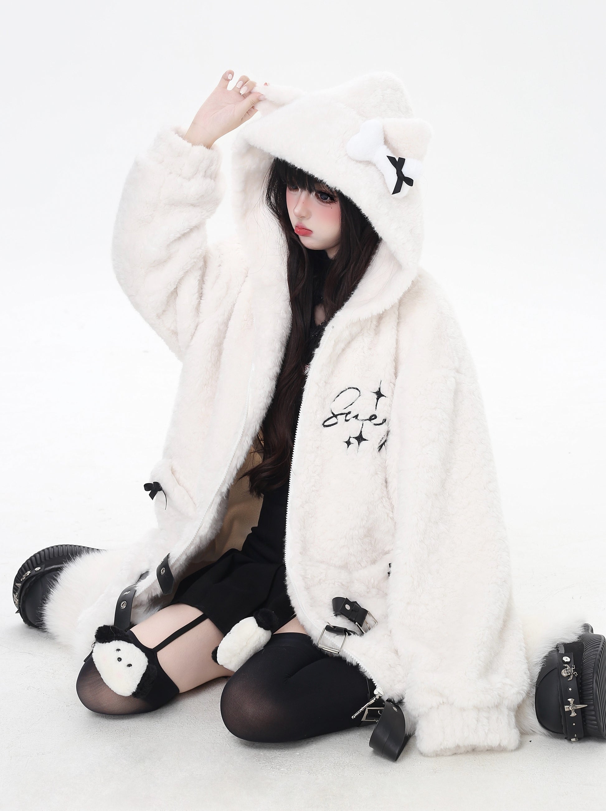 刺繍ねこ耳フード付き厚手ボアジャケット