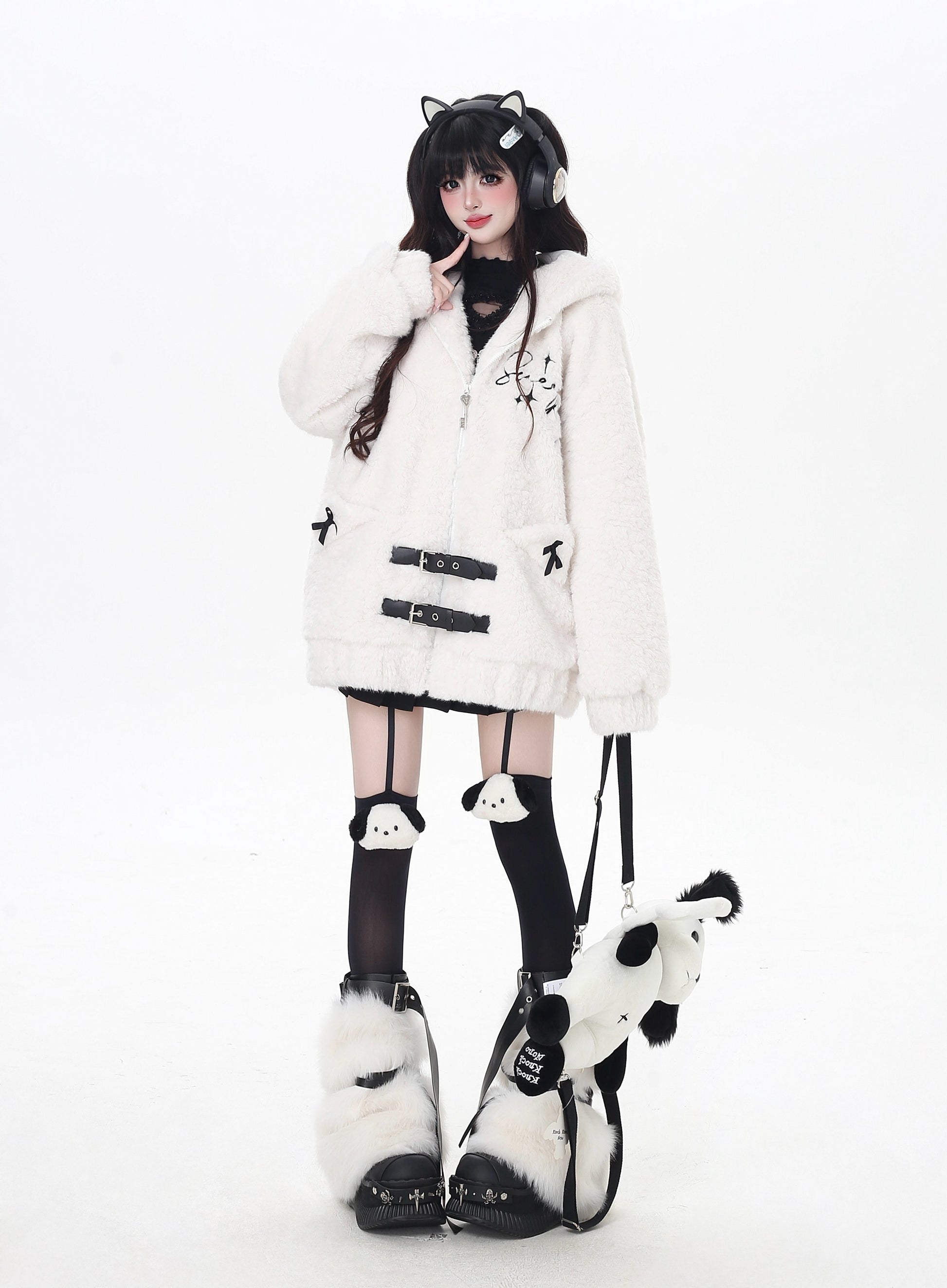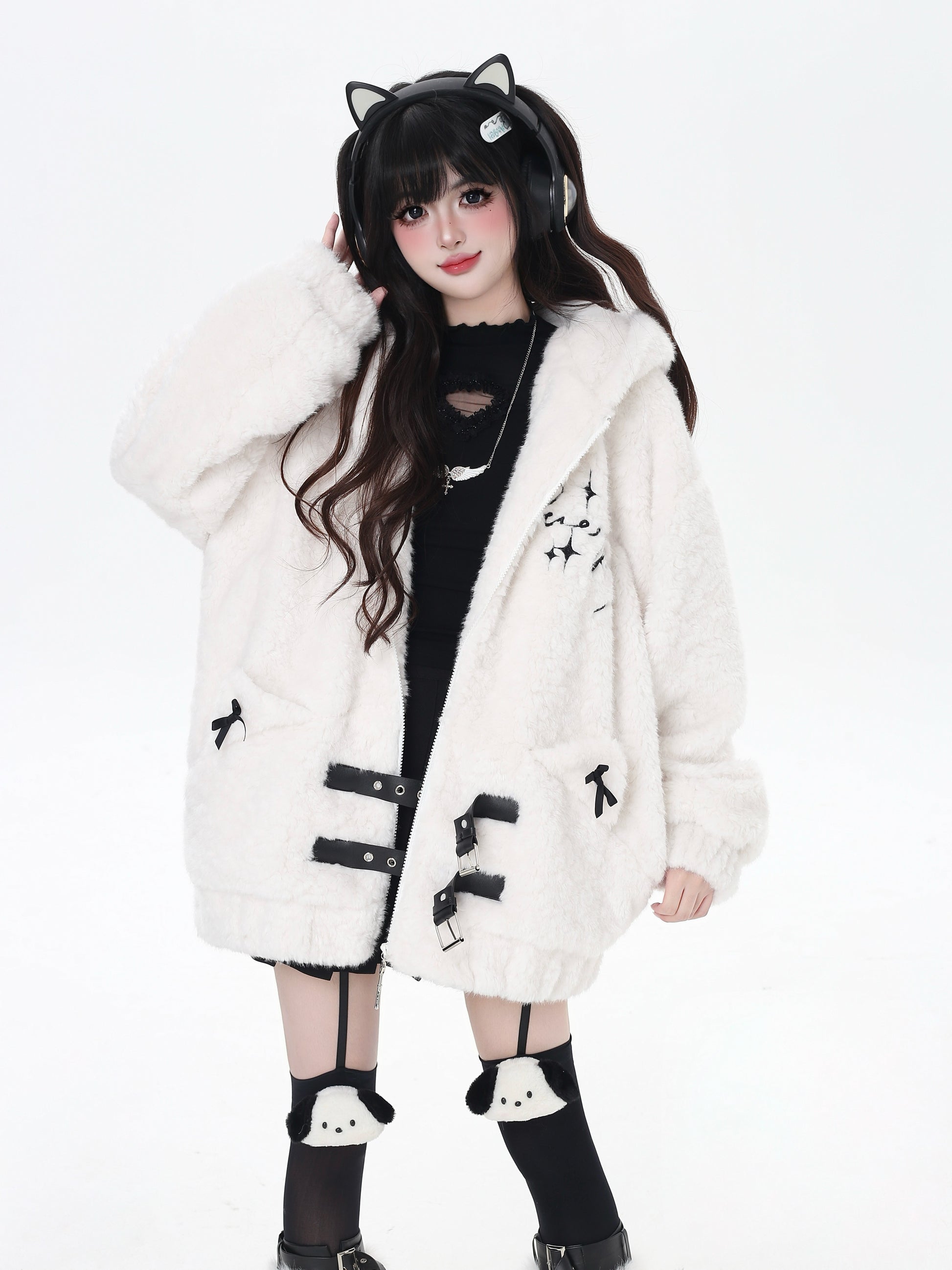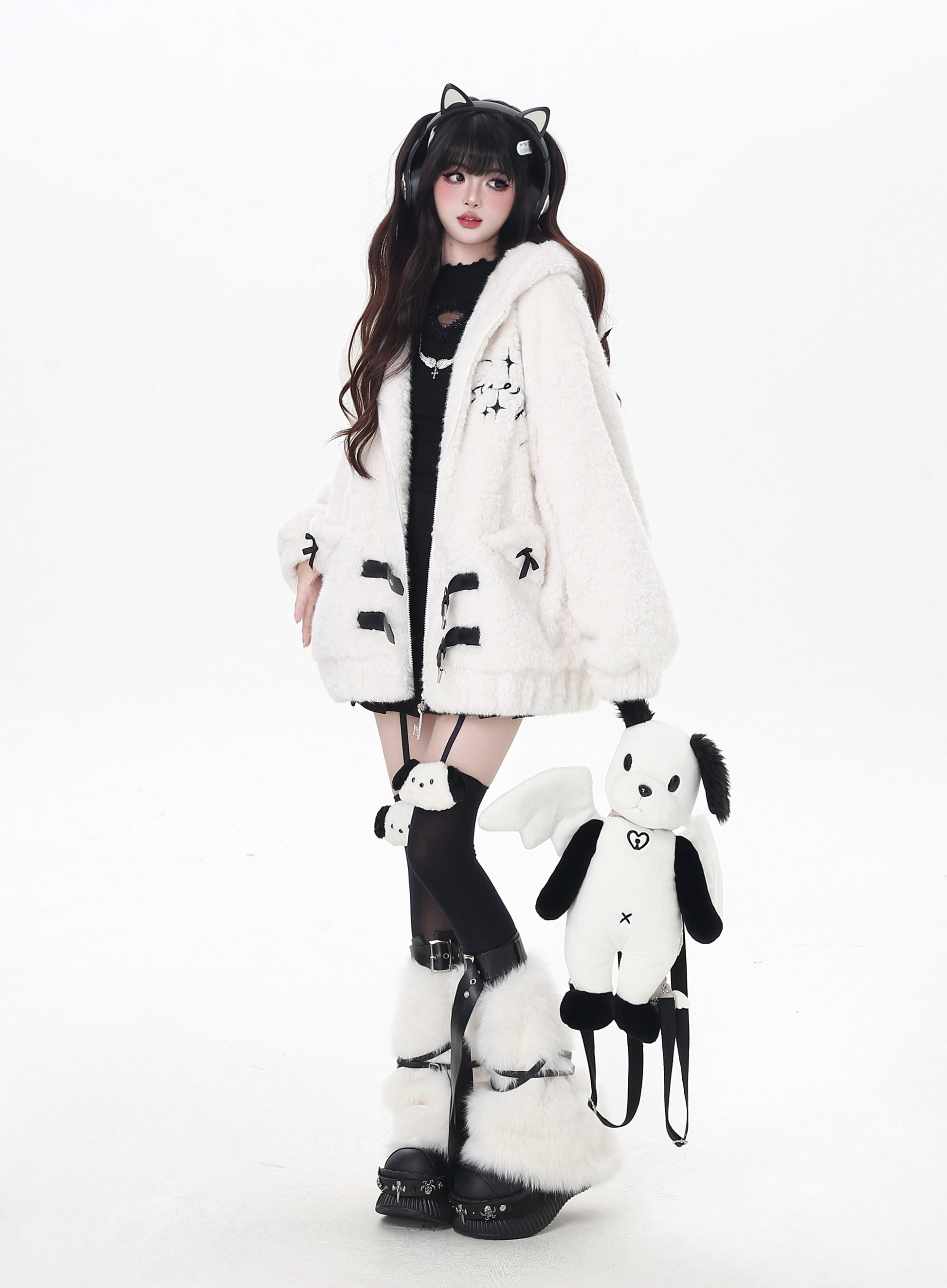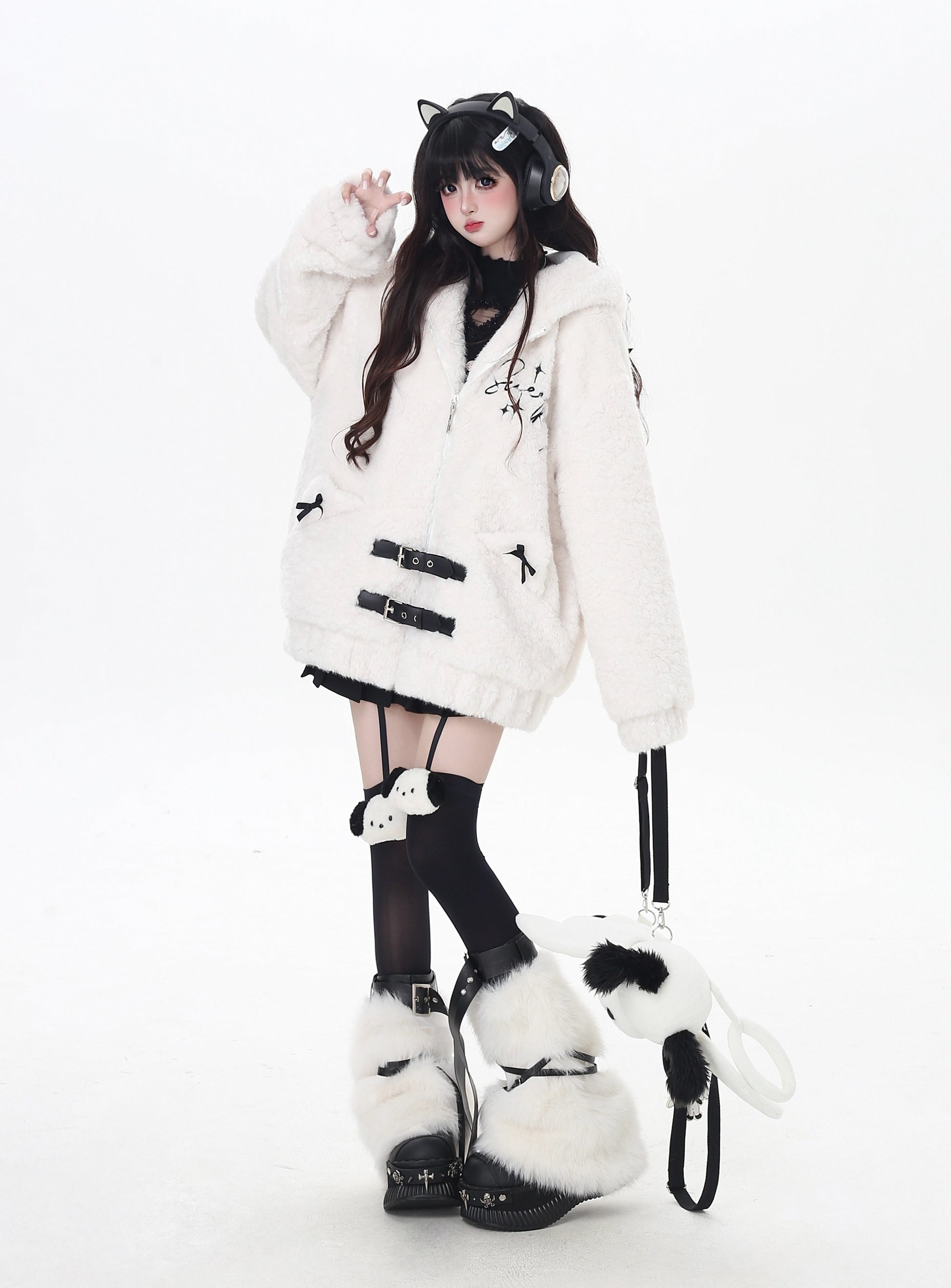 刺繍ねこ耳フード付き厚手ボアジャケット