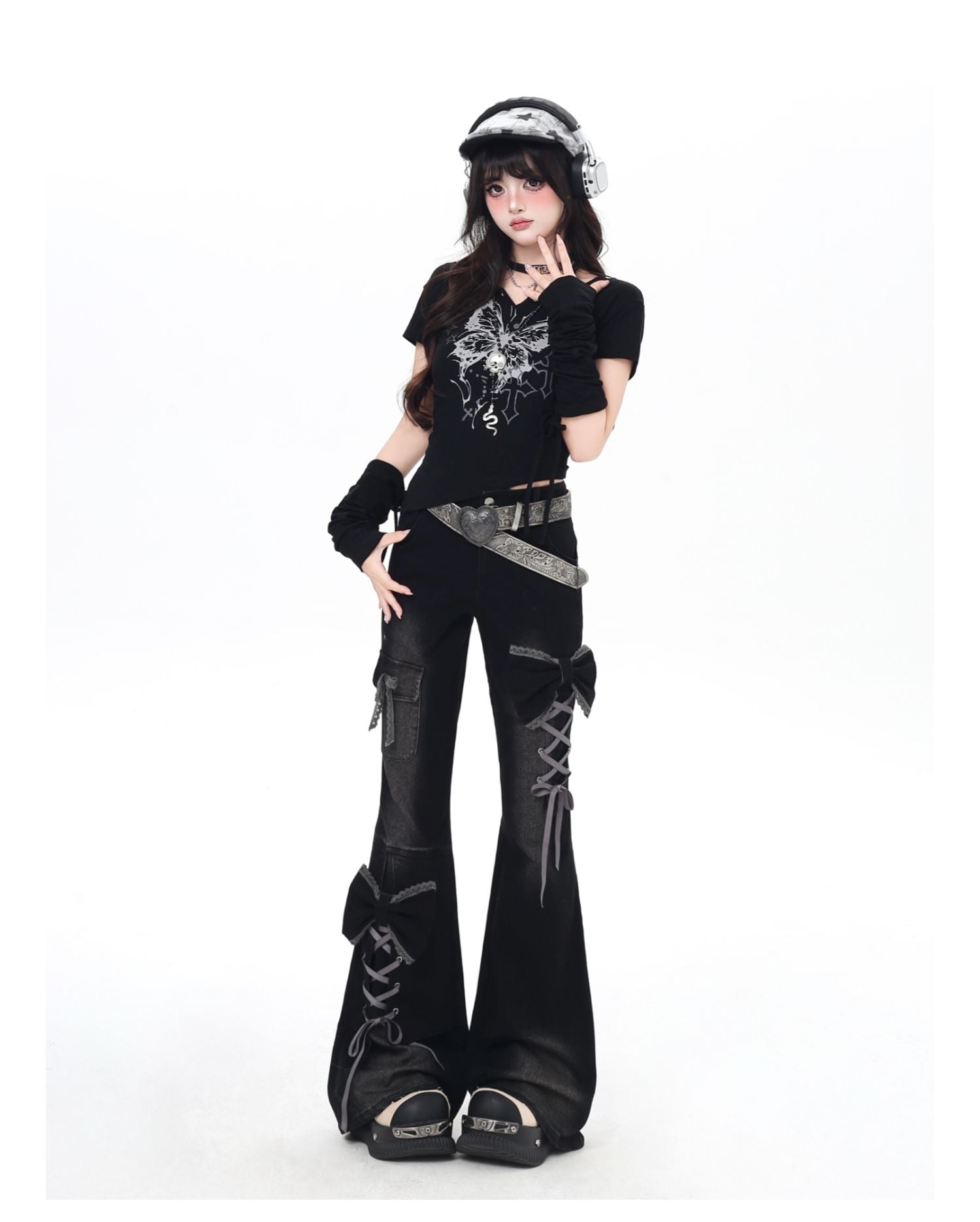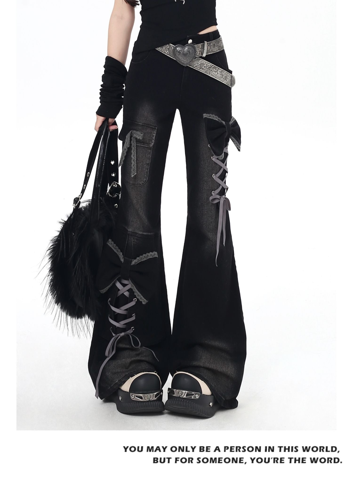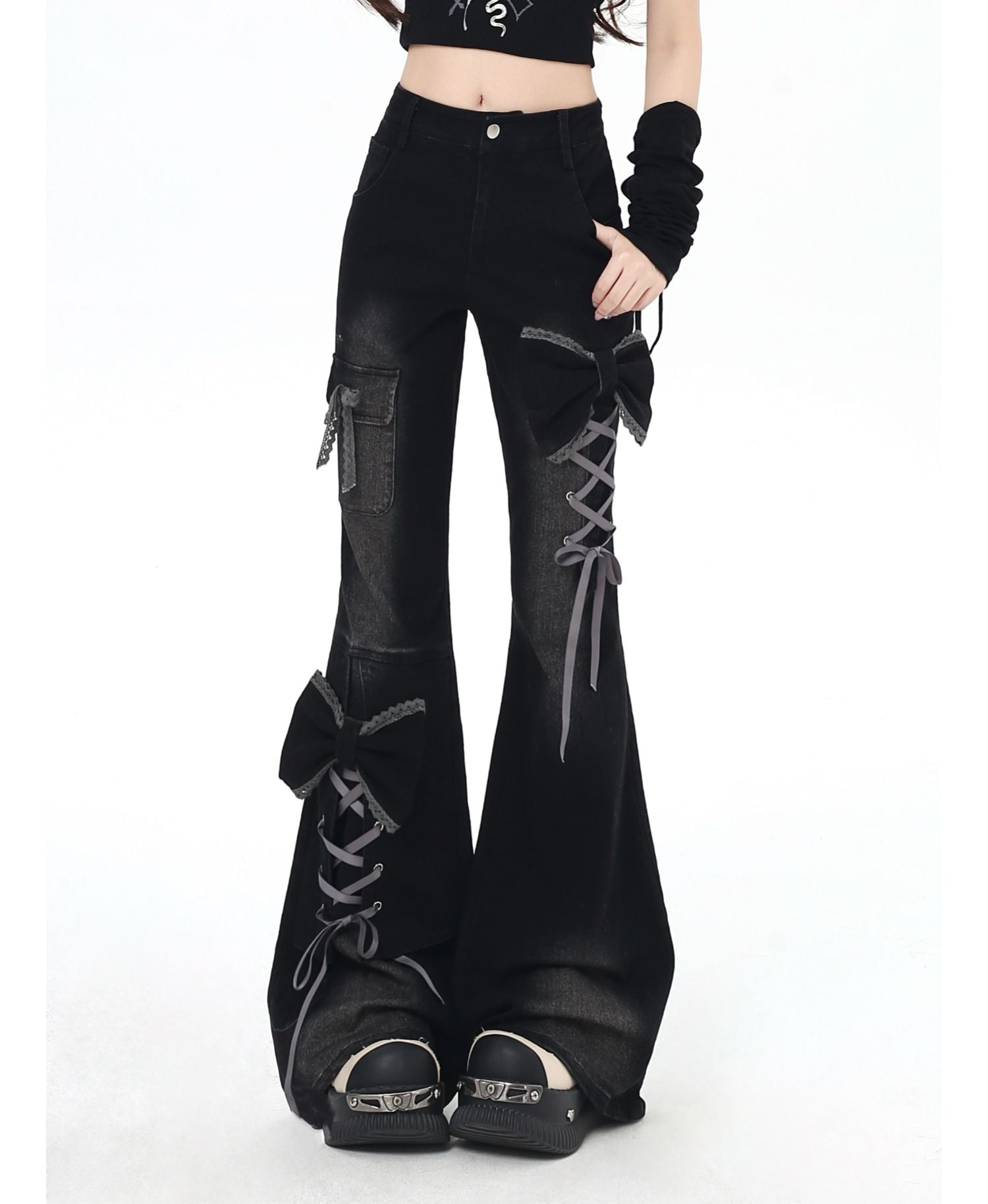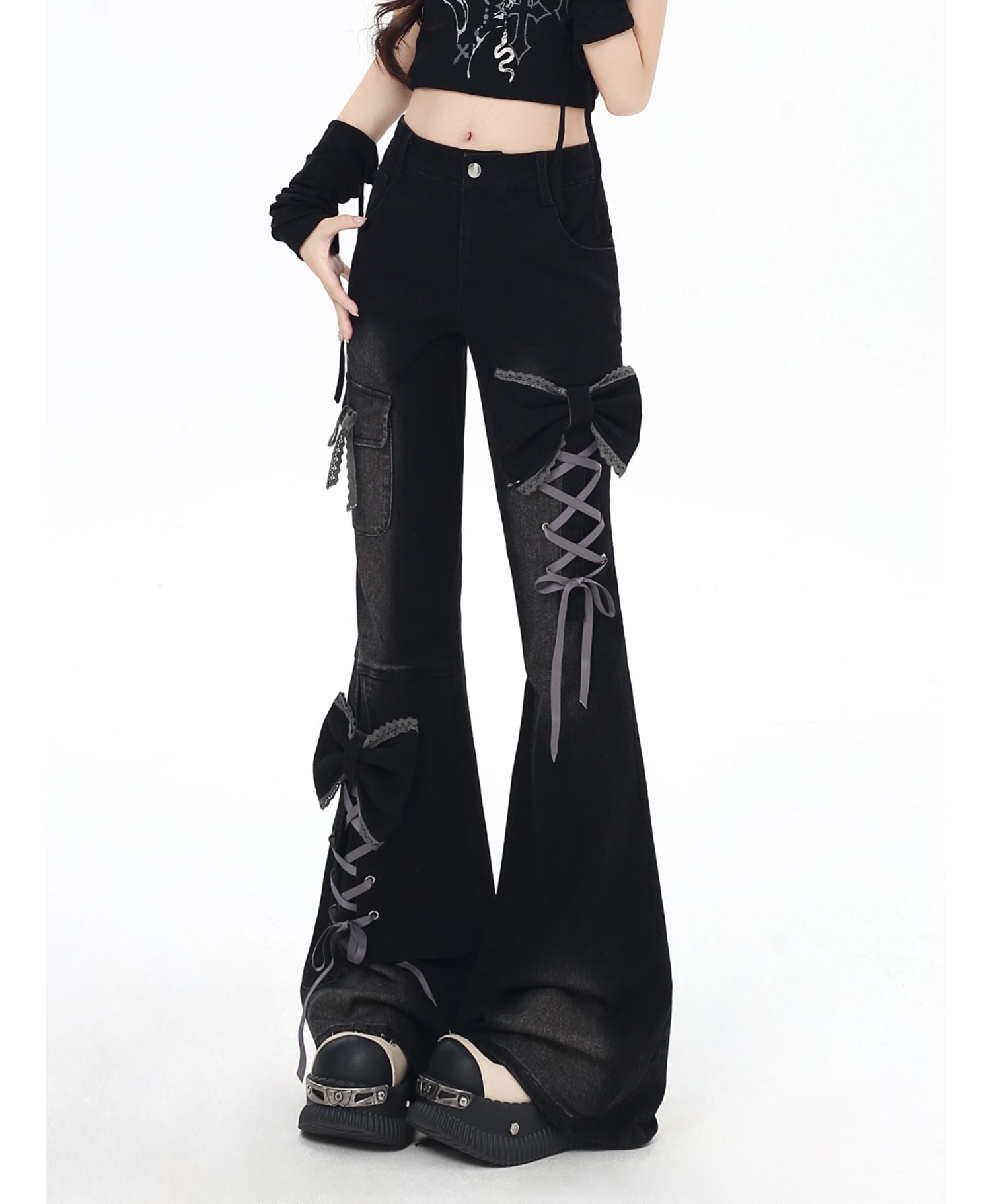 立体リボンが可愛いY2K風ハイウエストフレアデニム。脚長&スタイルアップ効果抜群で、甘辛ミックスコーデにぴったりの1本です。カジュアルからお出かけまで幅広く活躍♡