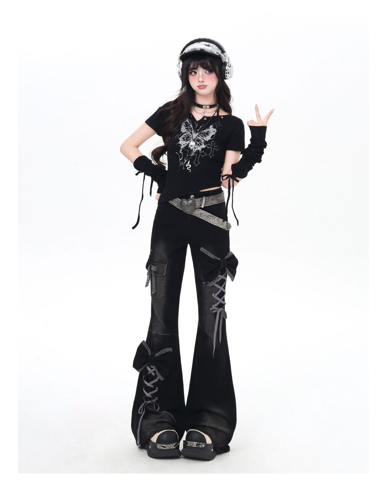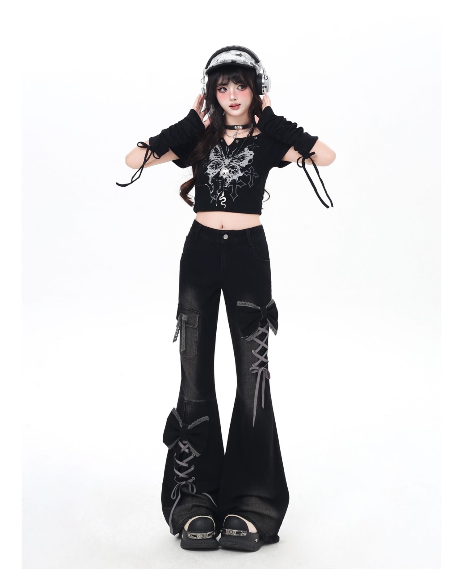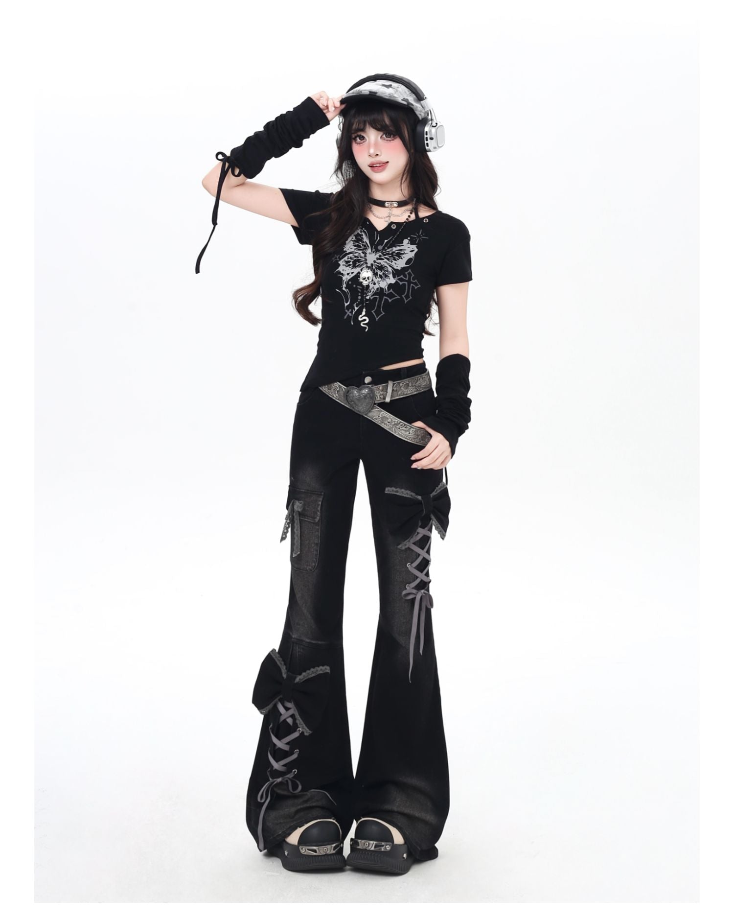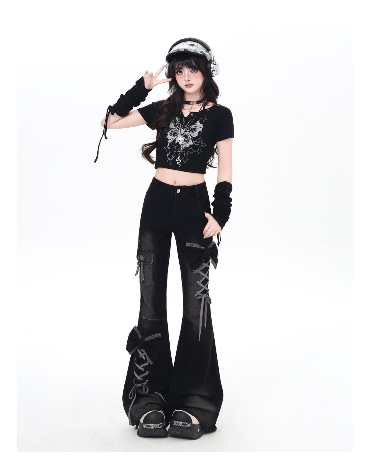 立体リボンが可愛いY2K風ハイウエストフレアデニム。脚長&スタイルアップ効果抜群で、甘辛ミックスコーデにぴったりの1本です。カジュアルからお出かけまで幅広く活躍♡