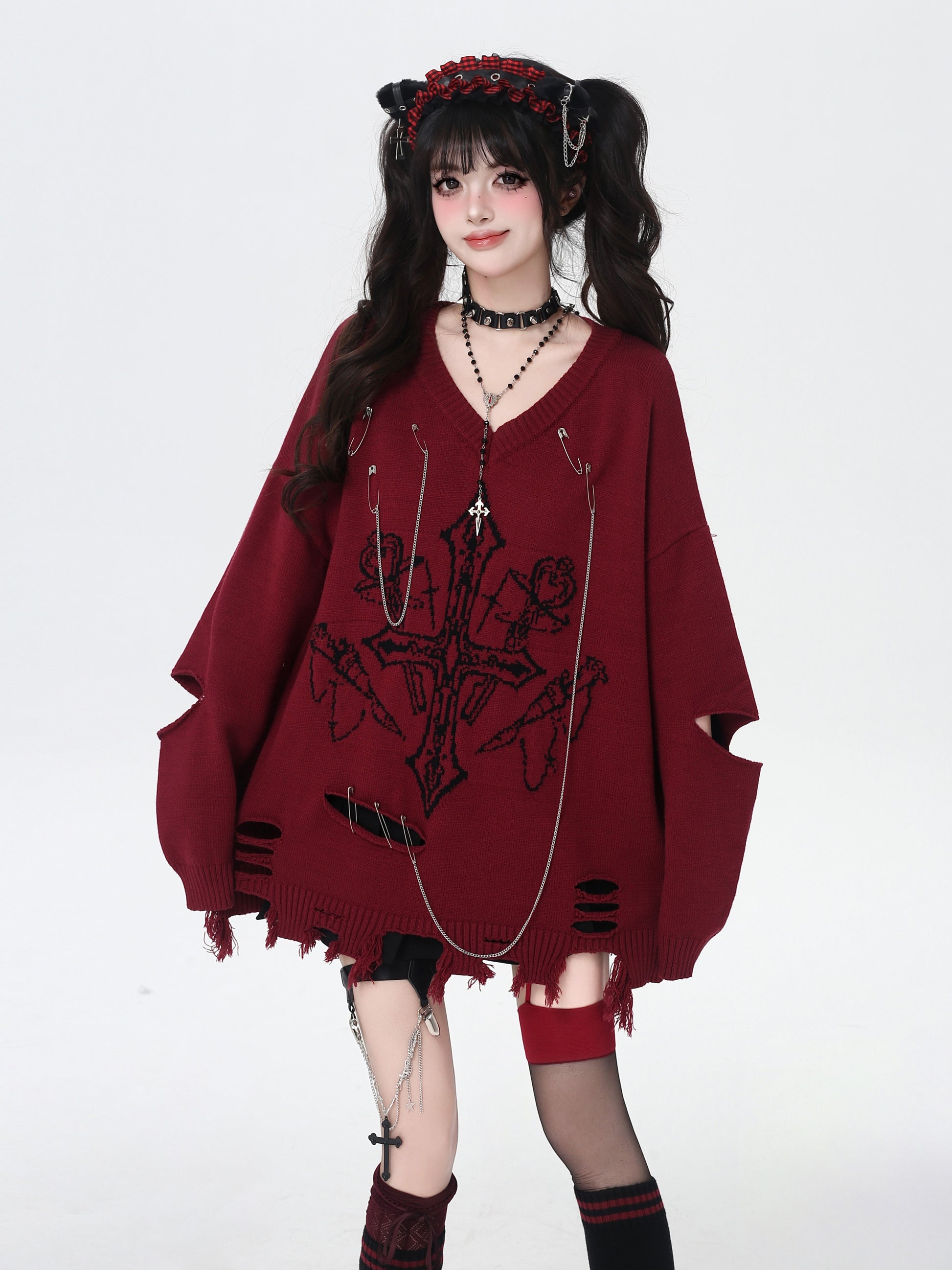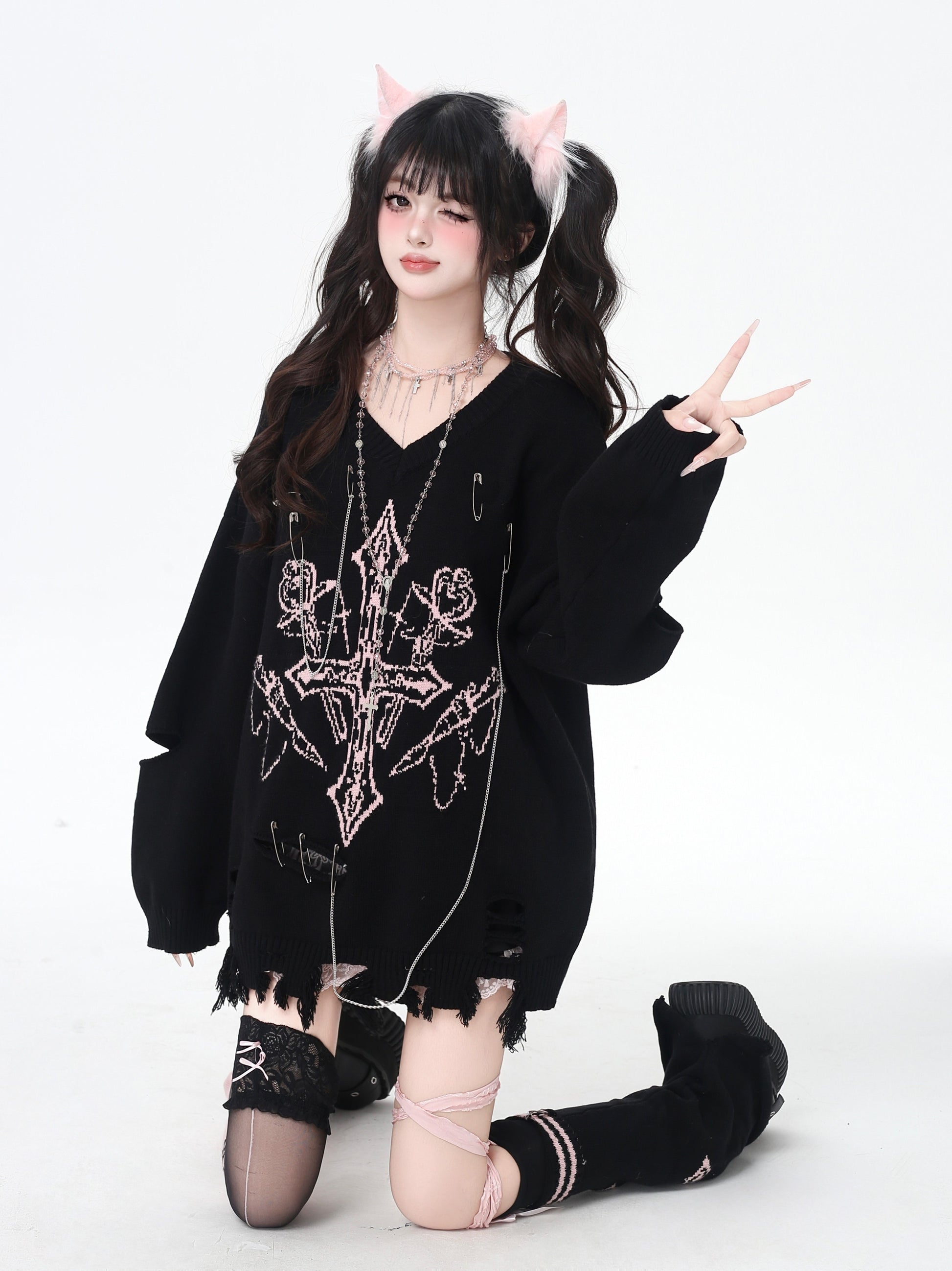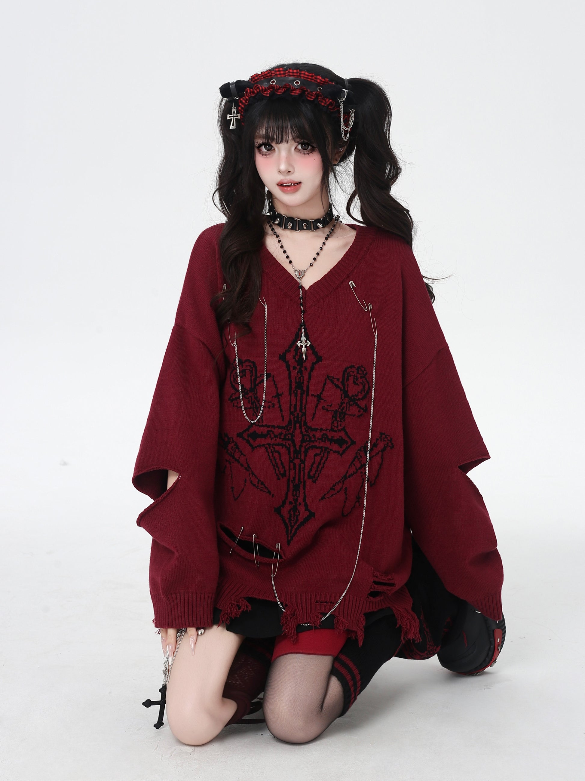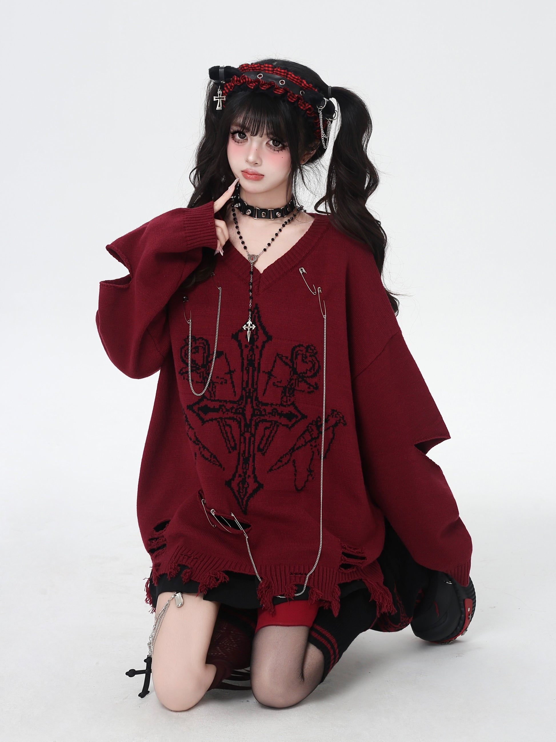 ゴシック×軽ヤンキー風のVネックニット。破れデザインとチェーン装飾で小さなこだわりをプラス。ゆったりシルエットで秋冬の重ね着にもぴったり。