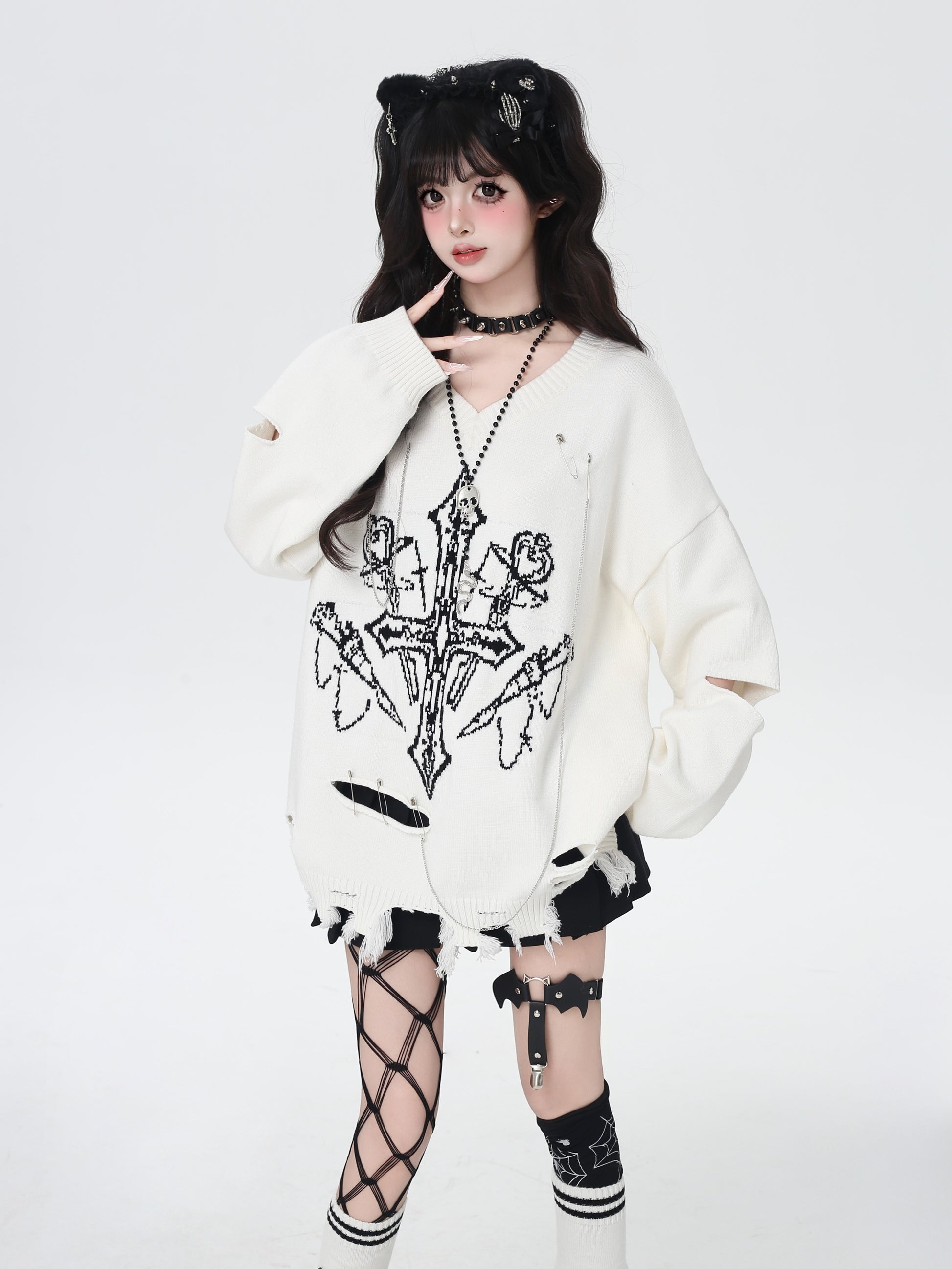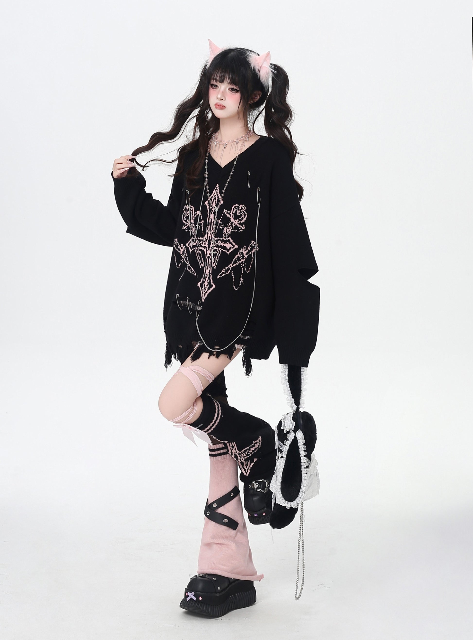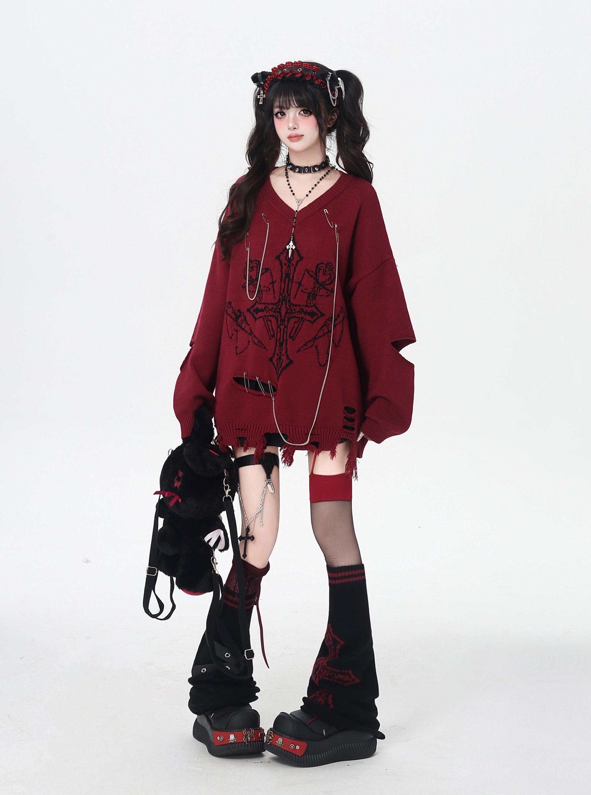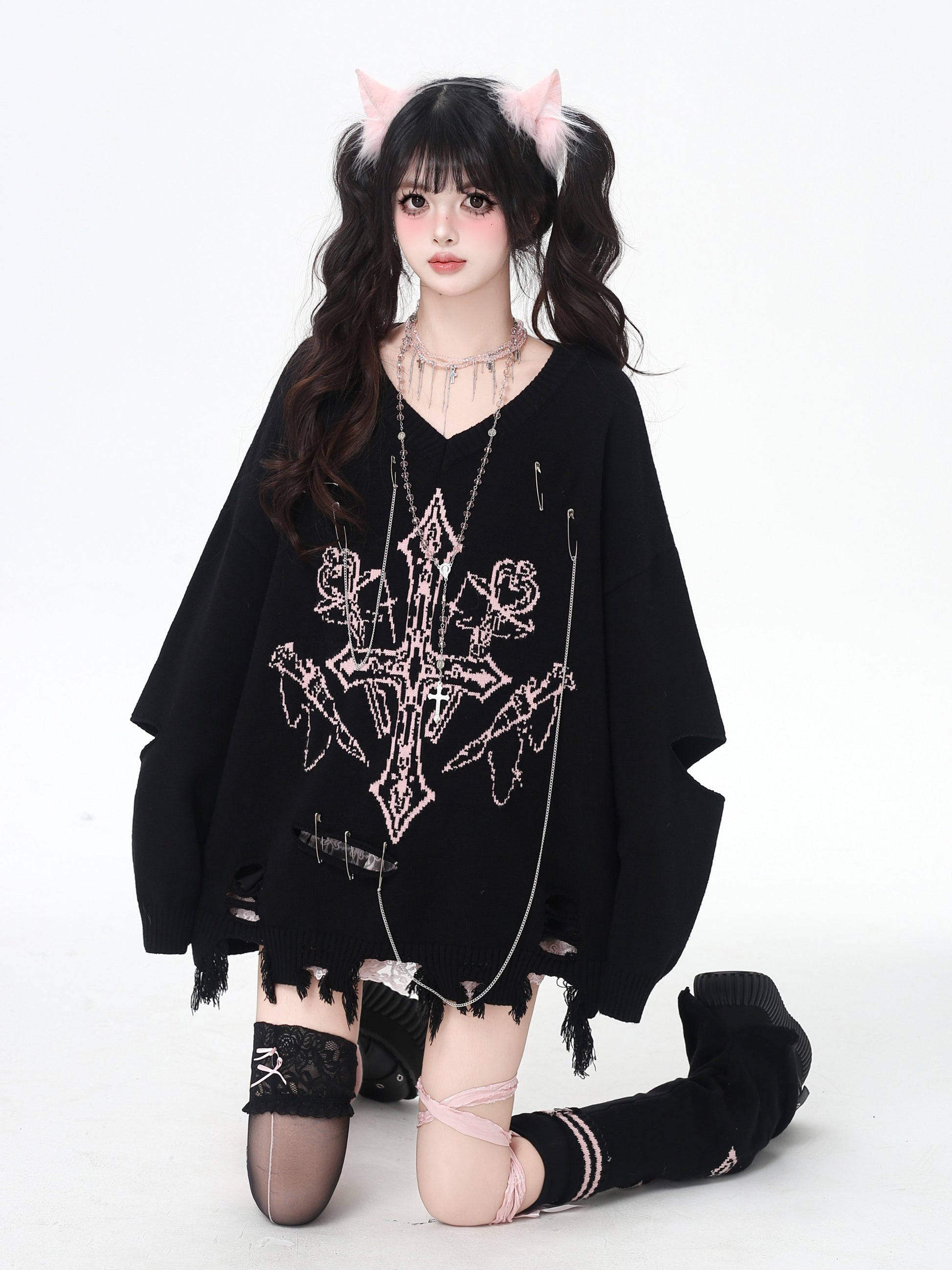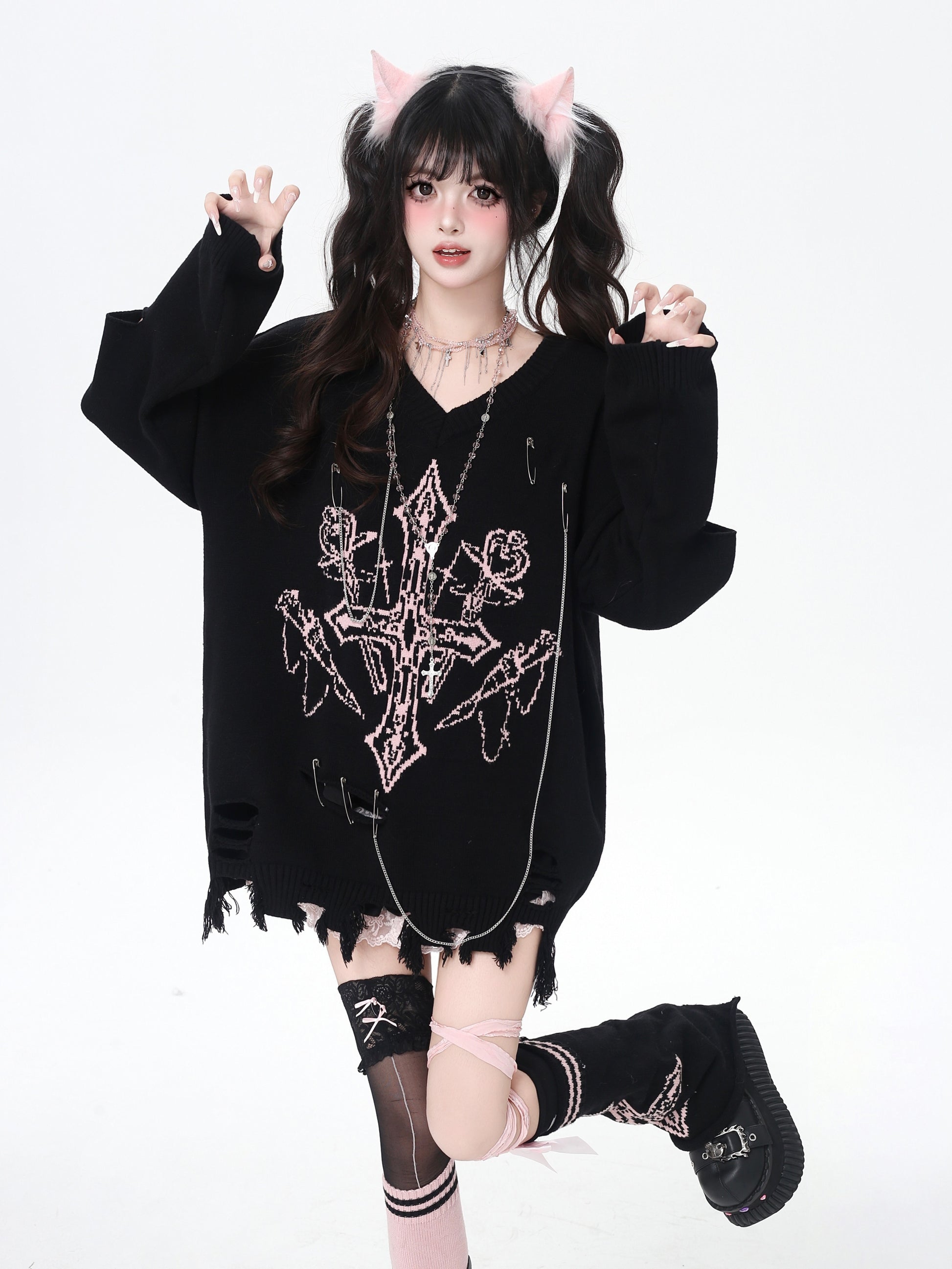 ゴシック×軽ヤンキー風のVネックニット。破れデザインとチェーン装飾で小さなこだわりをプラス。ゆったりシルエットで秋冬の重ね着にもぴったり。