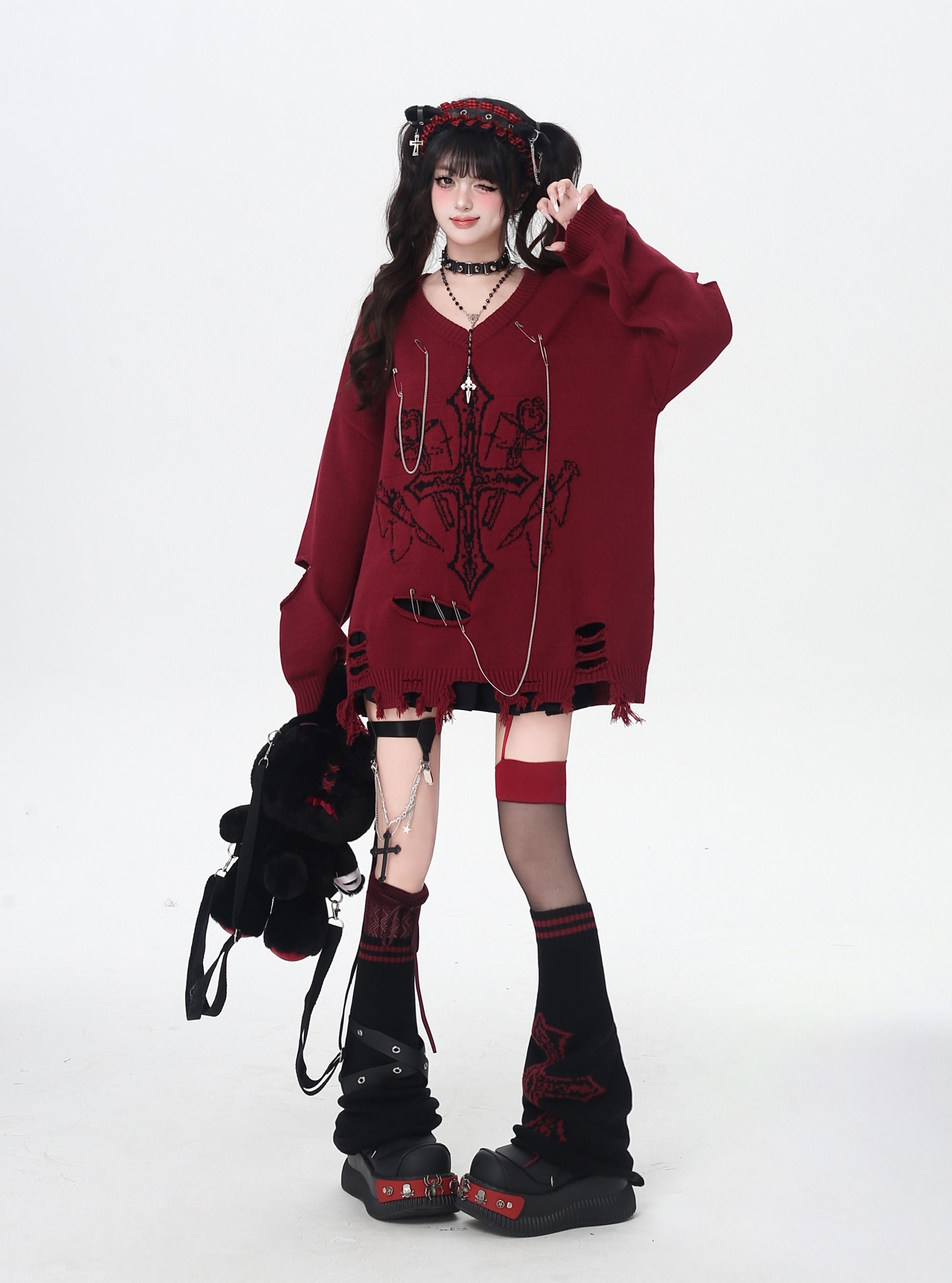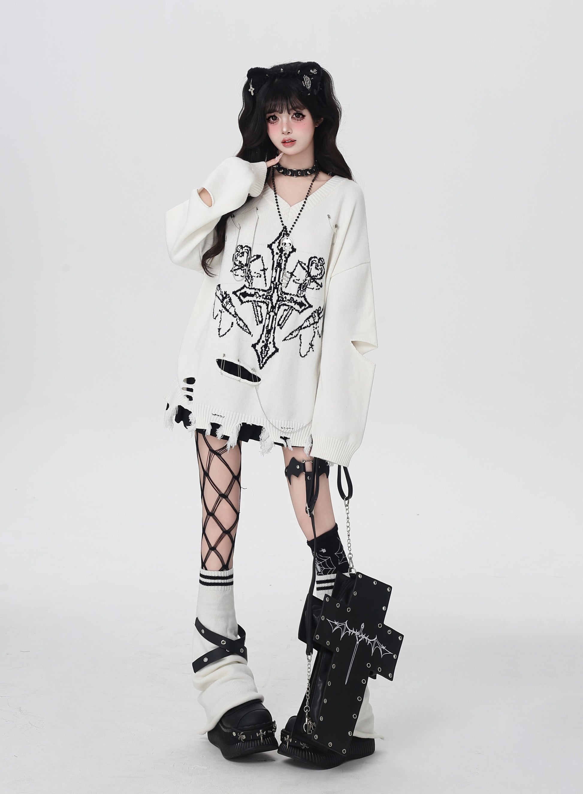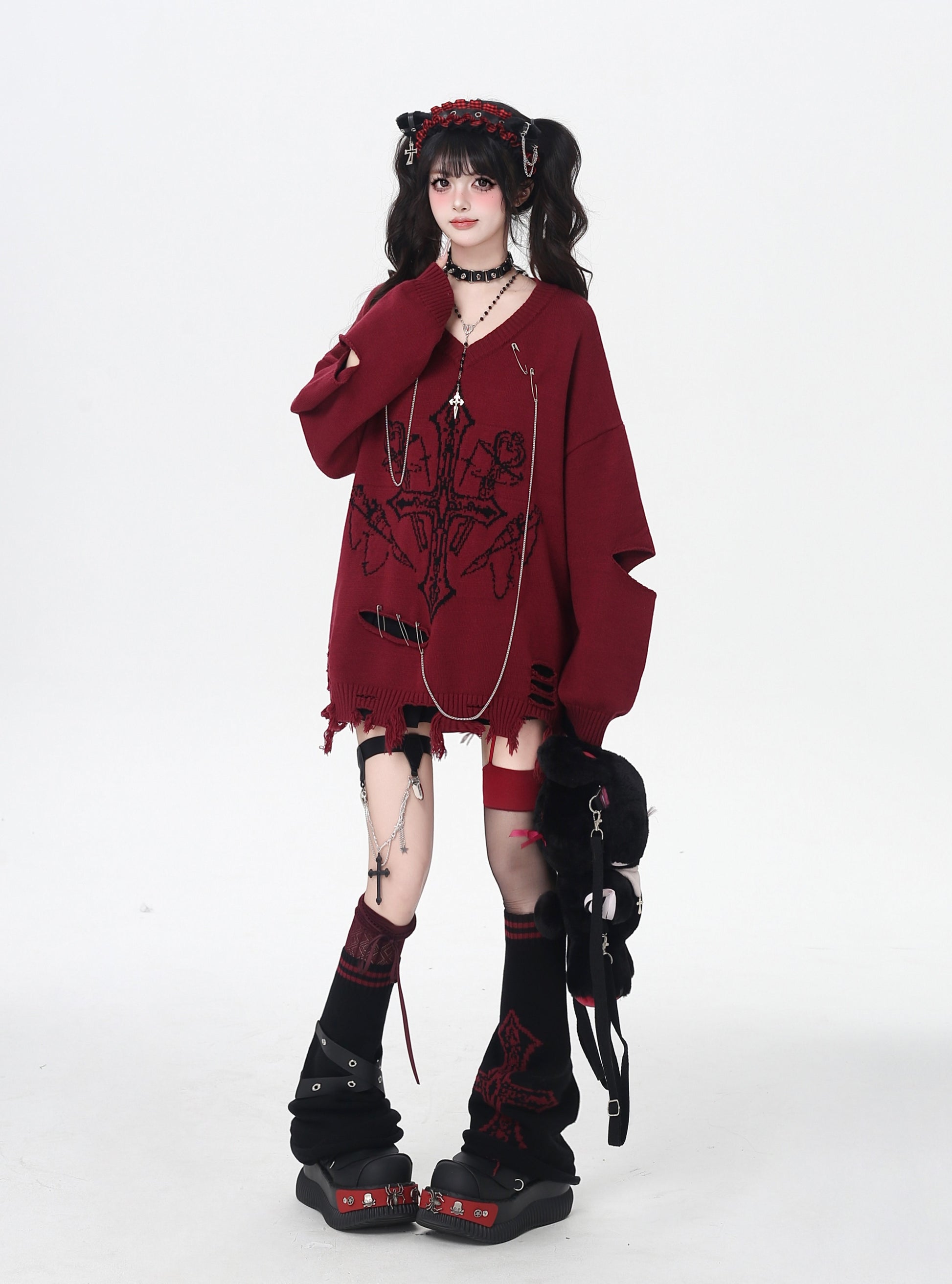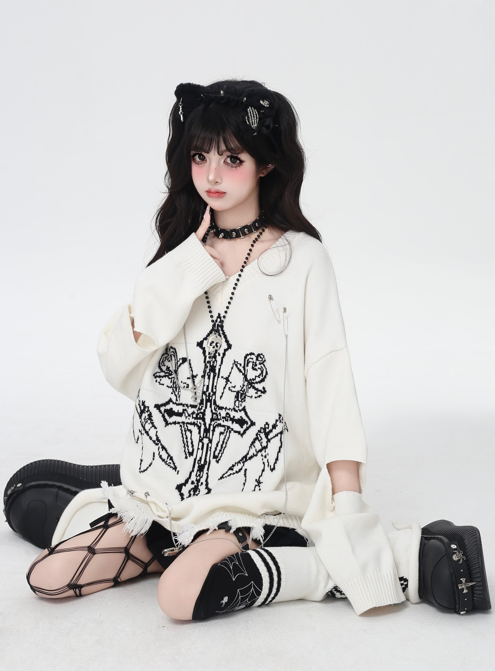 ゴシック×軽ヤンキー風のVネックニット。破れデザインとチェーン装飾で小さなこだわりをプラス。ゆったりシルエットで秋冬の重ね着にもぴったり。