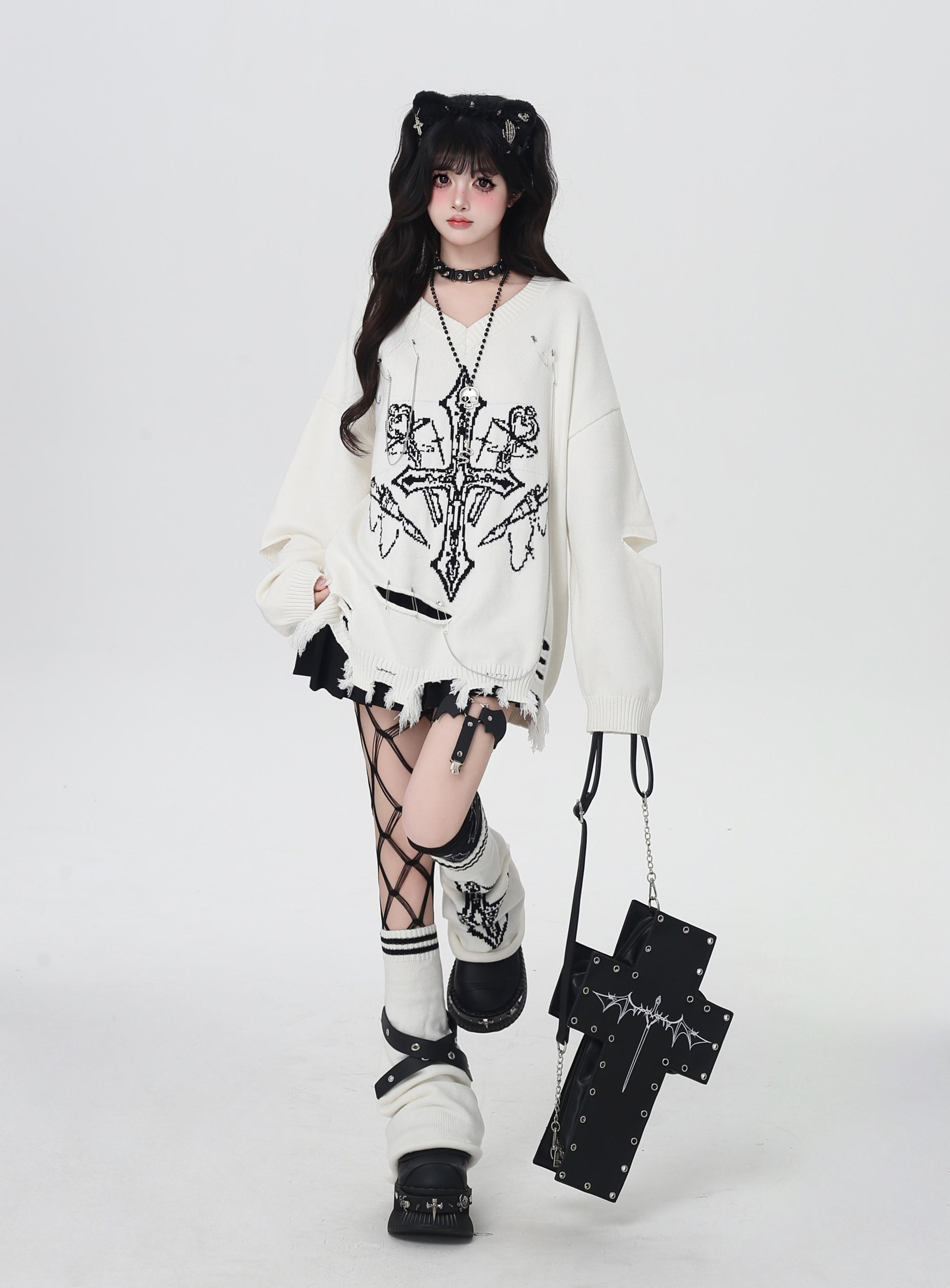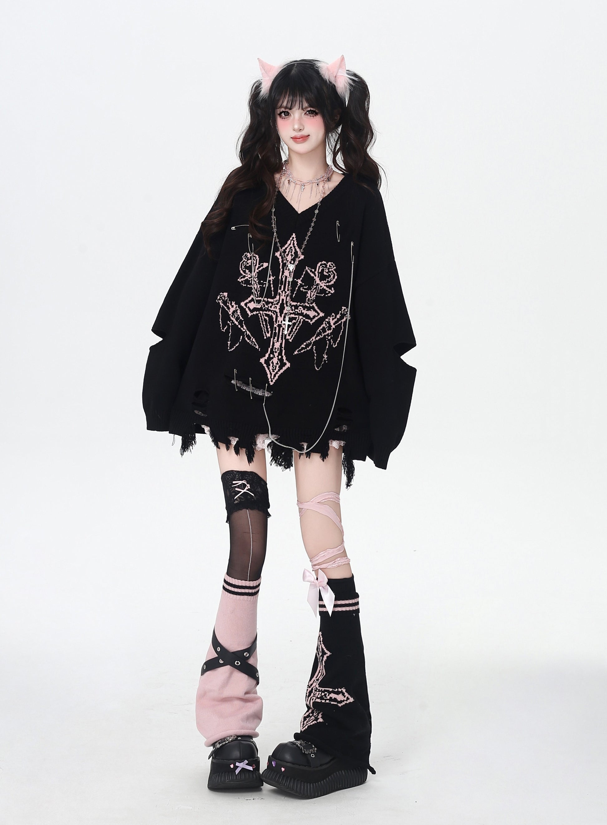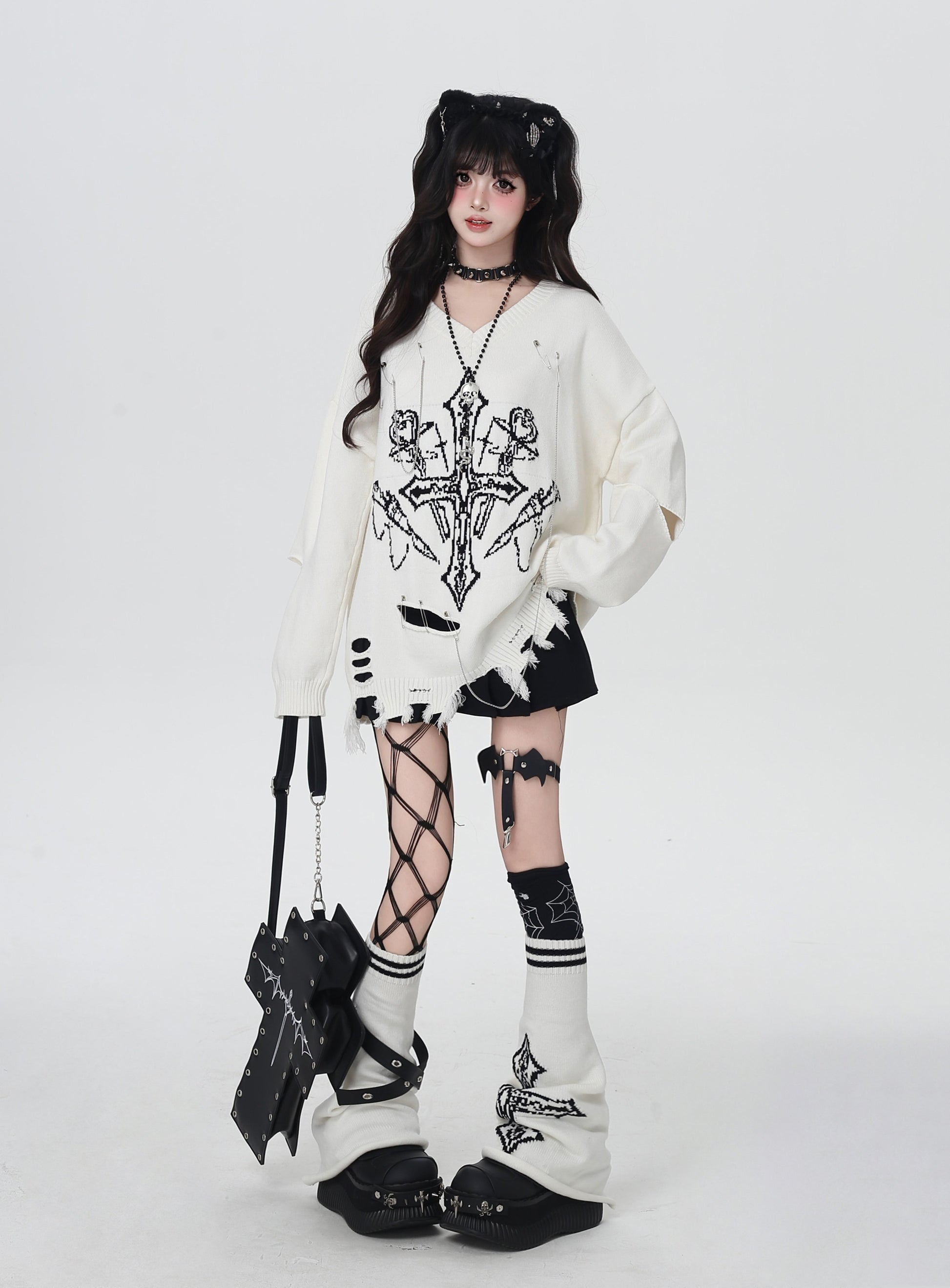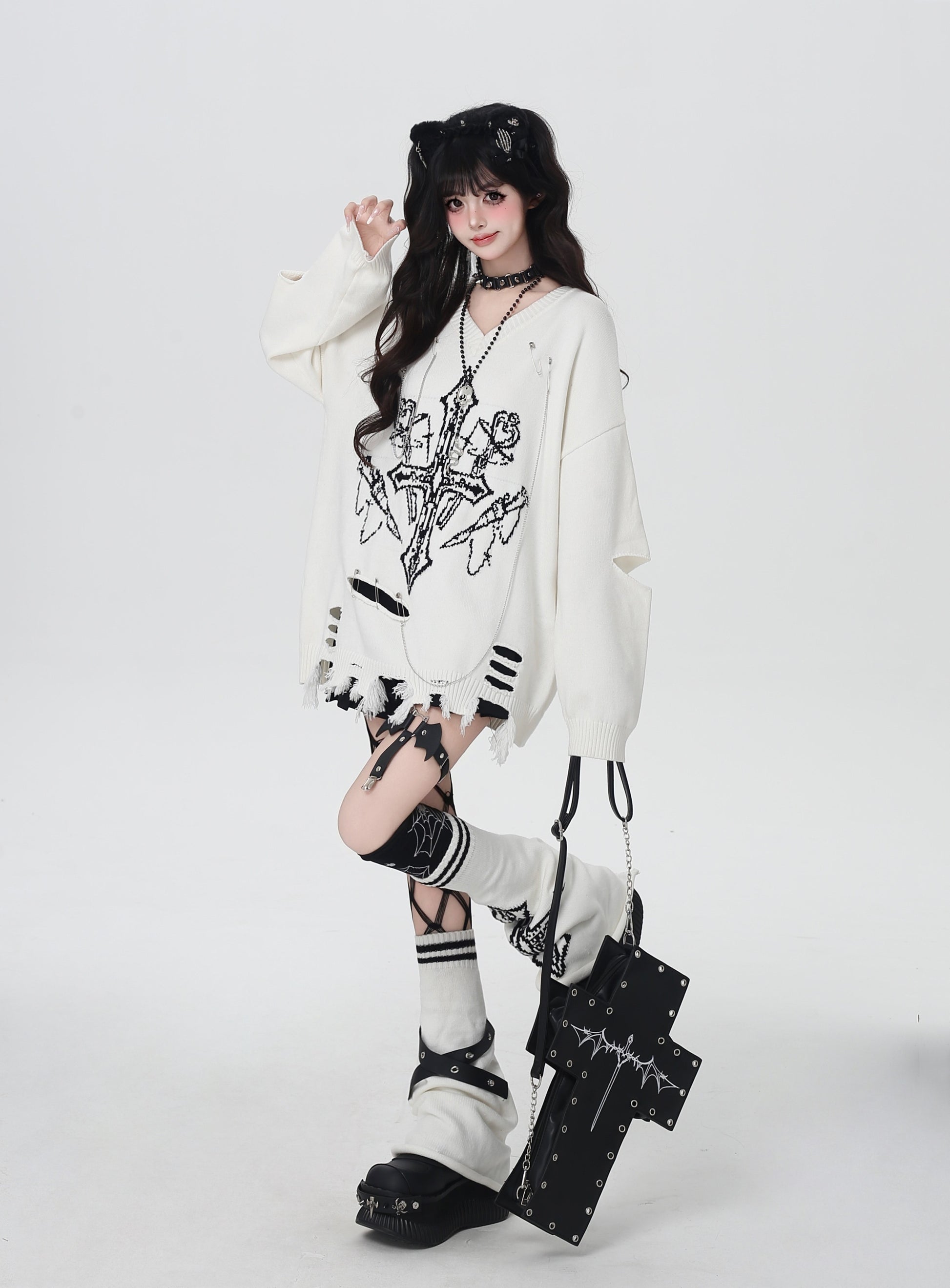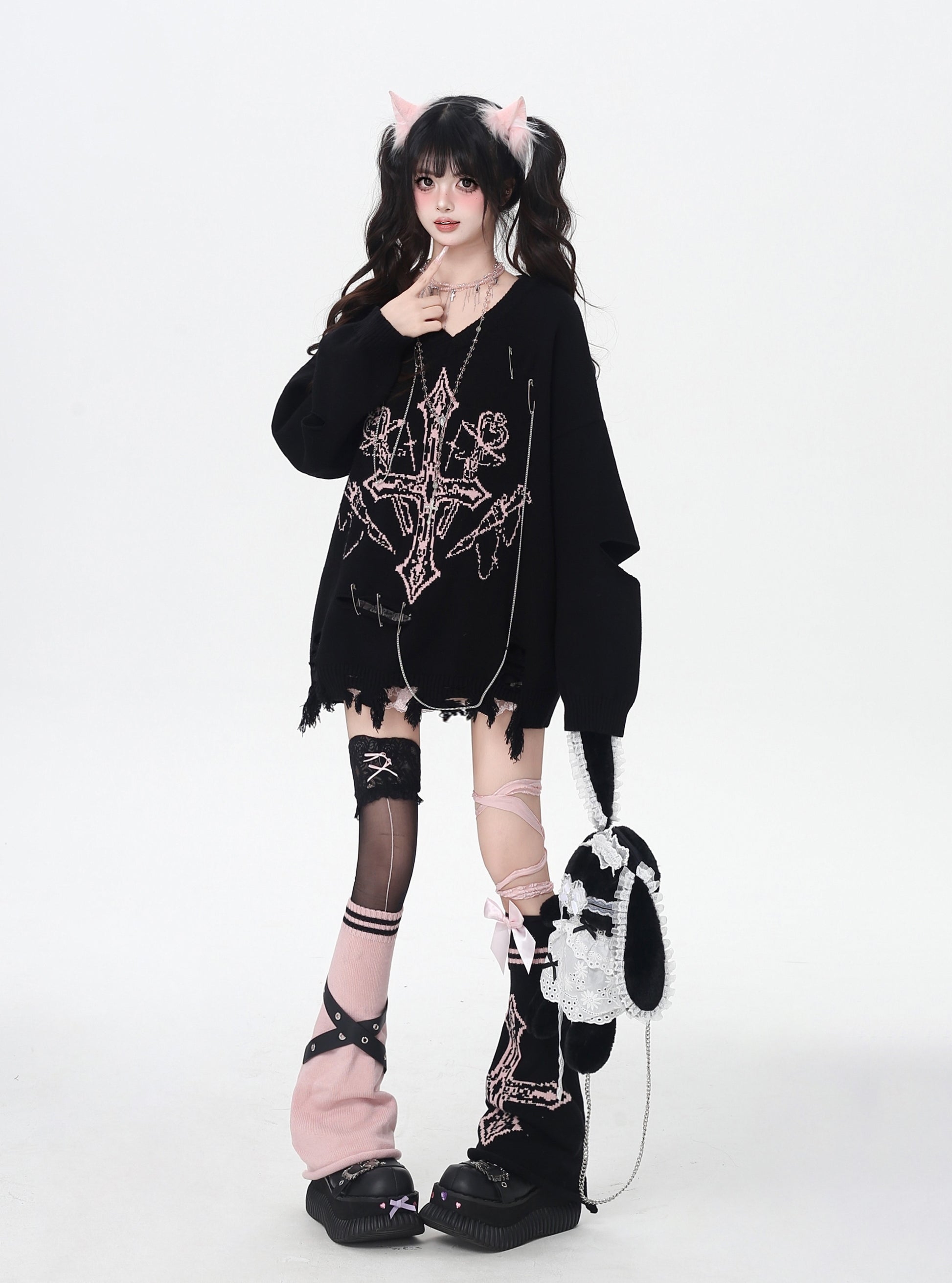 ゴシック×軽ヤンキー風のVネックニット。破れデザインとチェーン装飾で小さなこだわりをプラス。ゆったりシルエットで秋冬の重ね着にもぴったり。