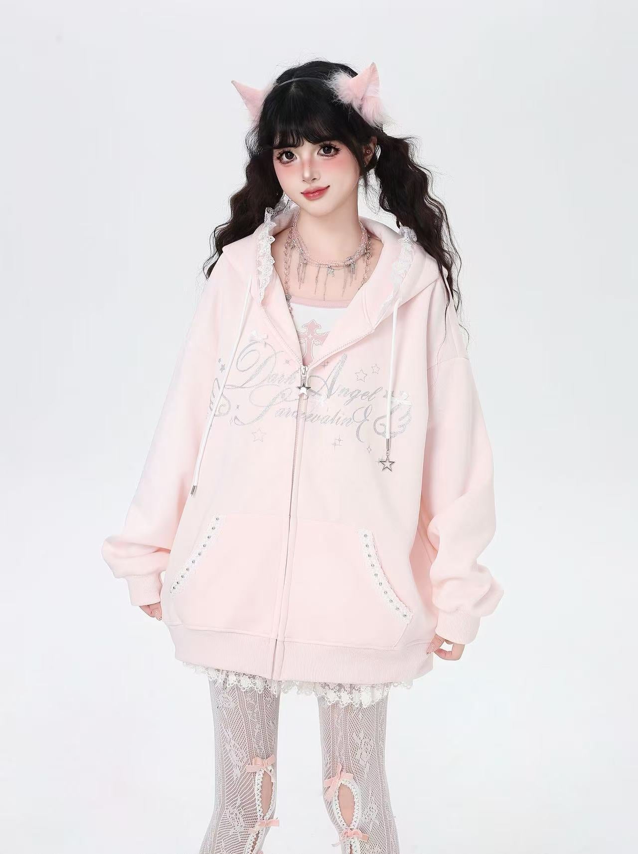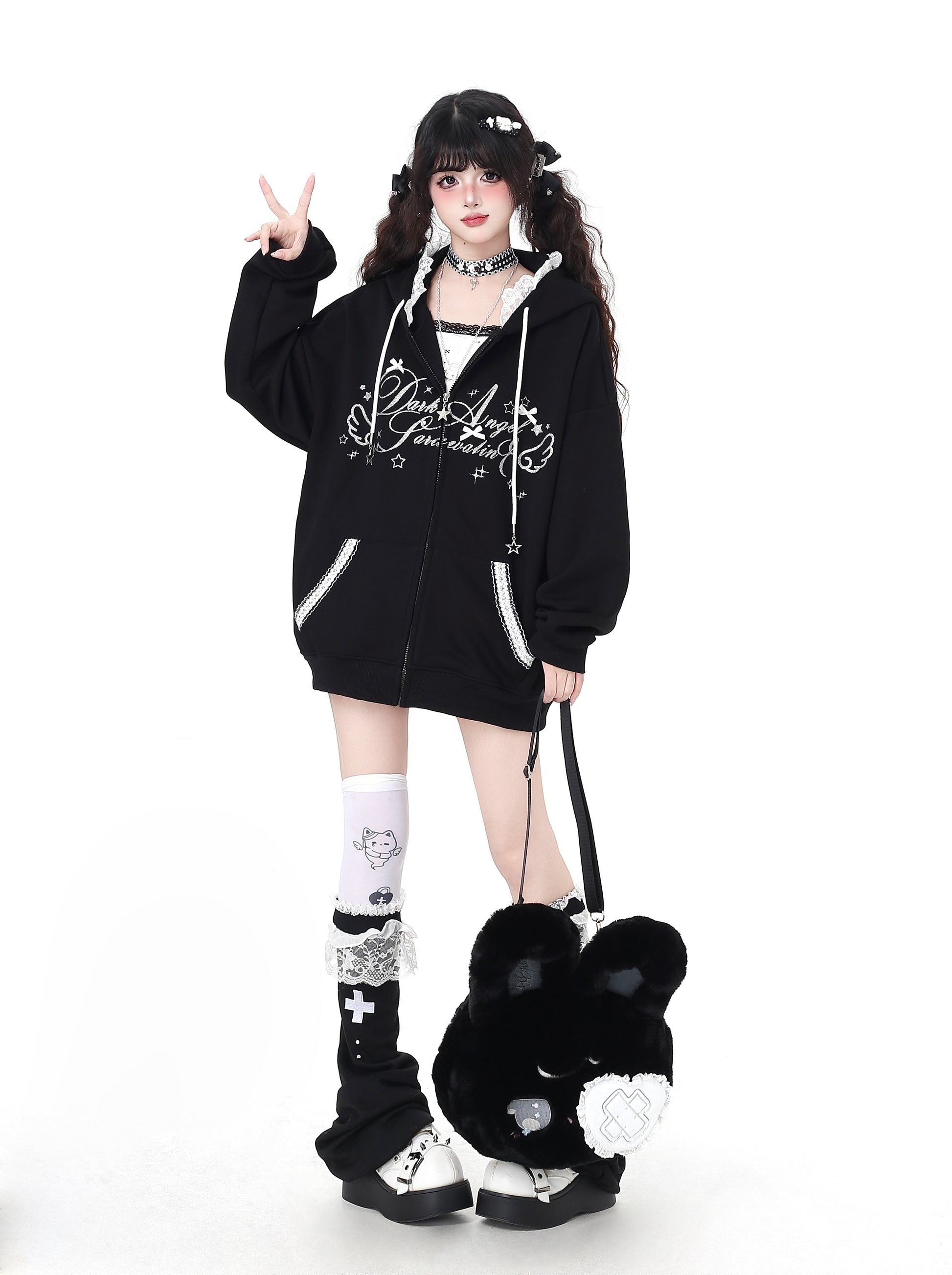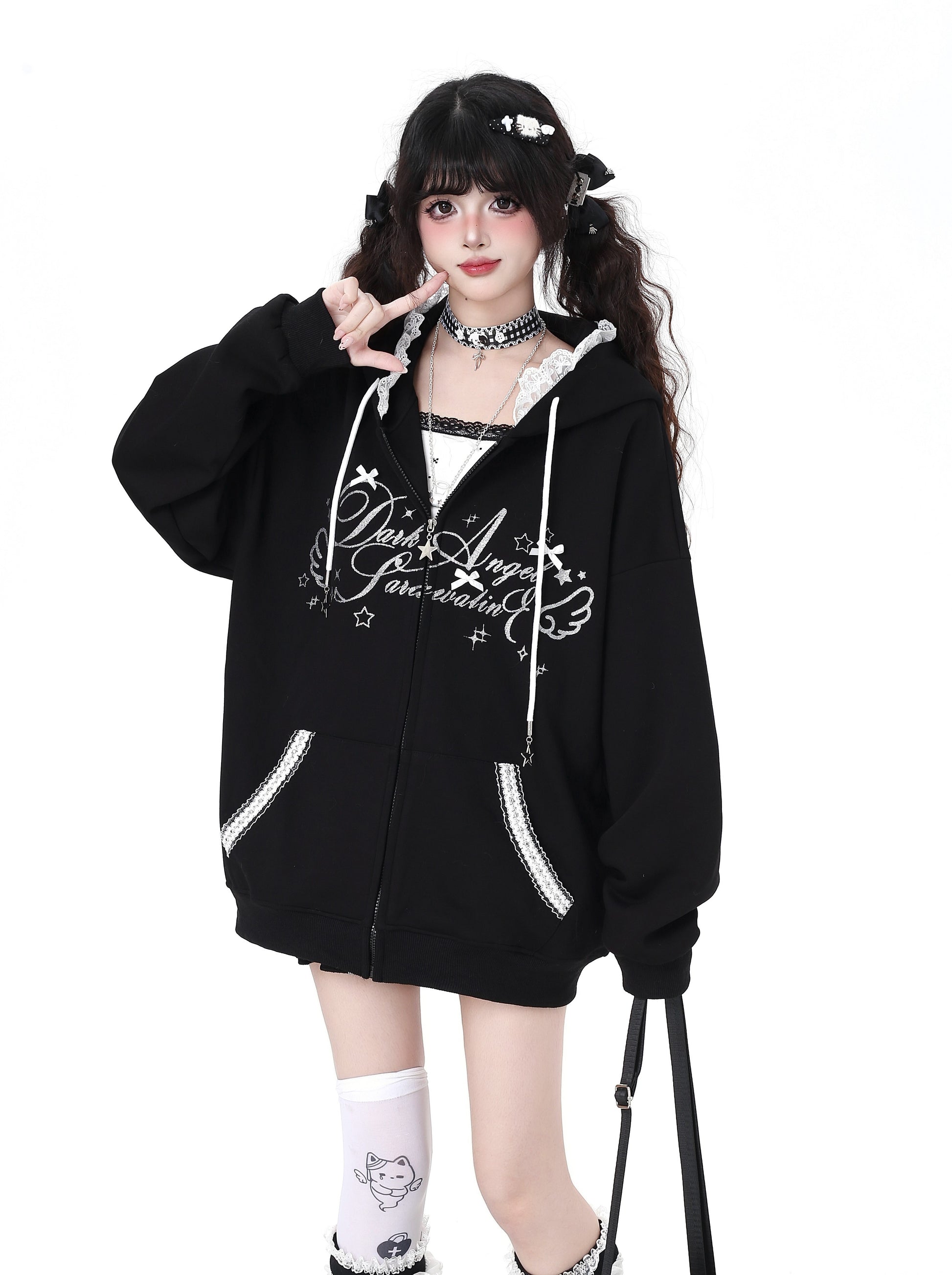 甘く可愛いガーリースタイルにぴったり♡レース付きフードとゆったりシルエットで、秋冬のカジュアルコーデにおすすめ。3色展開でコーデの幅も広がる🖤