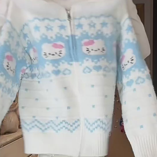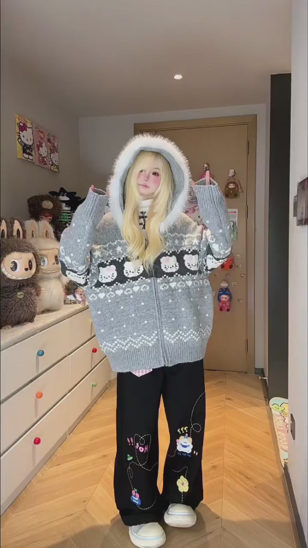 ストライプパンクフード付きゆったりバルーンスリーブカーディガン