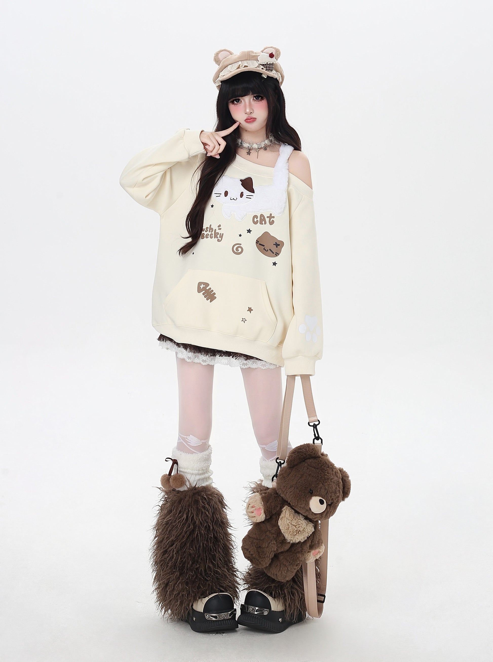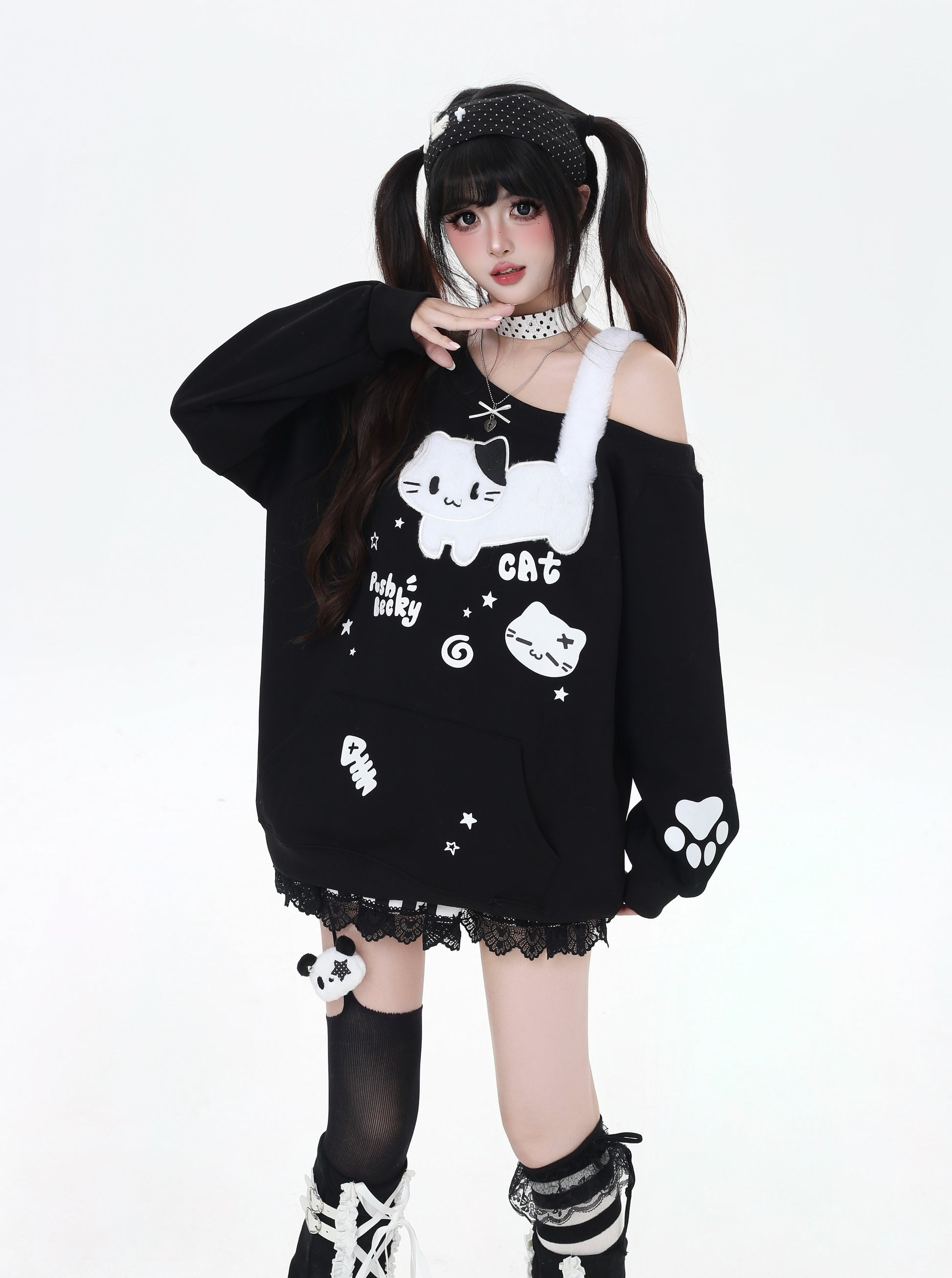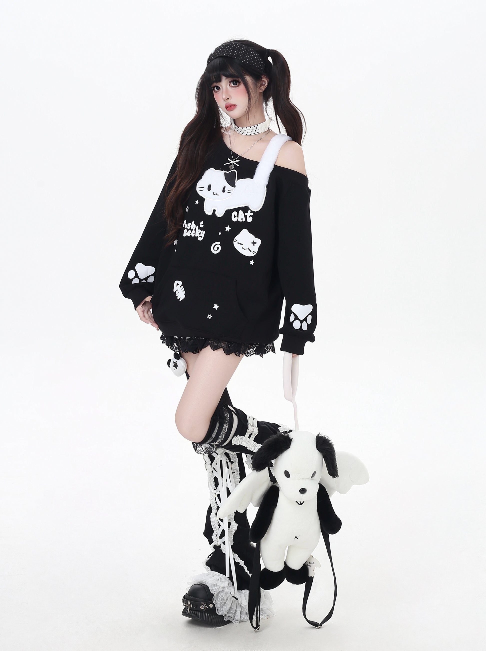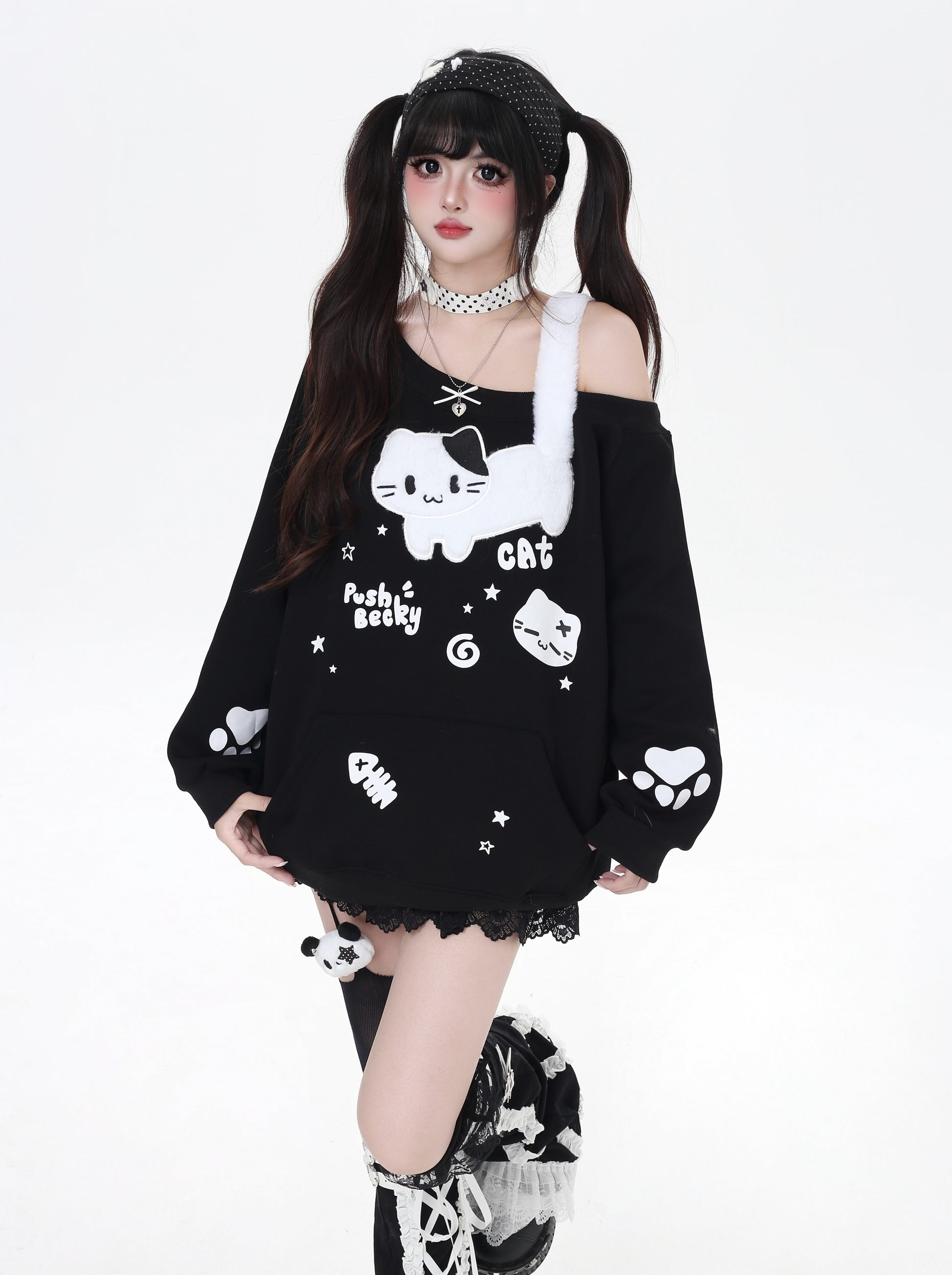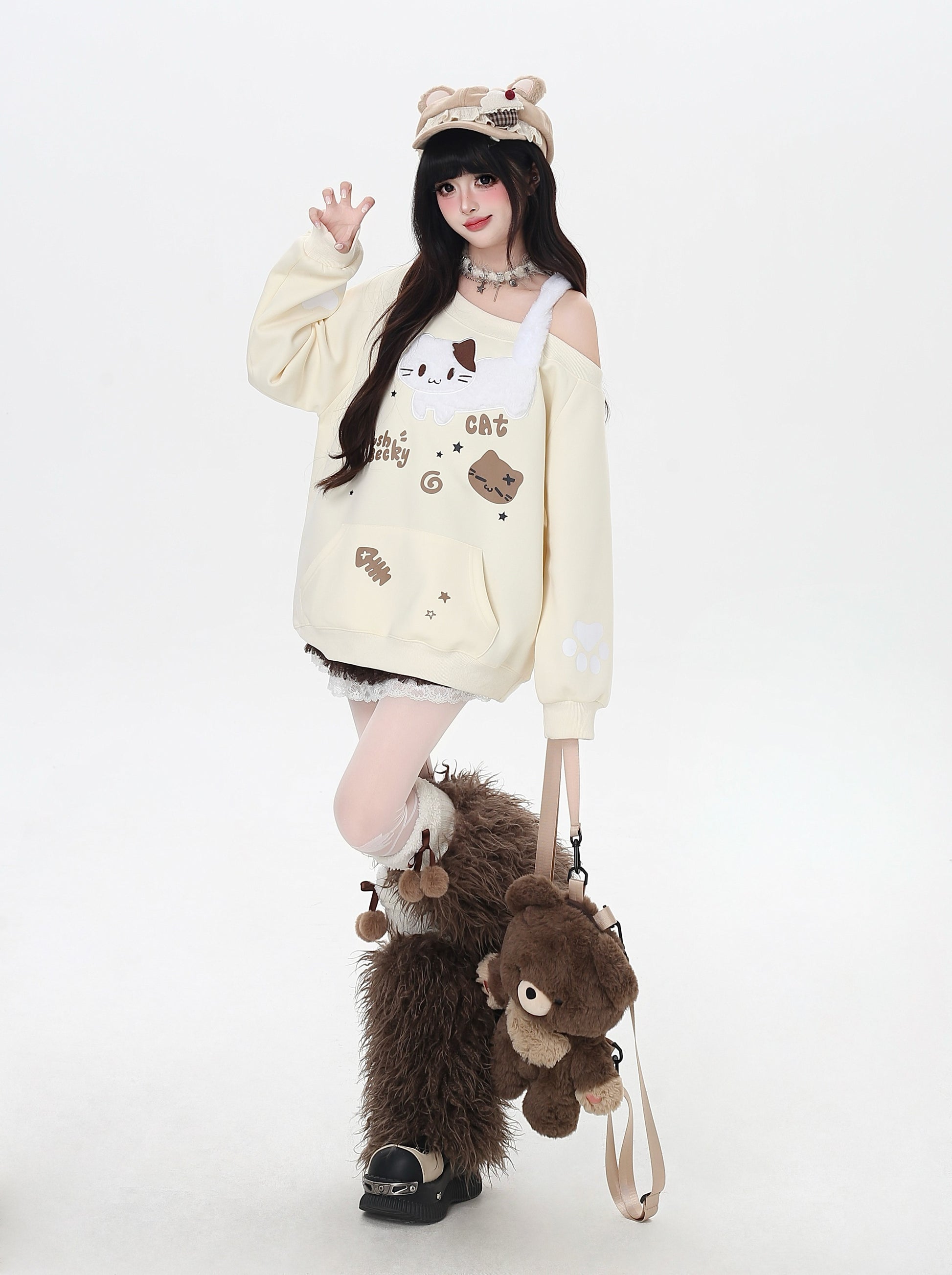ふわもこの猫柄が可愛いオフショルスウェット。