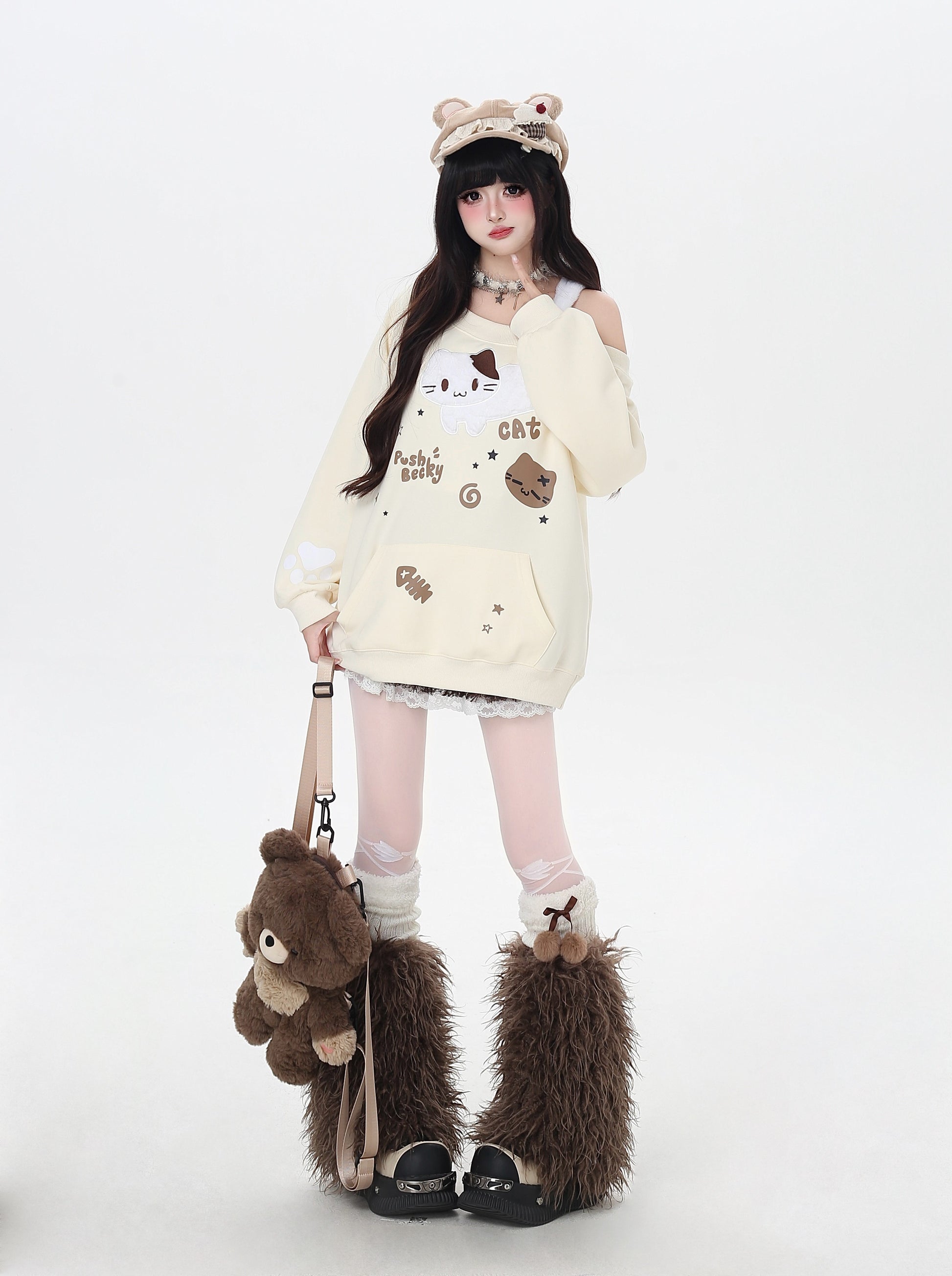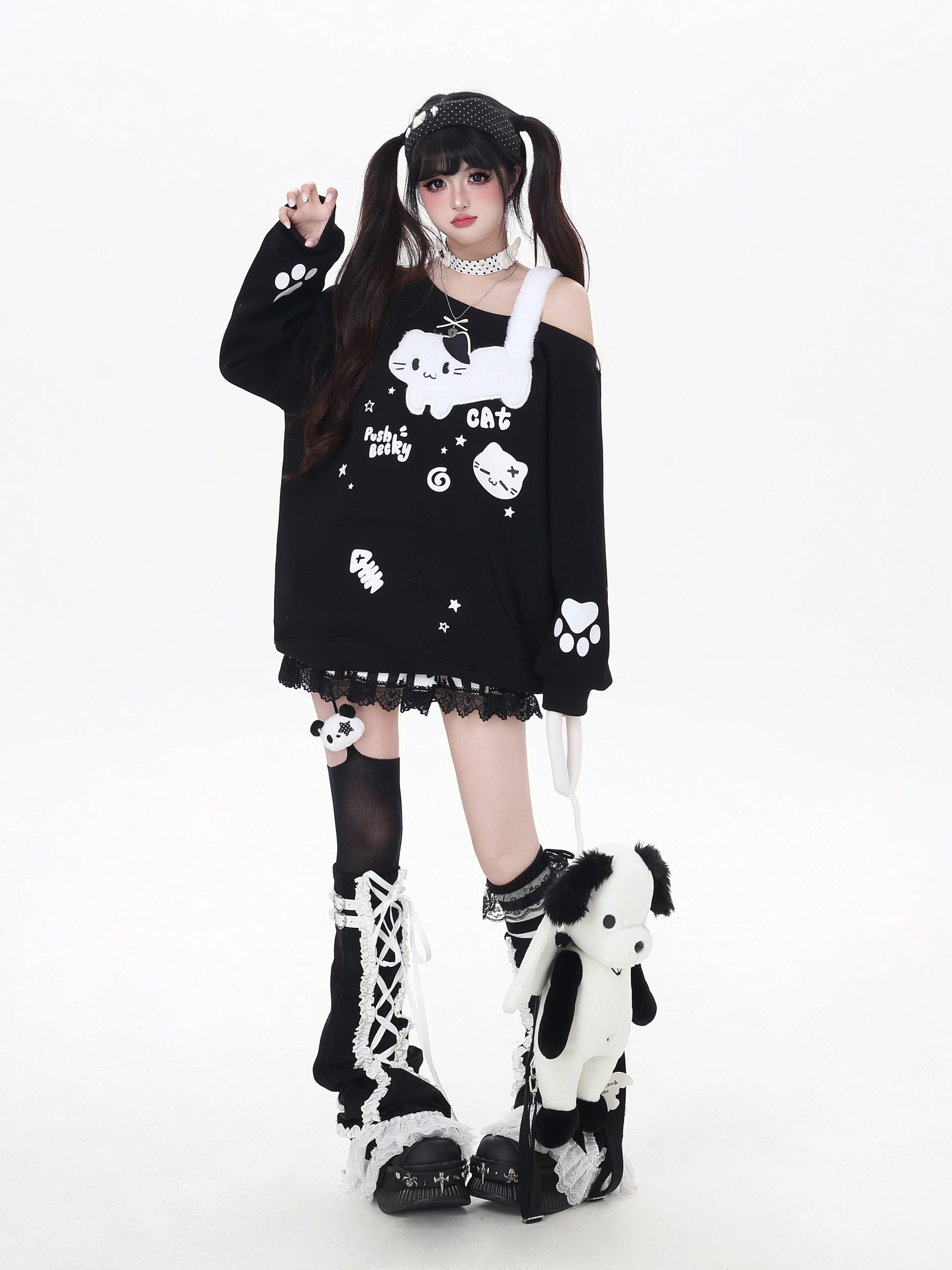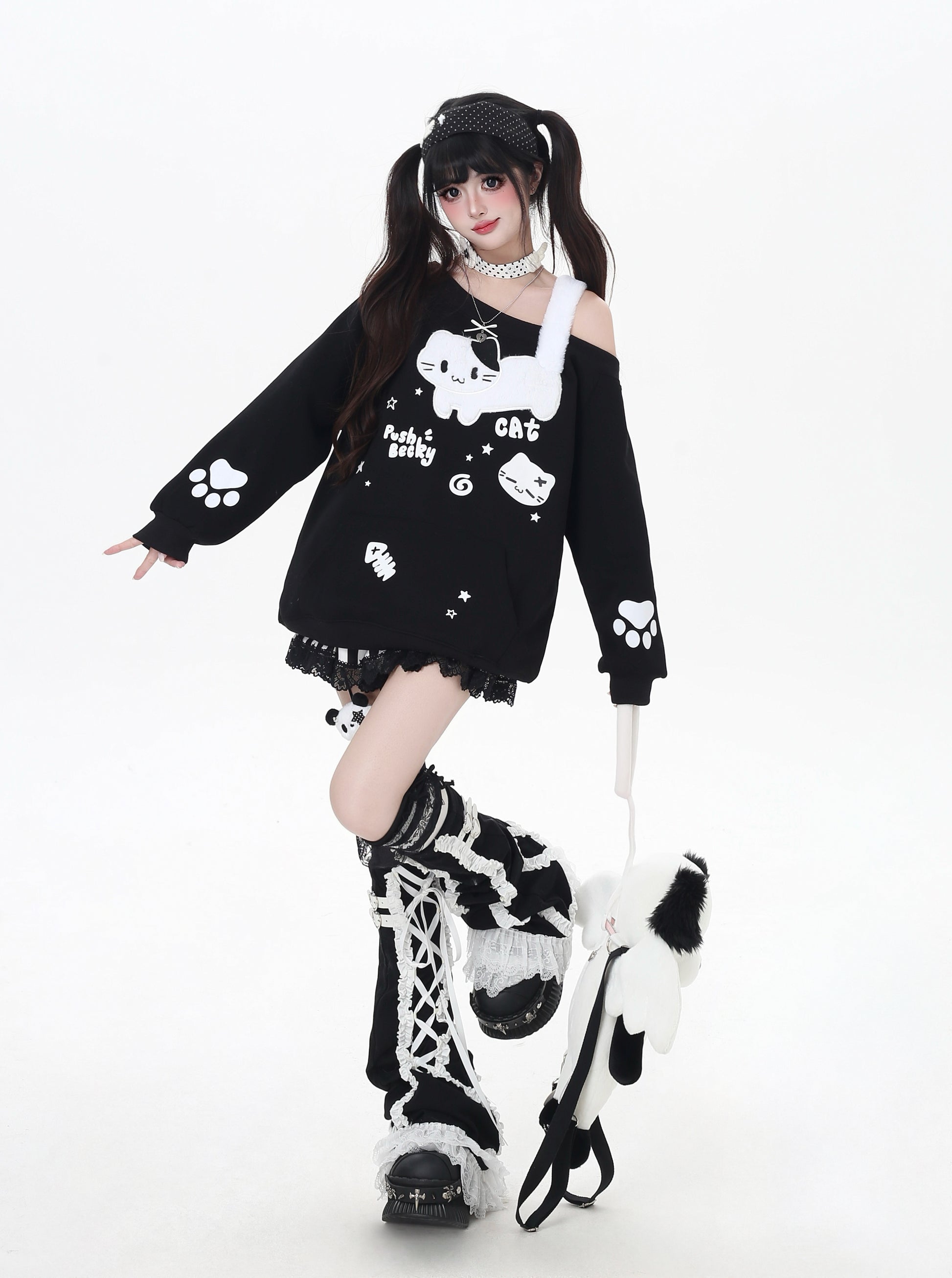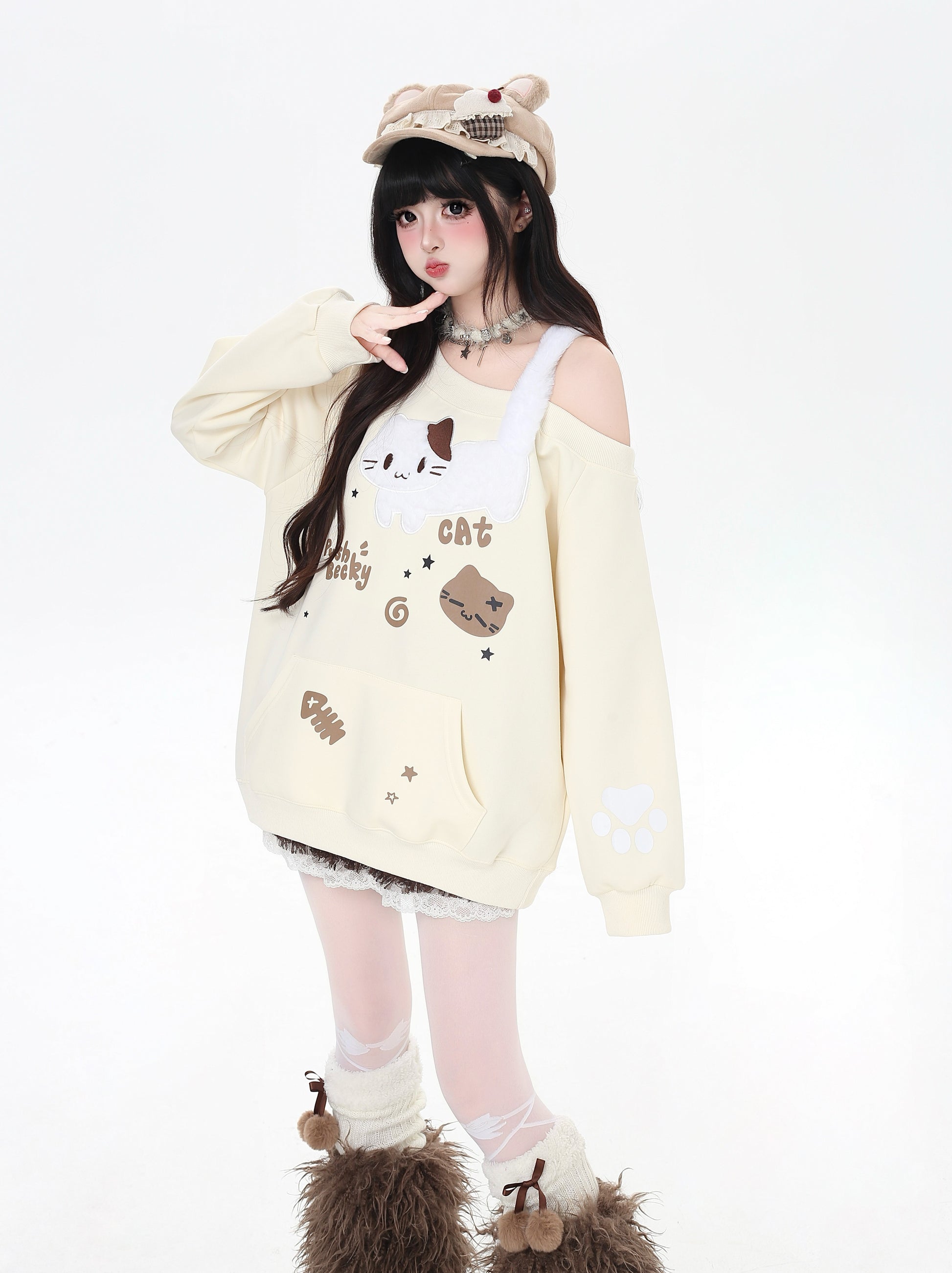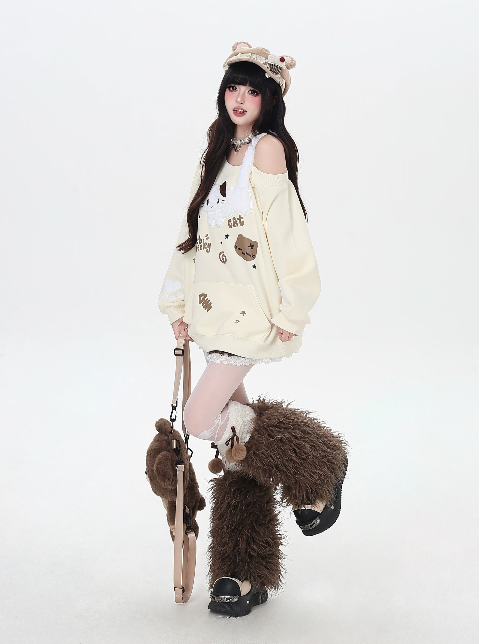 ふわもこの猫柄が可愛いオフショルスウェット。