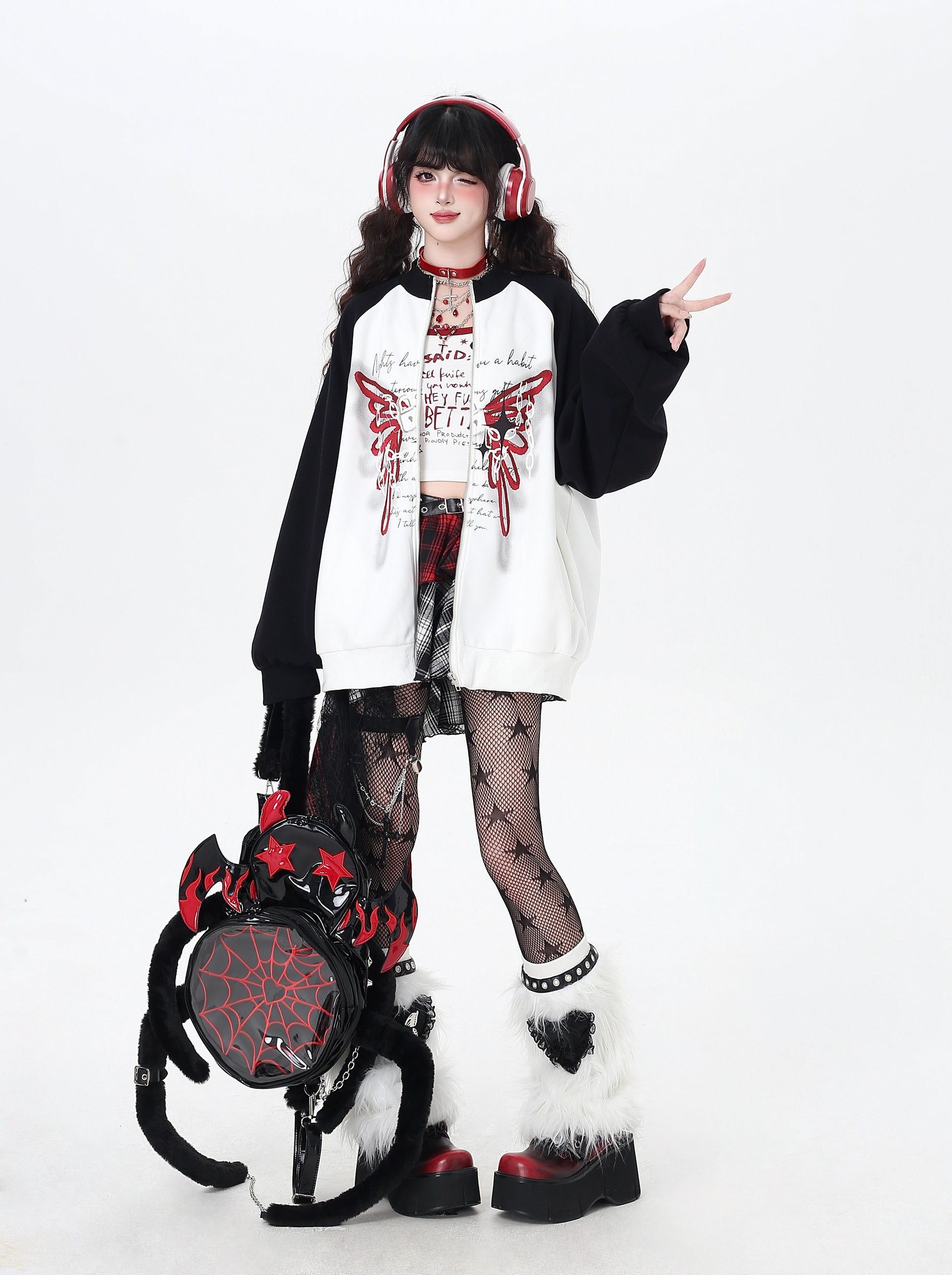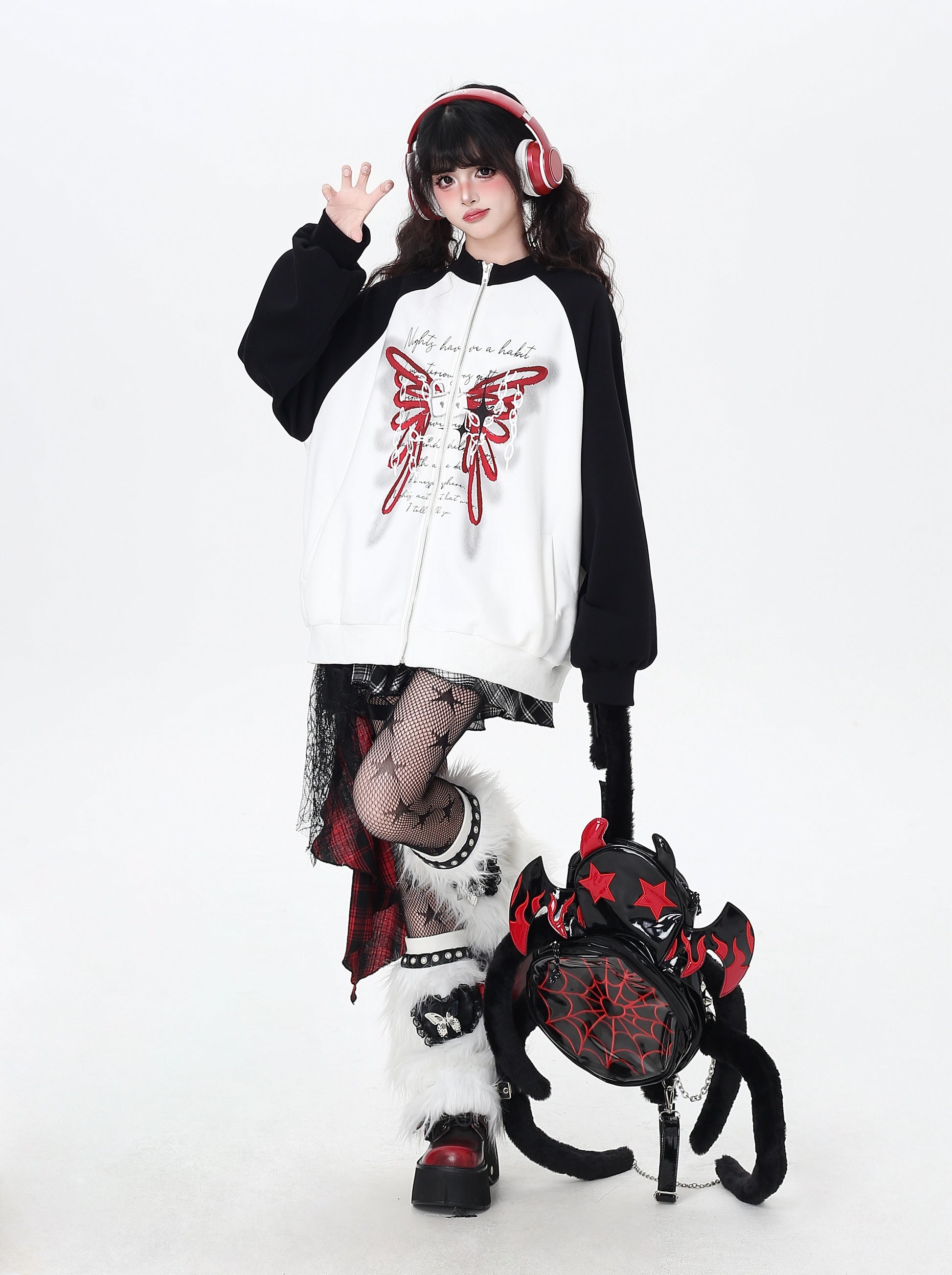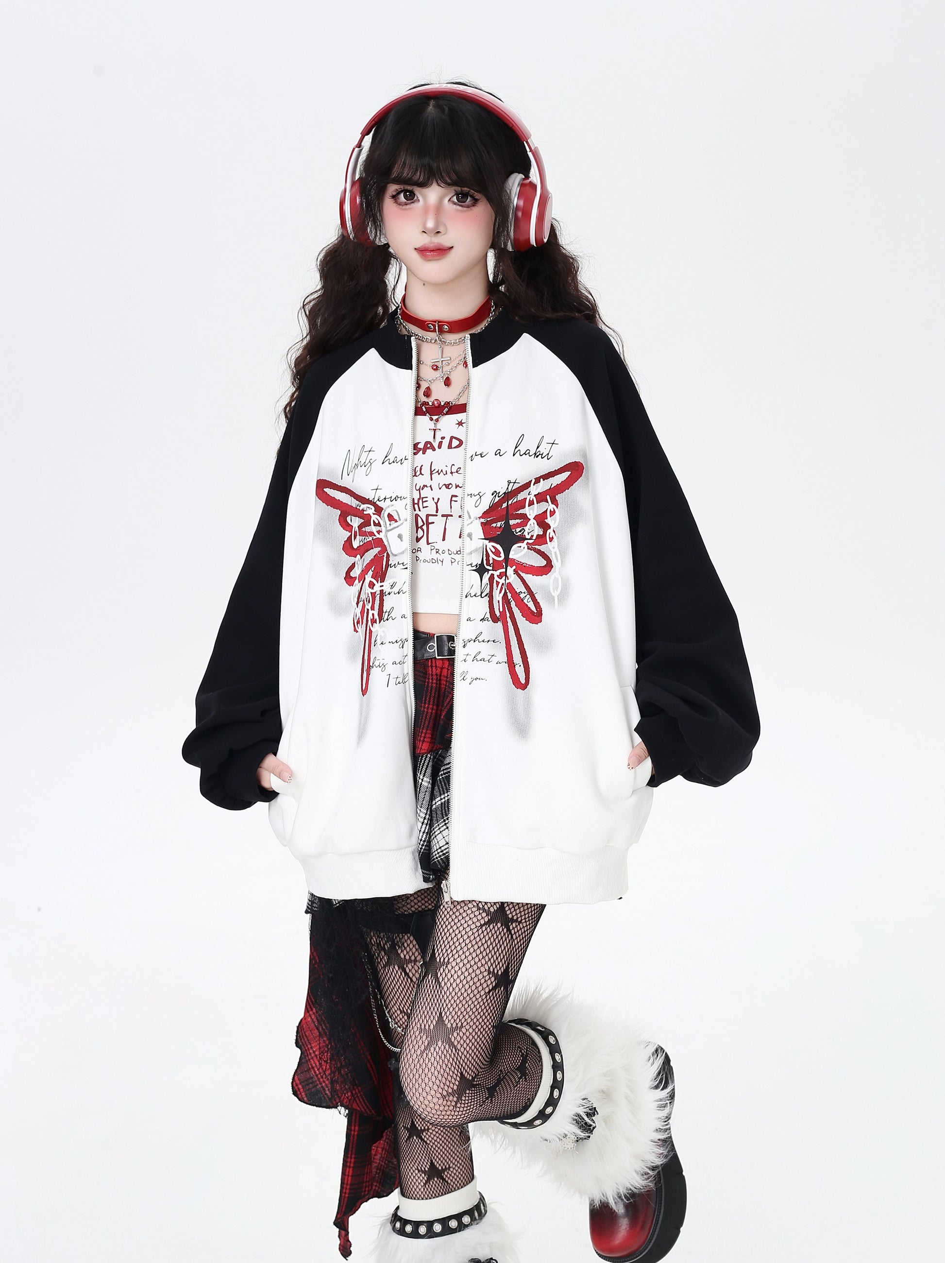 ユル地雷系必見♡蝶柄アクセントのハイネックジャケット。黒白のコントラストでスポーティ&カジュアルな印象、ゆったりシルエットで秋のゆるコーデにもぴったり🖤