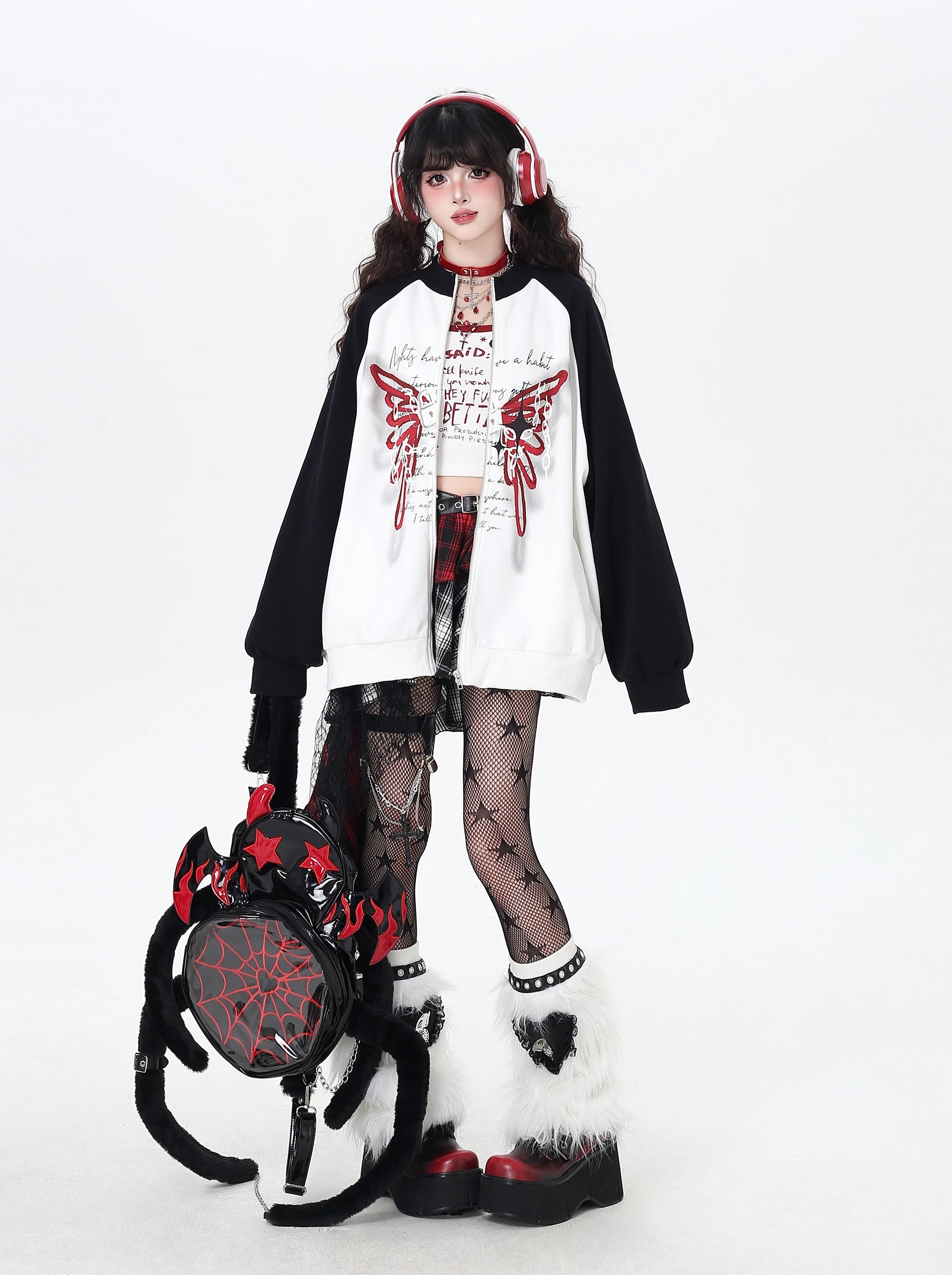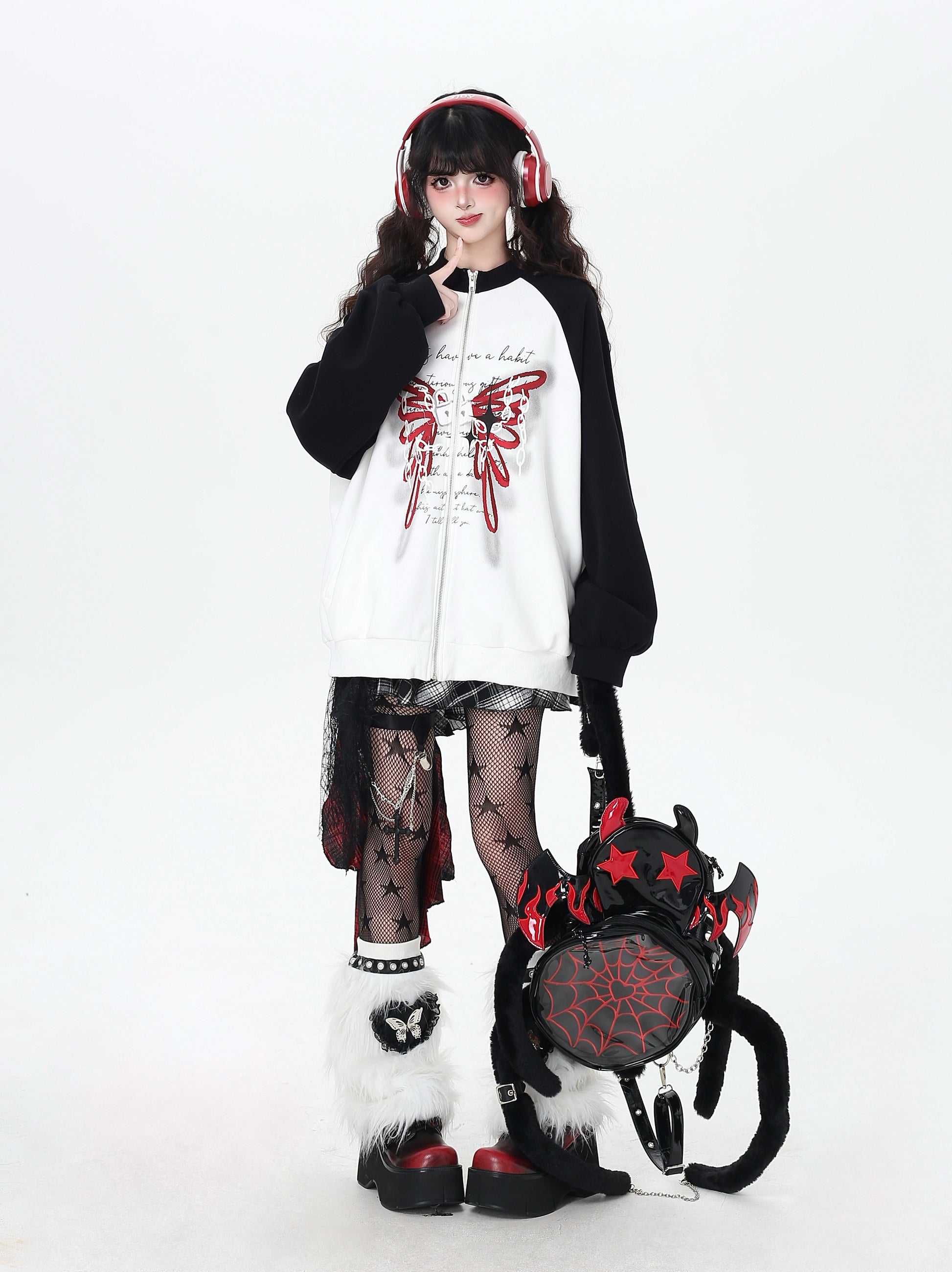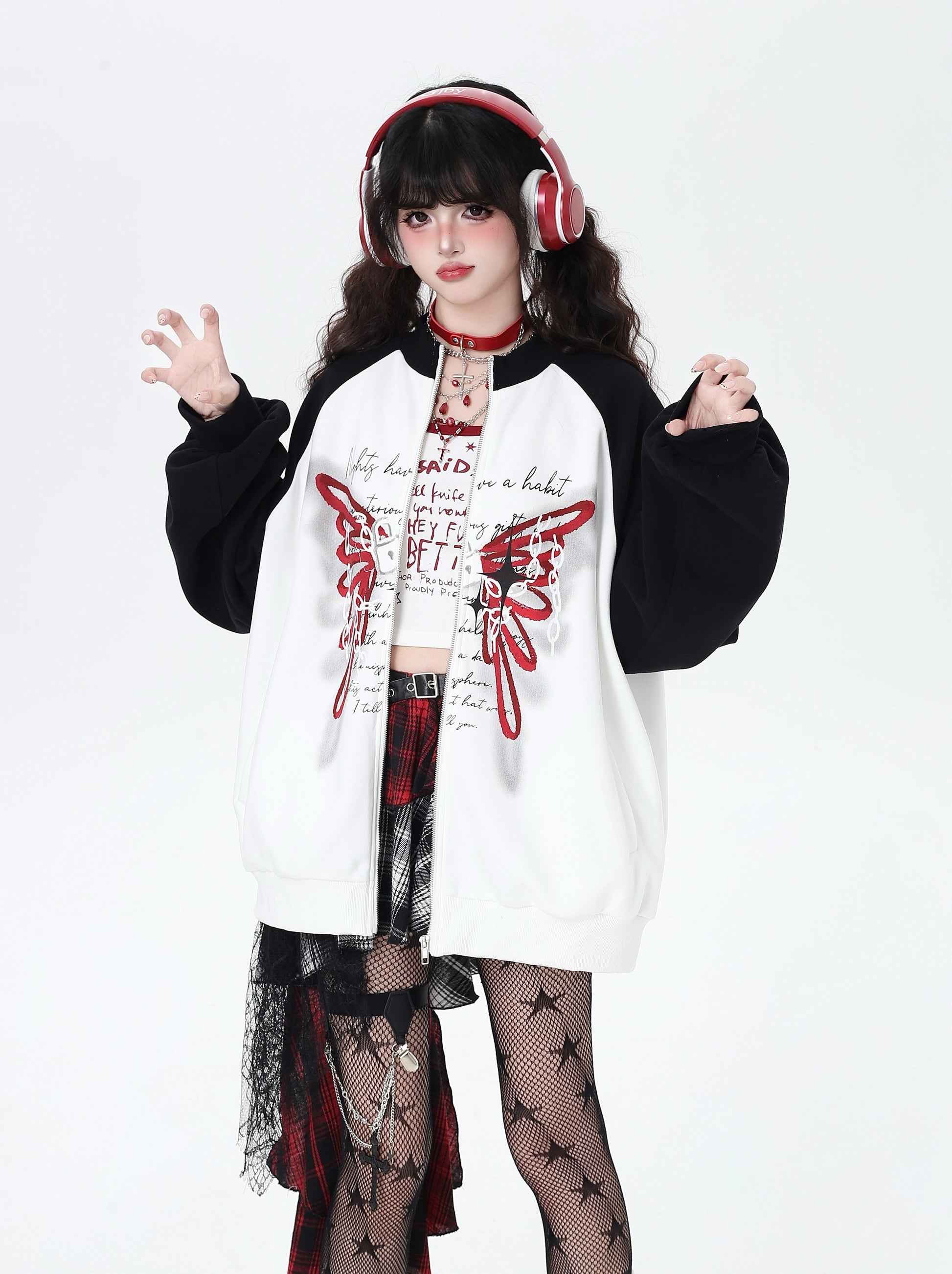 ユル地雷系必見♡蝶柄アクセントのハイネックジャケット。黒白のコントラストでスポーティ&カジュアルな印象、ゆったりシルエットで秋のゆるコーデにもぴったり🖤