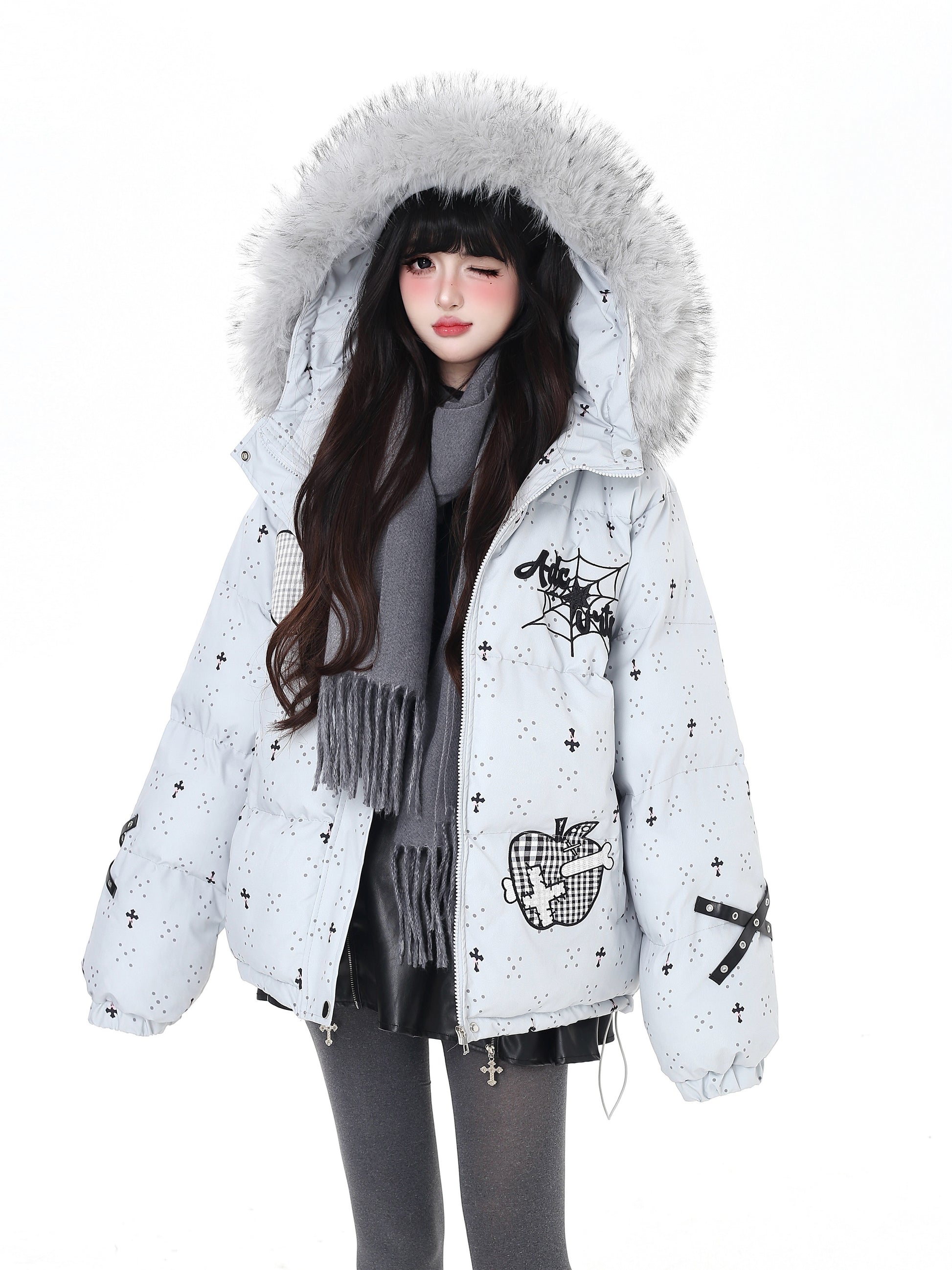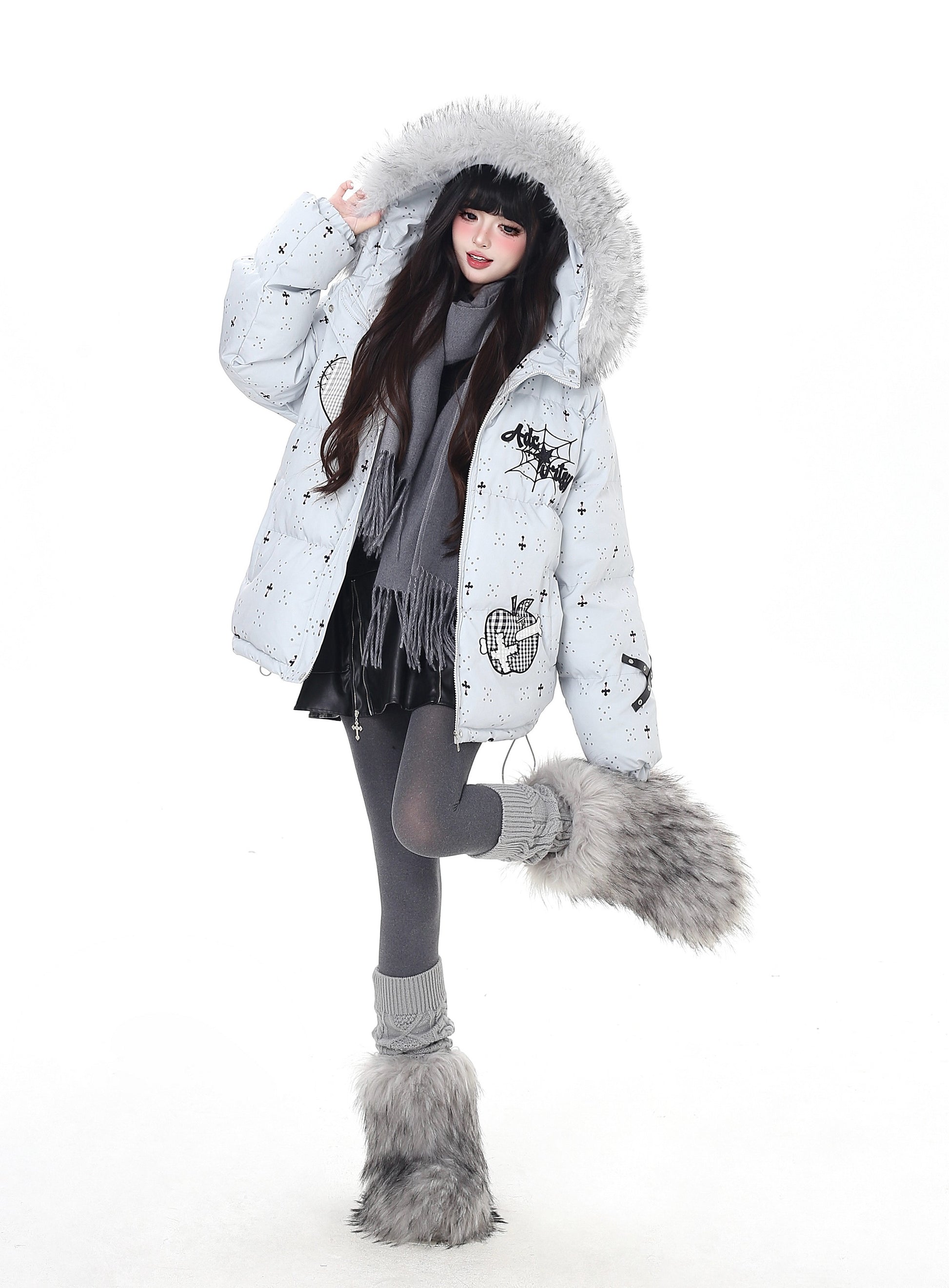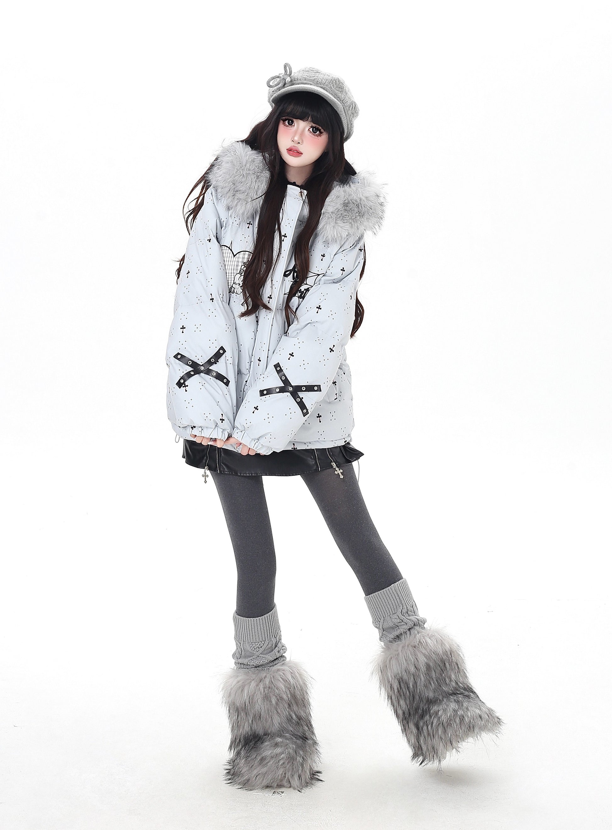 雪柄フード付き取り外し可毛襟コットンジャケット