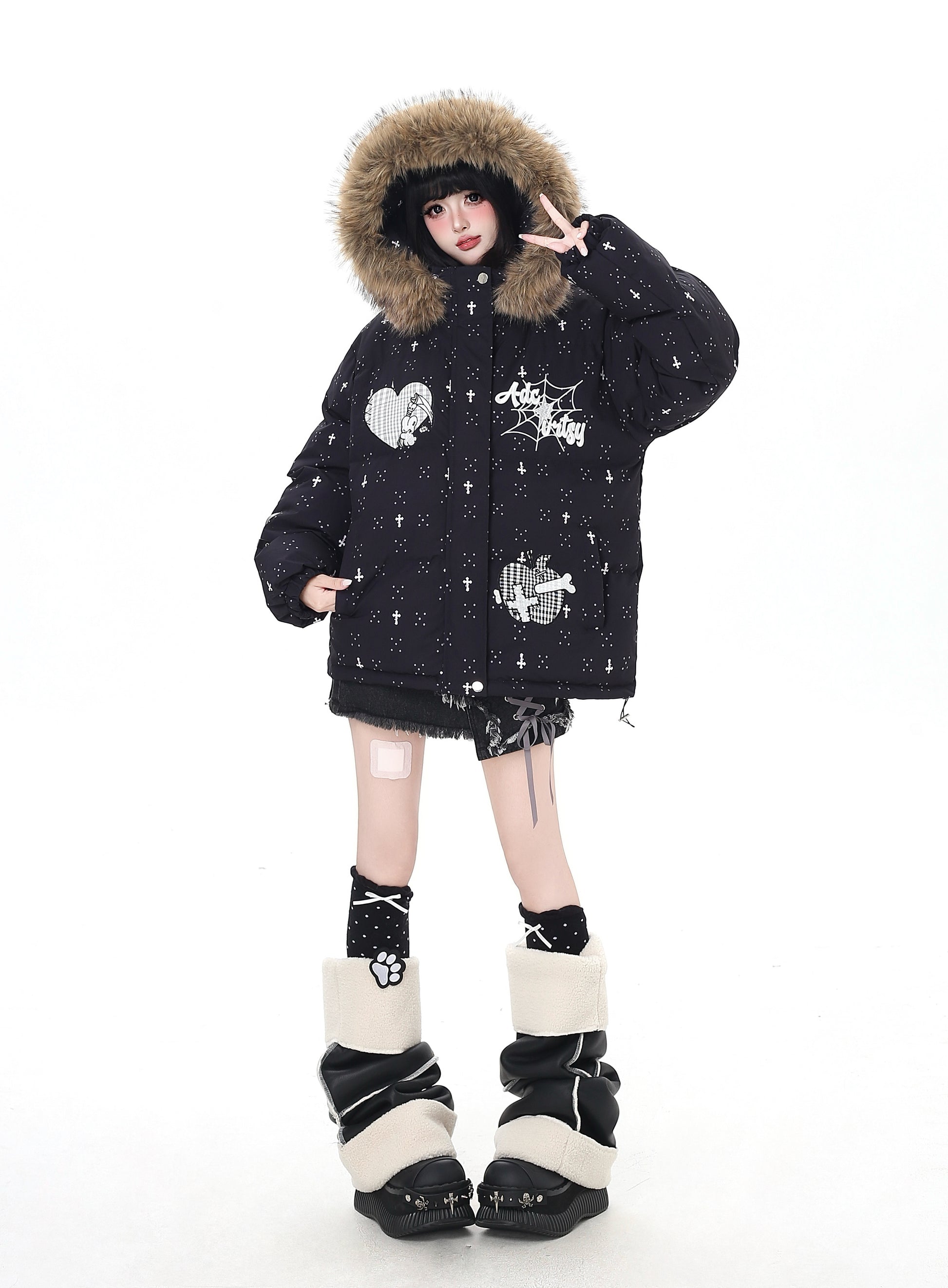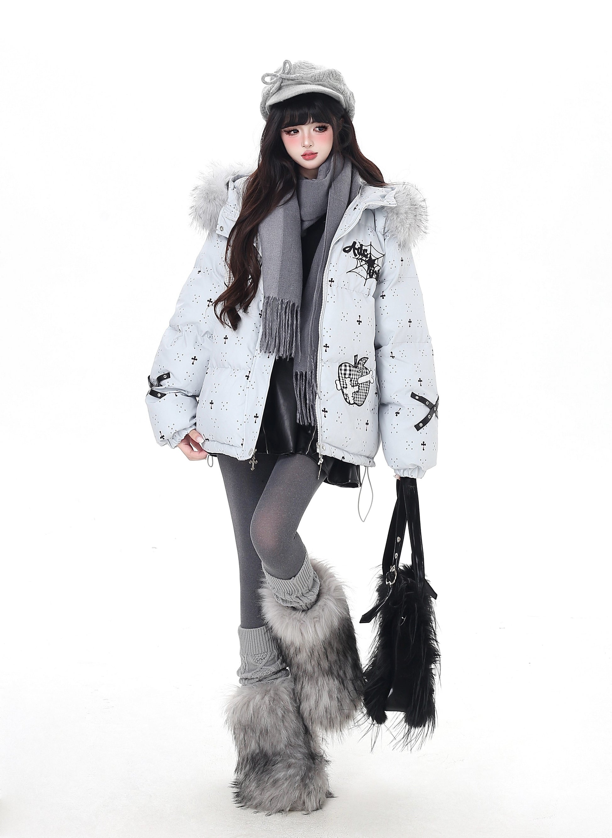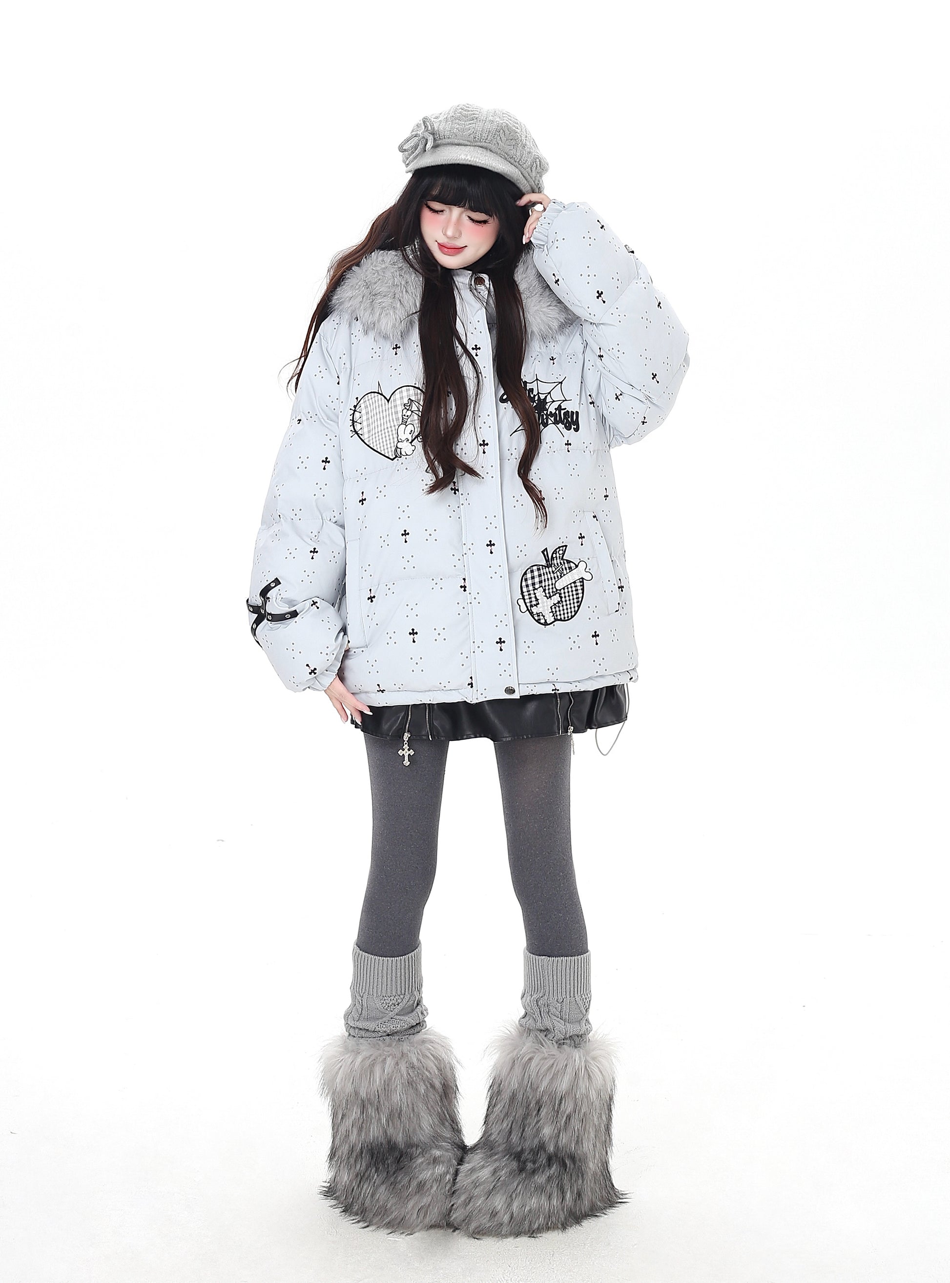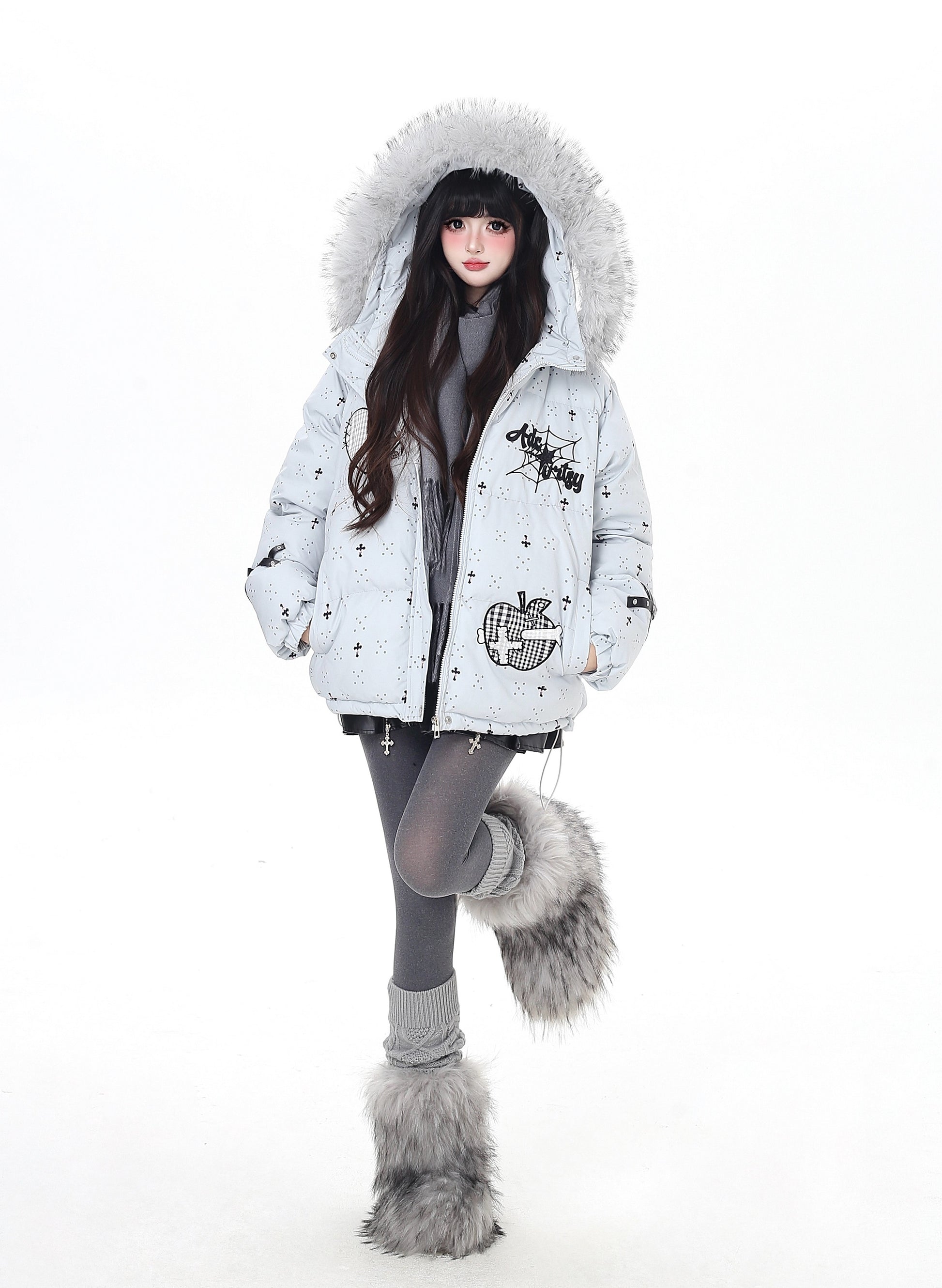 雪柄フード付き取り外し可毛襟コットンジャケット
