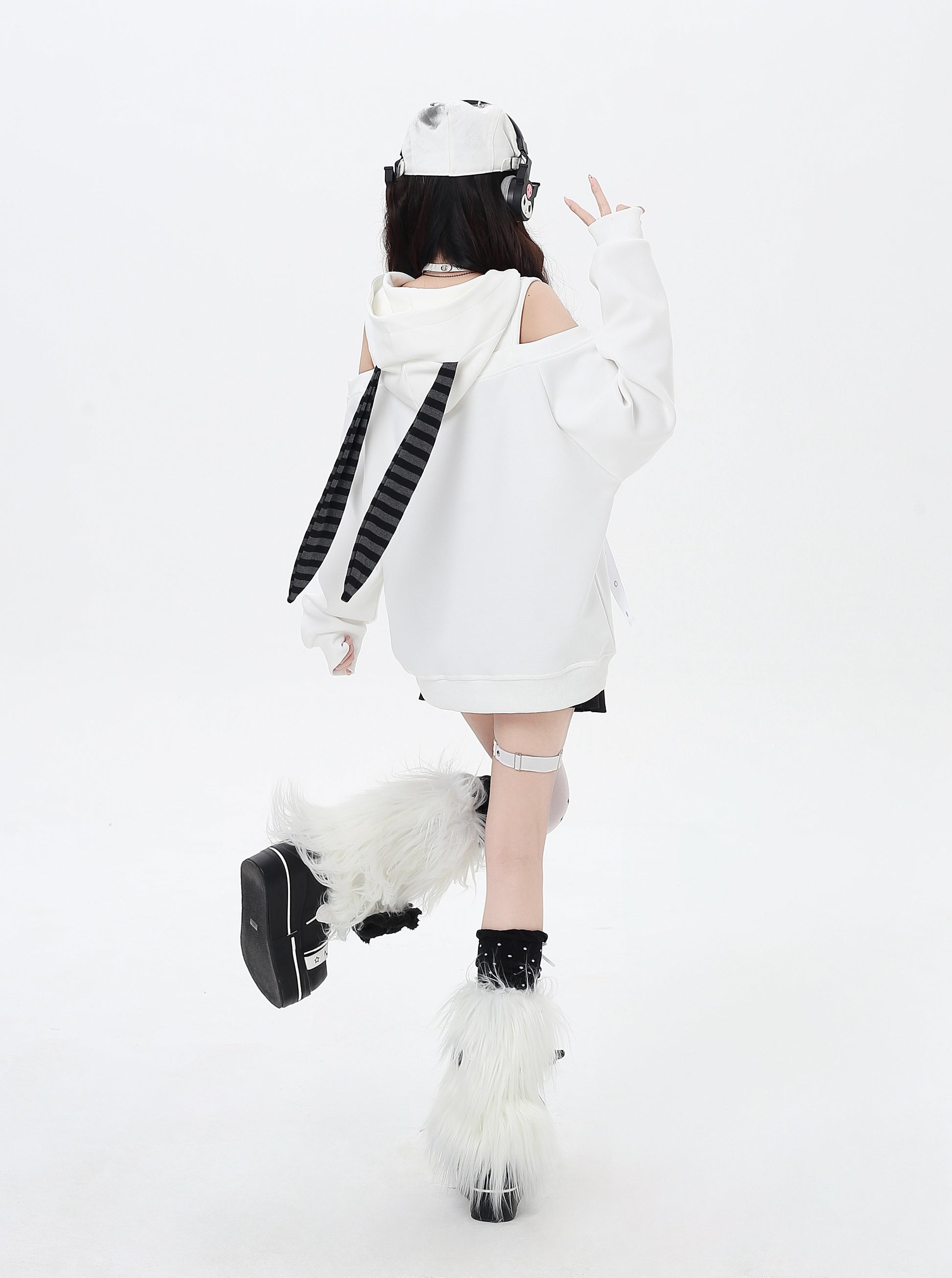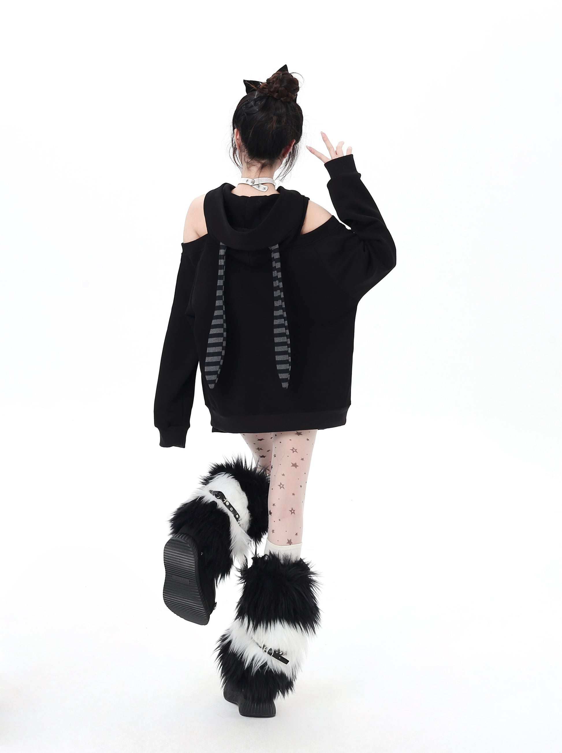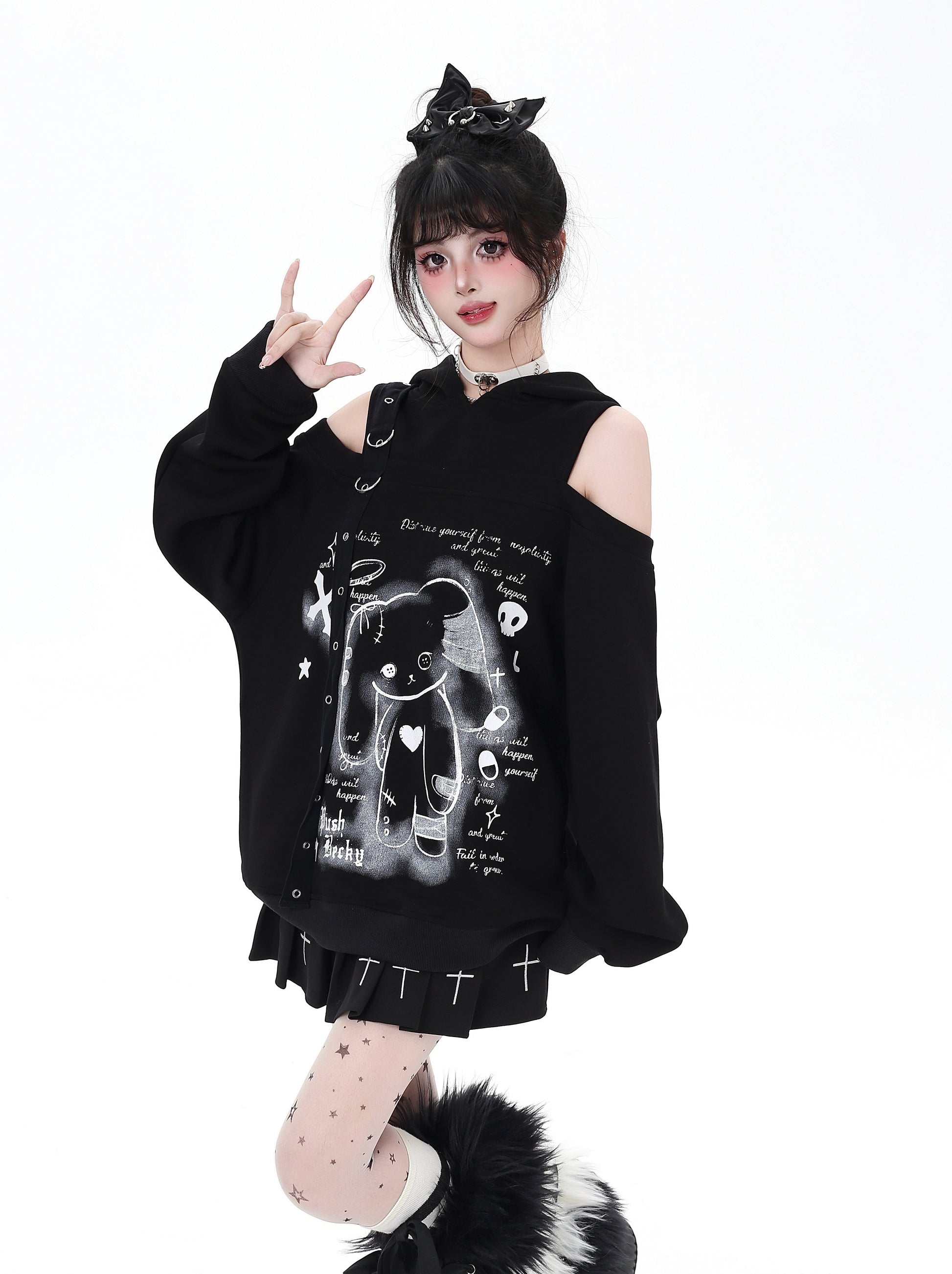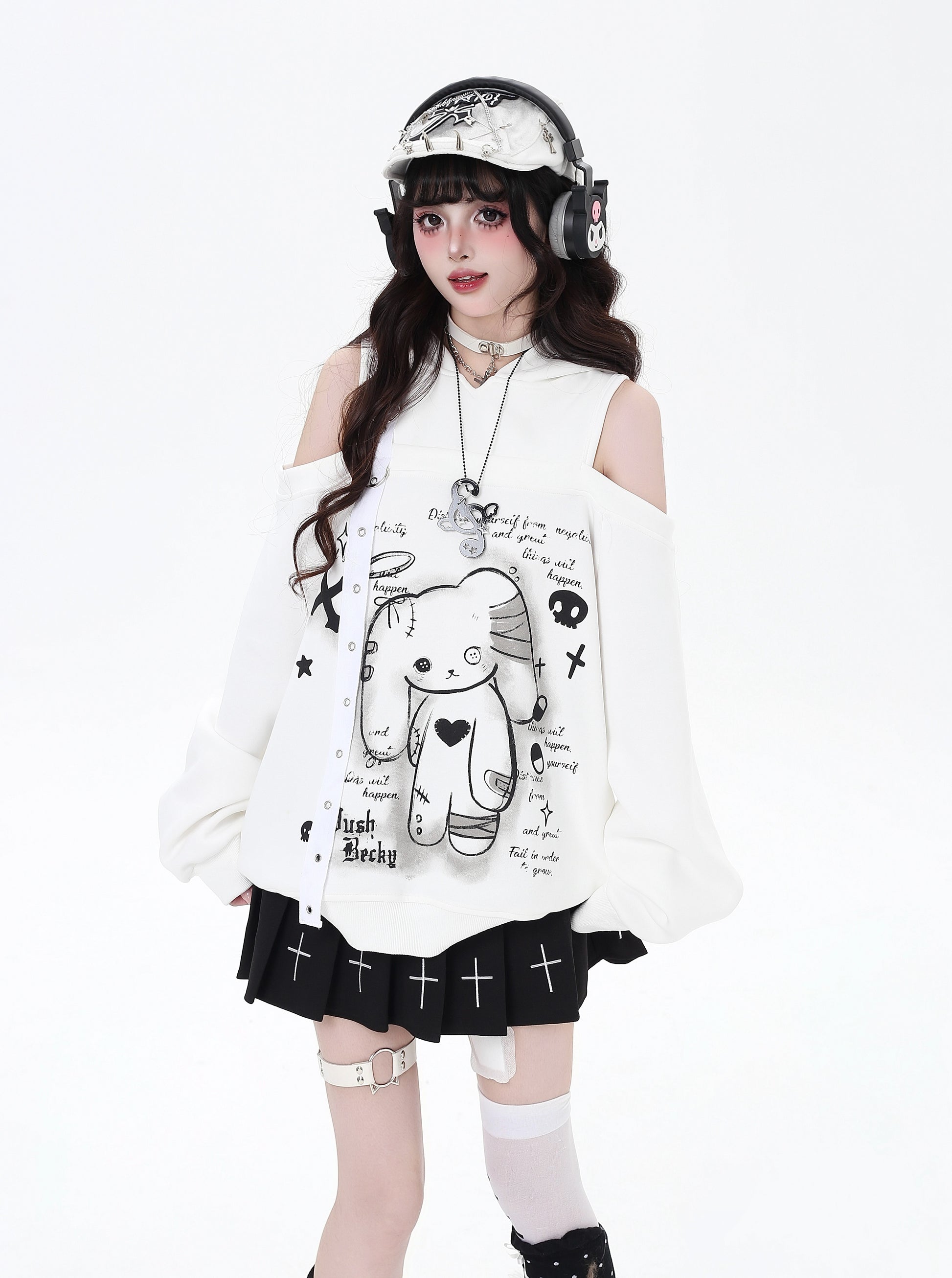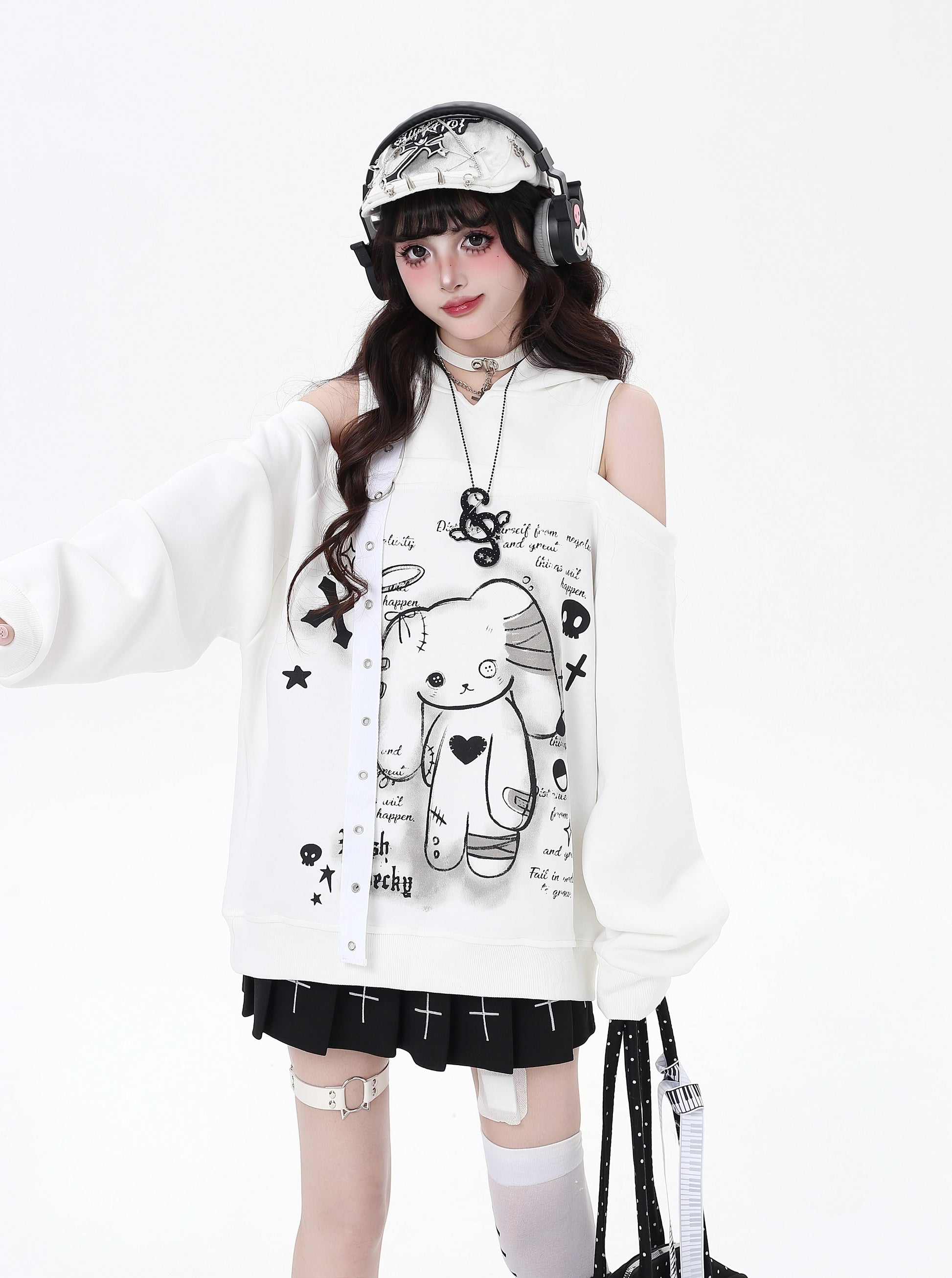 闇かわいいデザインのうさ耳フードとオフショルで、甘さとクールさを両立♡ゆるっとしたシルエットでリラックス感も◎。秋冬のサブカルコーデにぴったりの一枚です✨