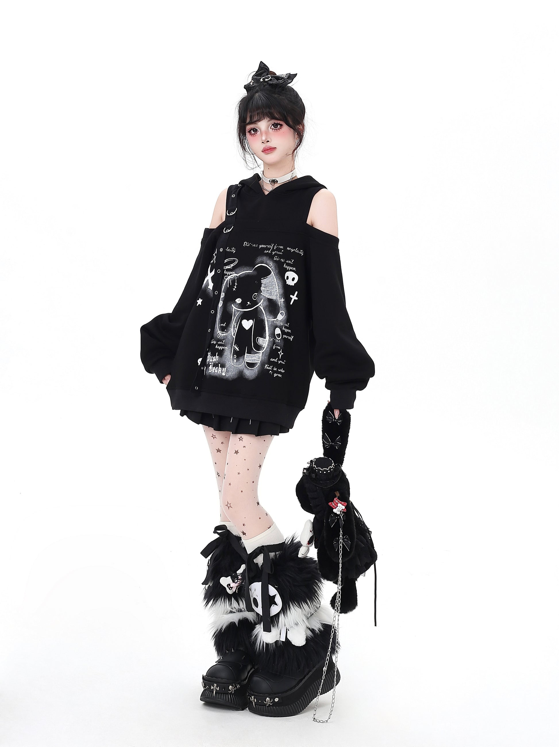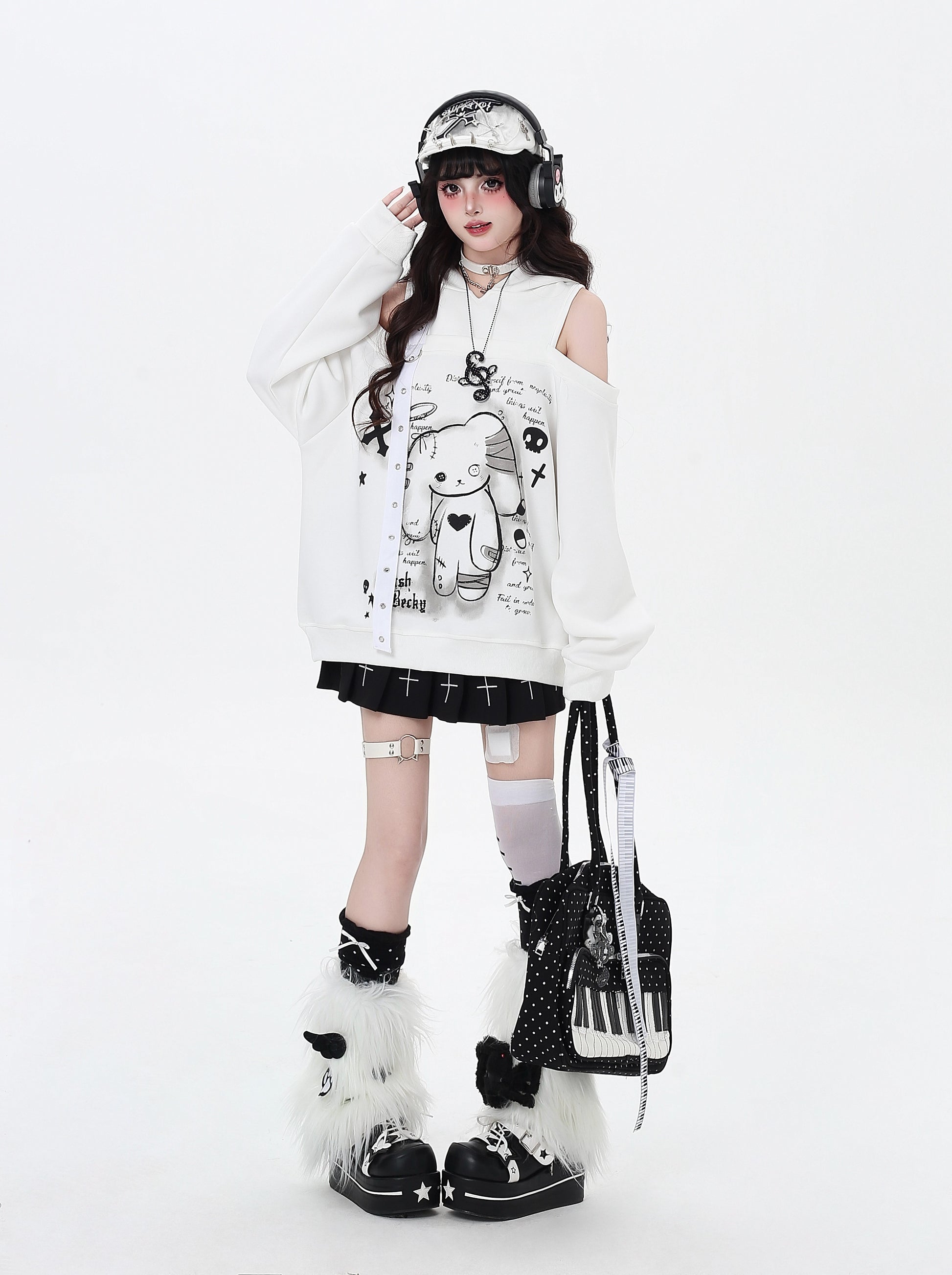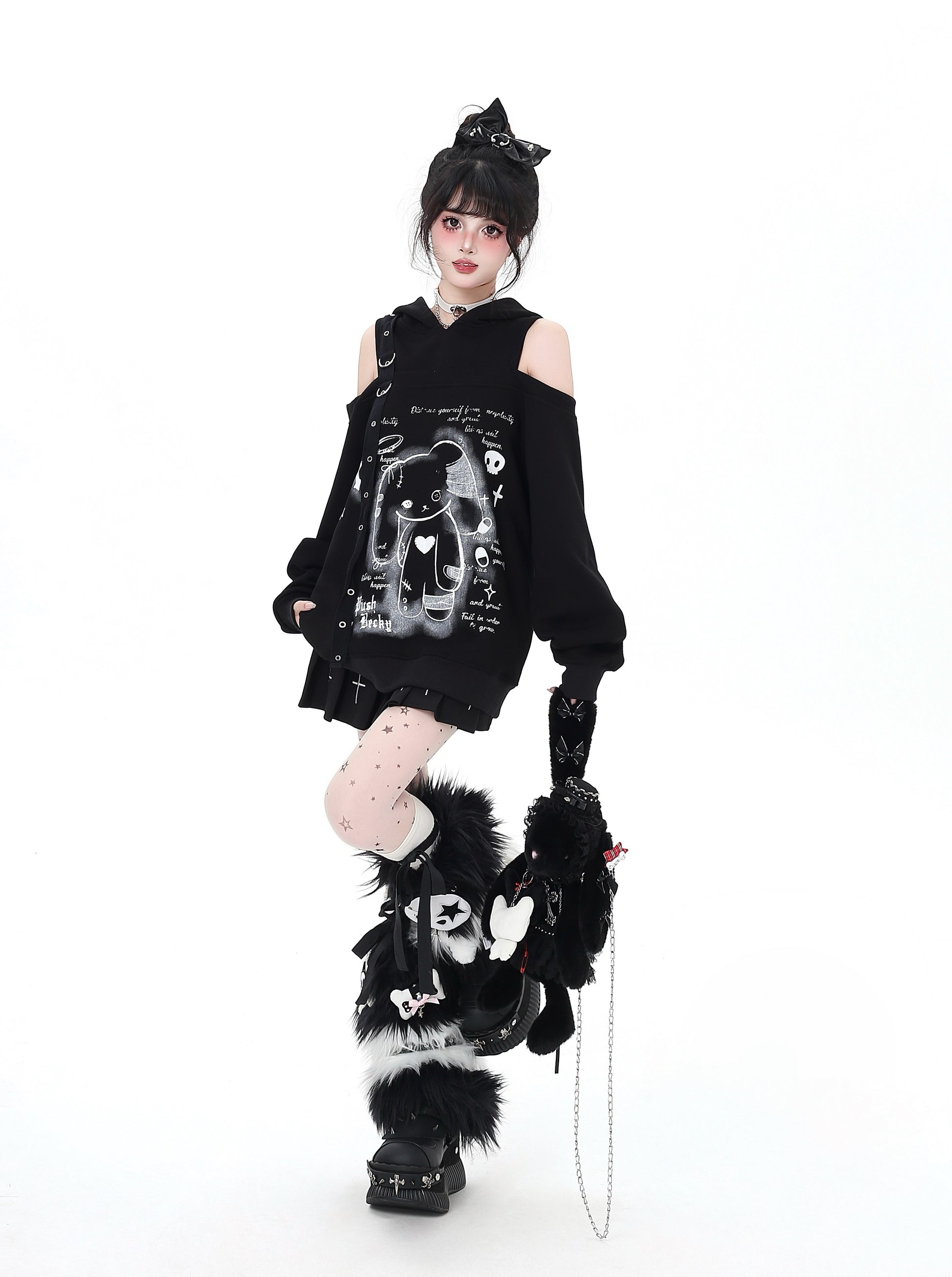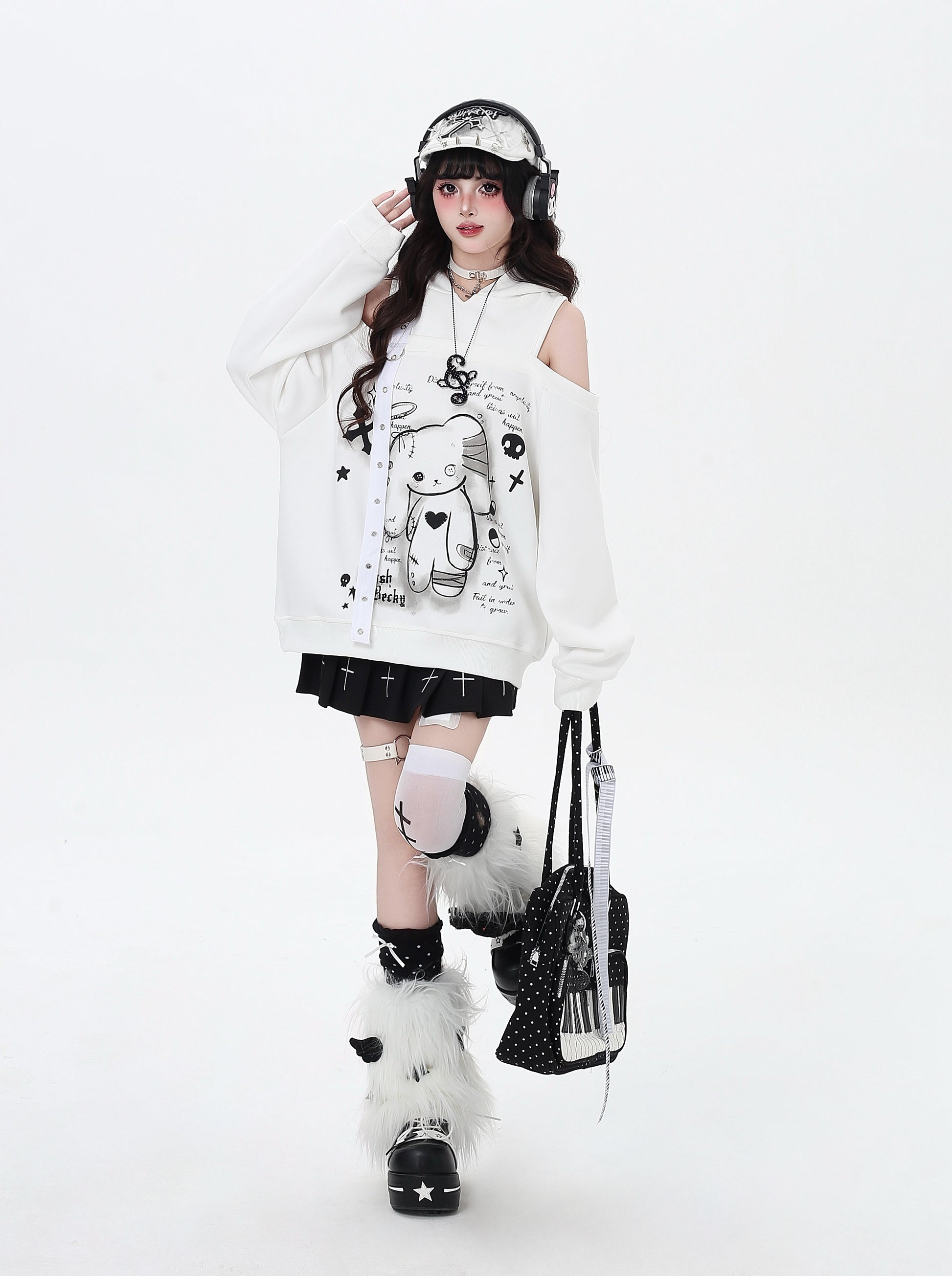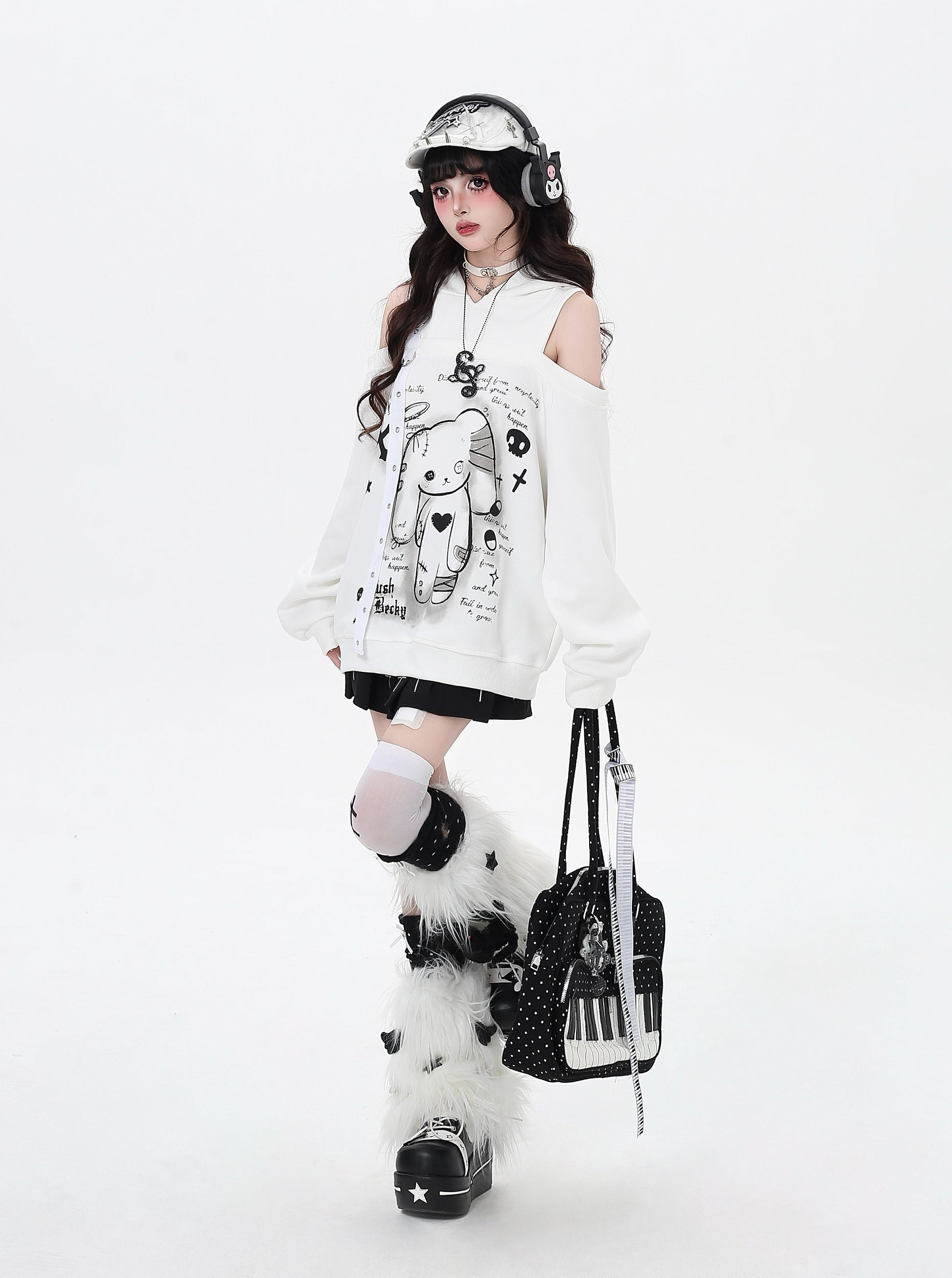闇かわいいデザインのうさ耳フードとオフショルで、甘さとクールさを両立♡ゆるっとしたシルエットでリラックス感も◎。秋冬のサブカルコーデにぴったりの一枚です✨