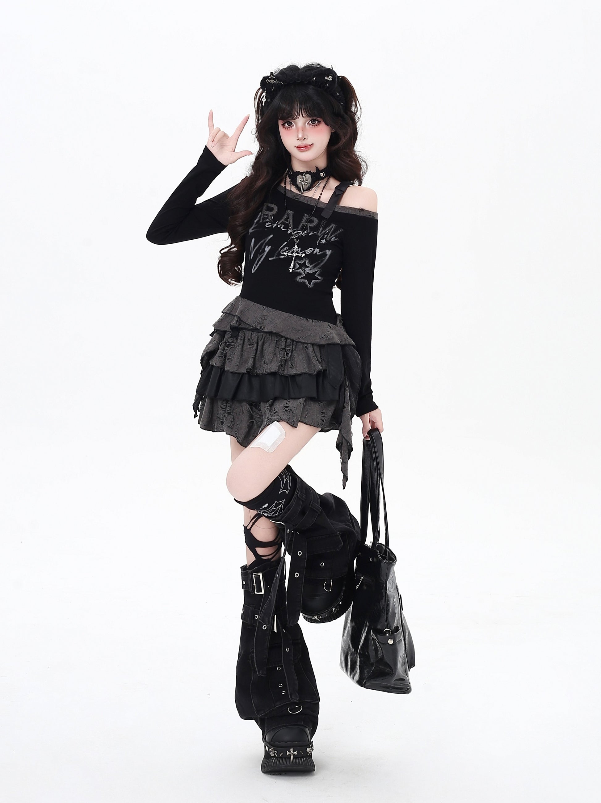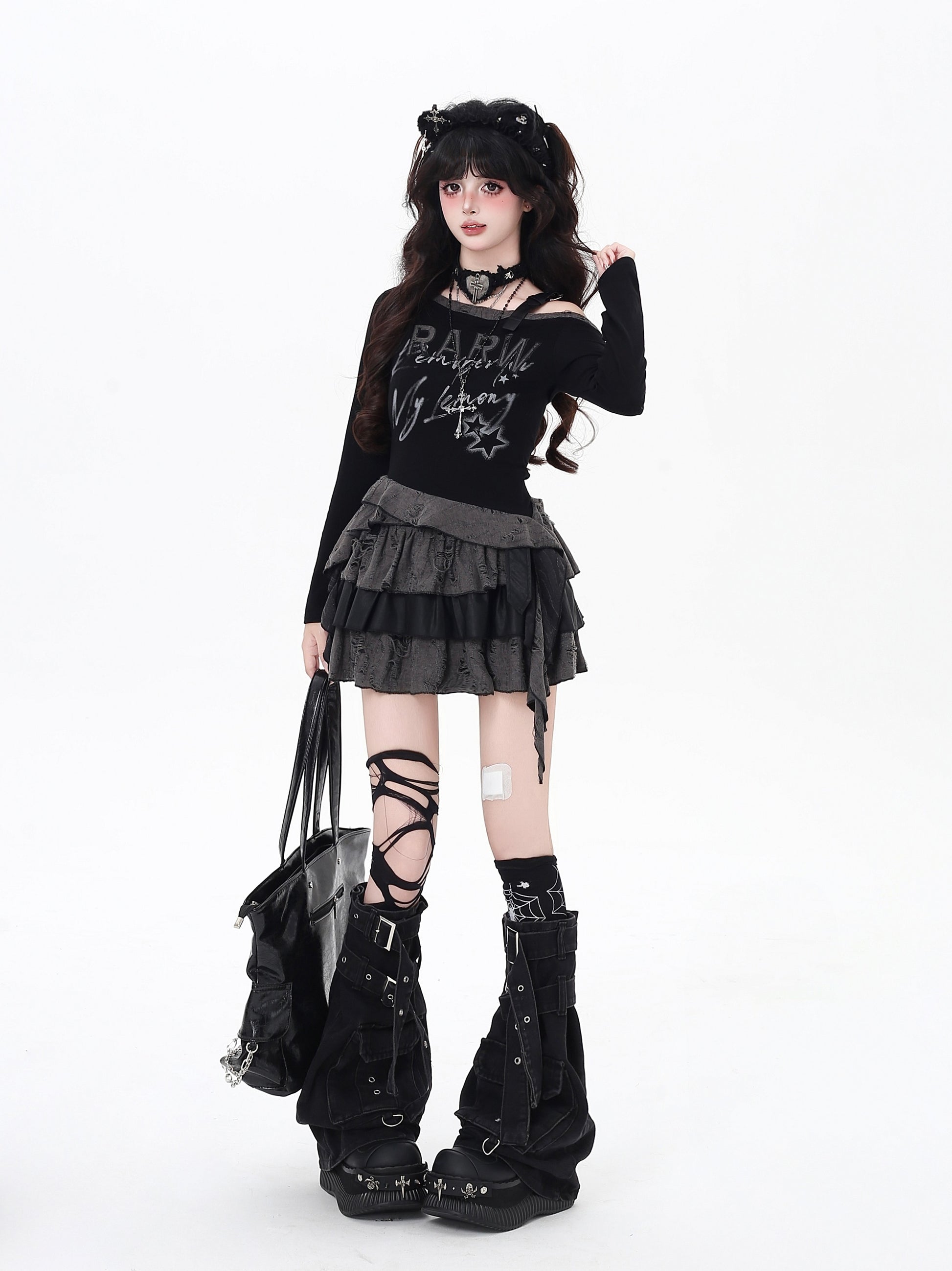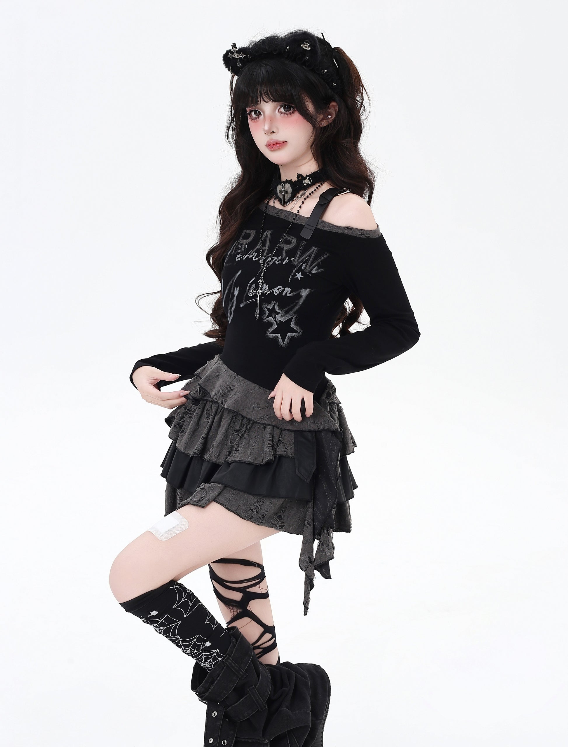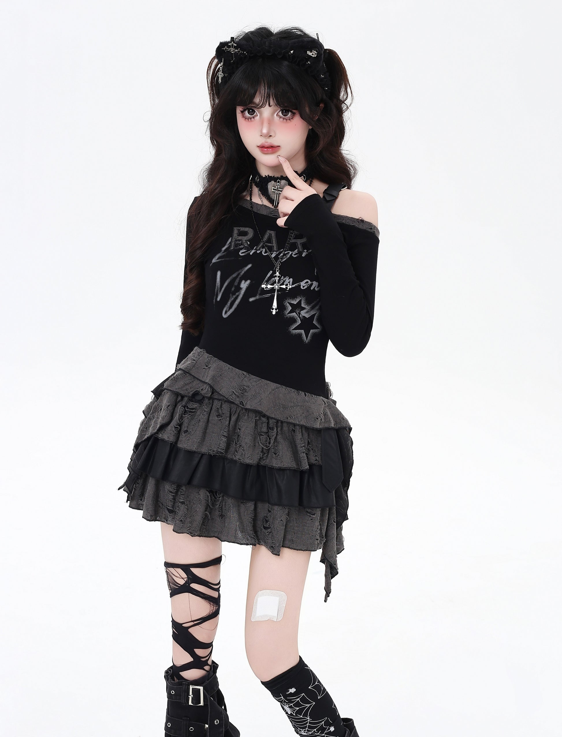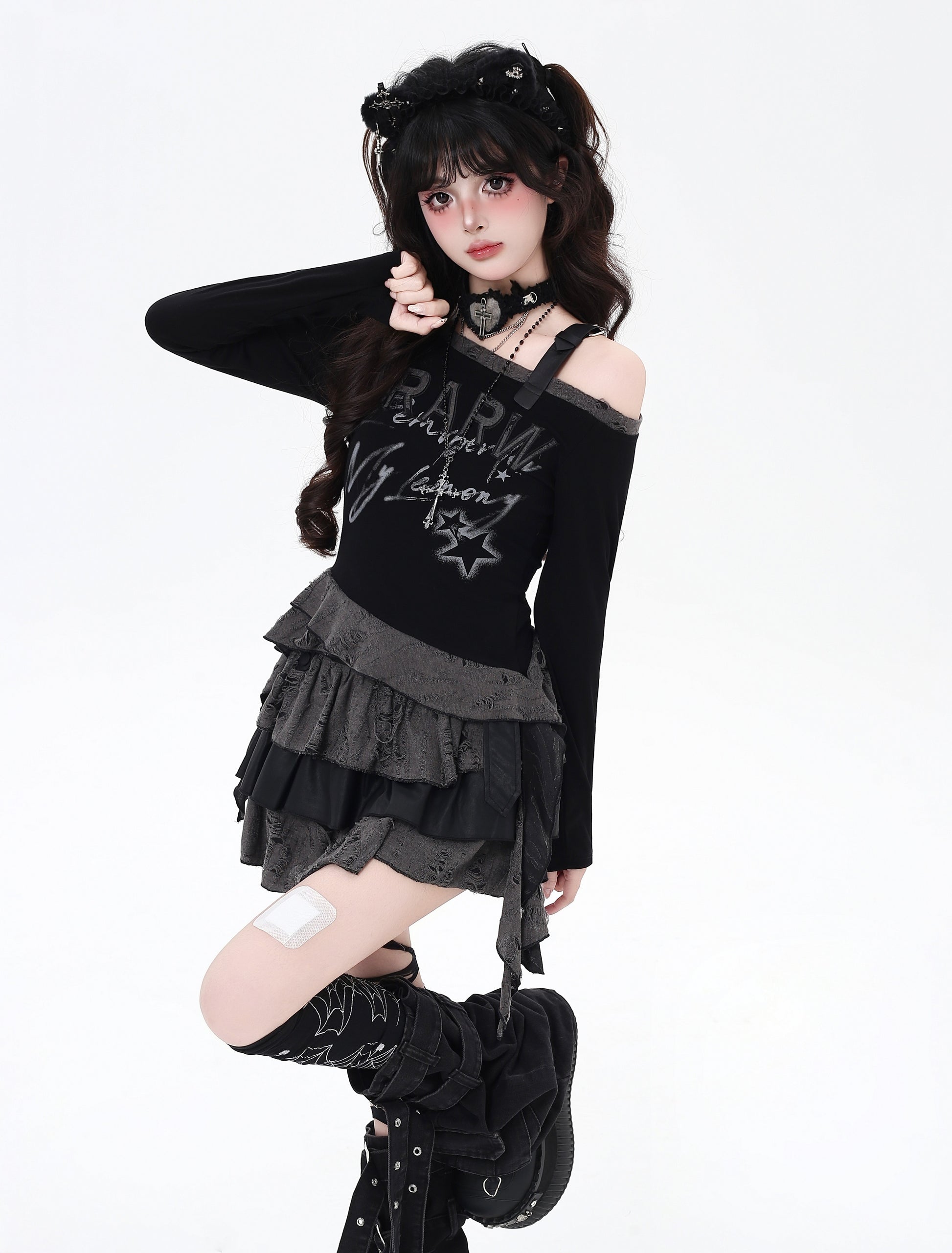 破れ加工でこなれ感MAX♡ アシンメトリー肩出しデザインがスリム見え効果抜群。秋コーデにぴったりの長袖Tシャツです。