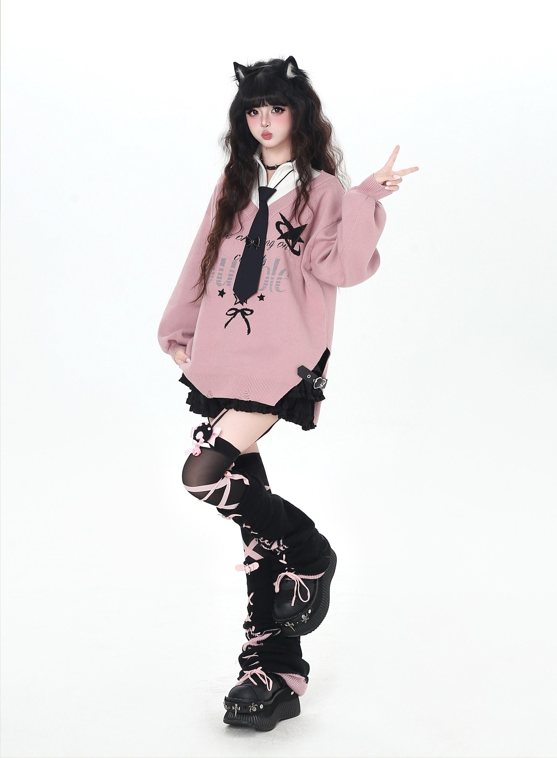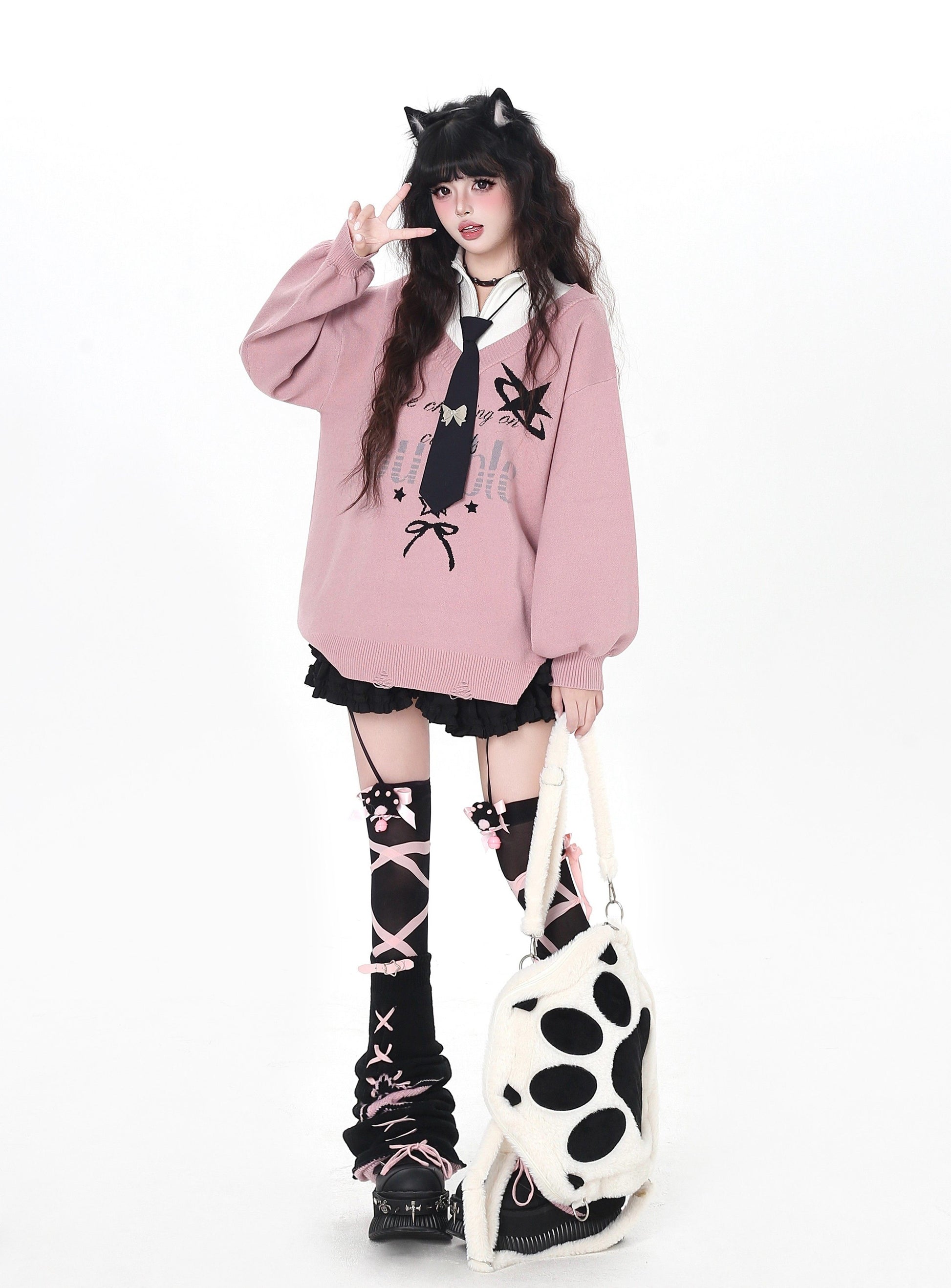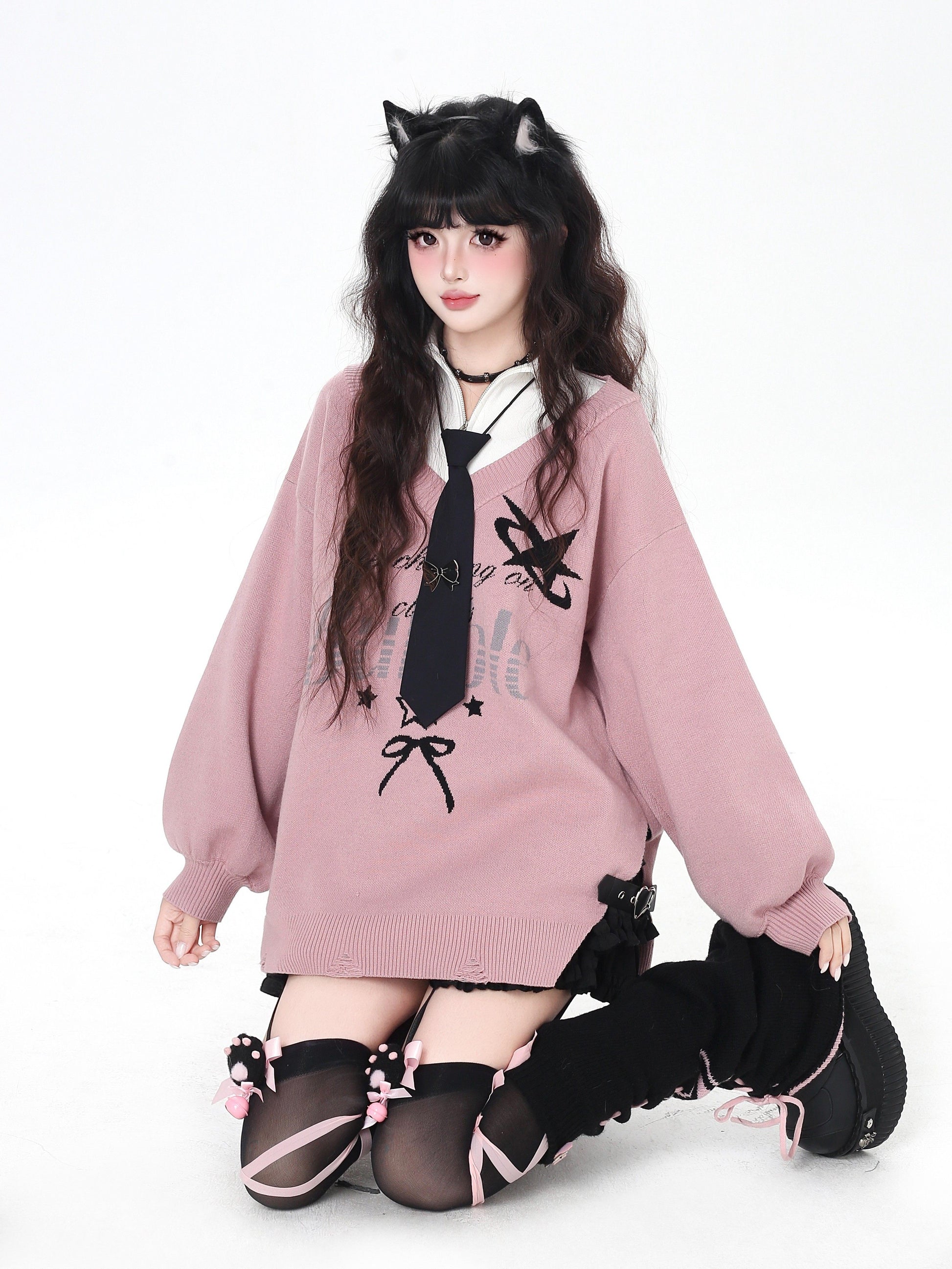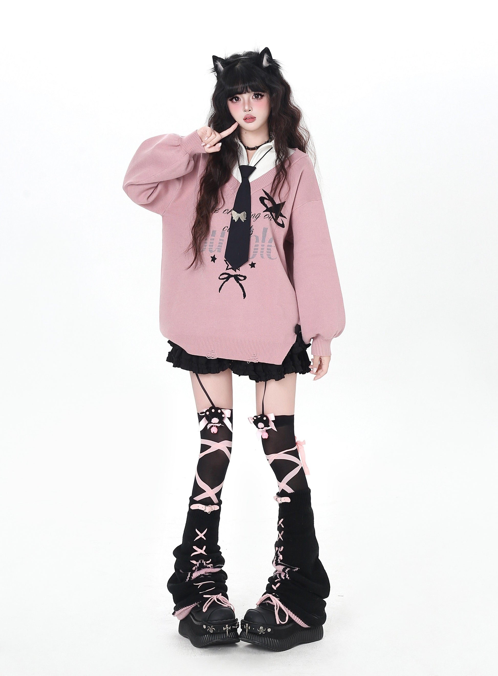 ゆるギャル系 Vネック配色リボンニット♡秋冬甘辛ミックス