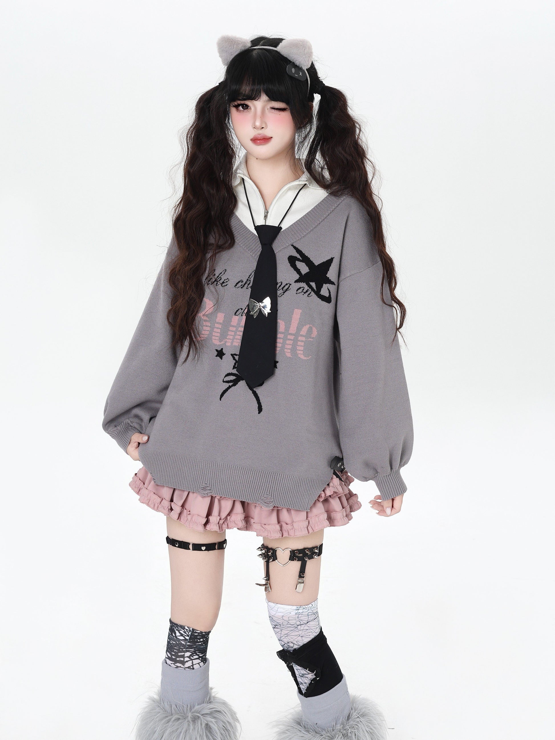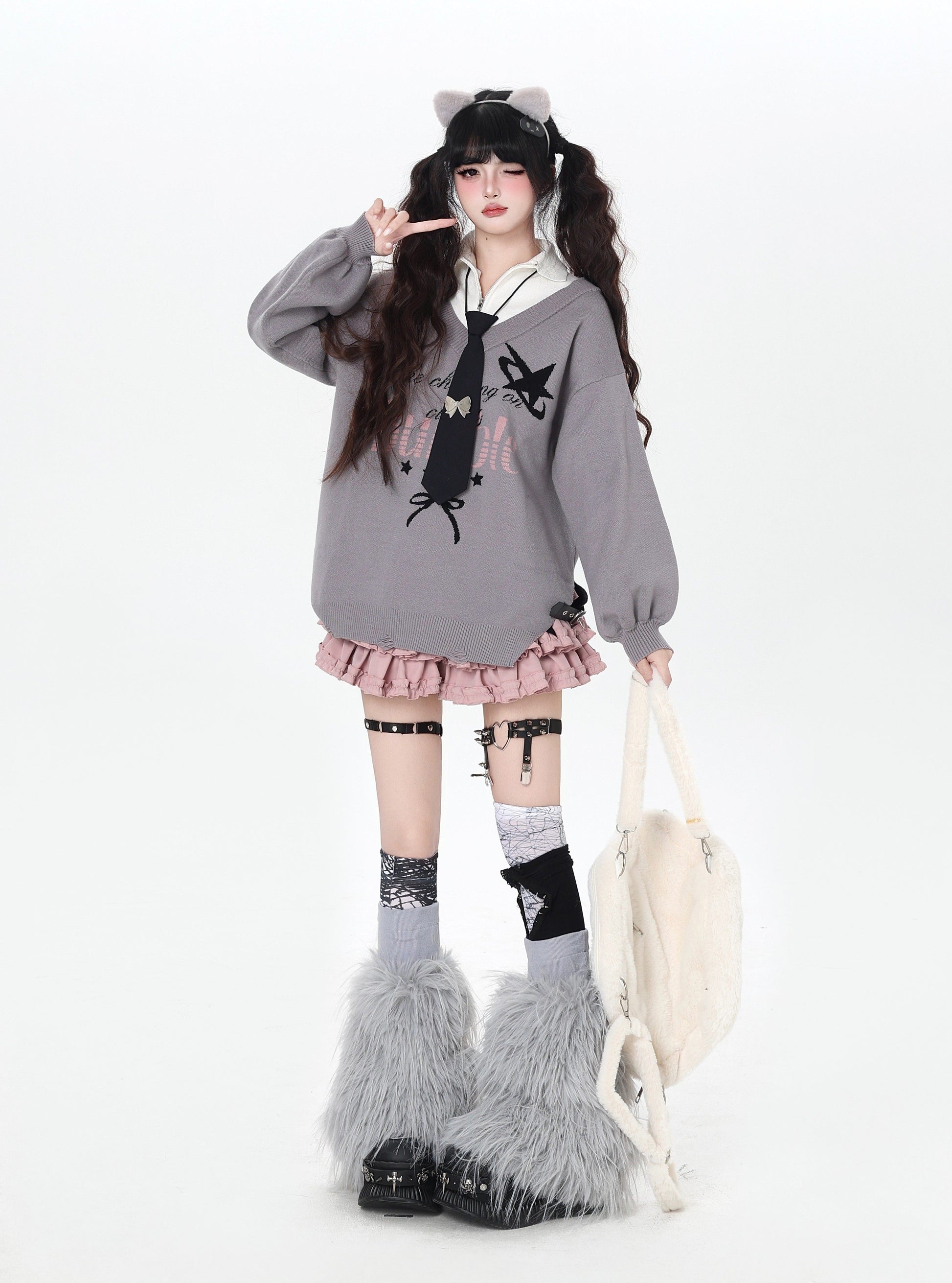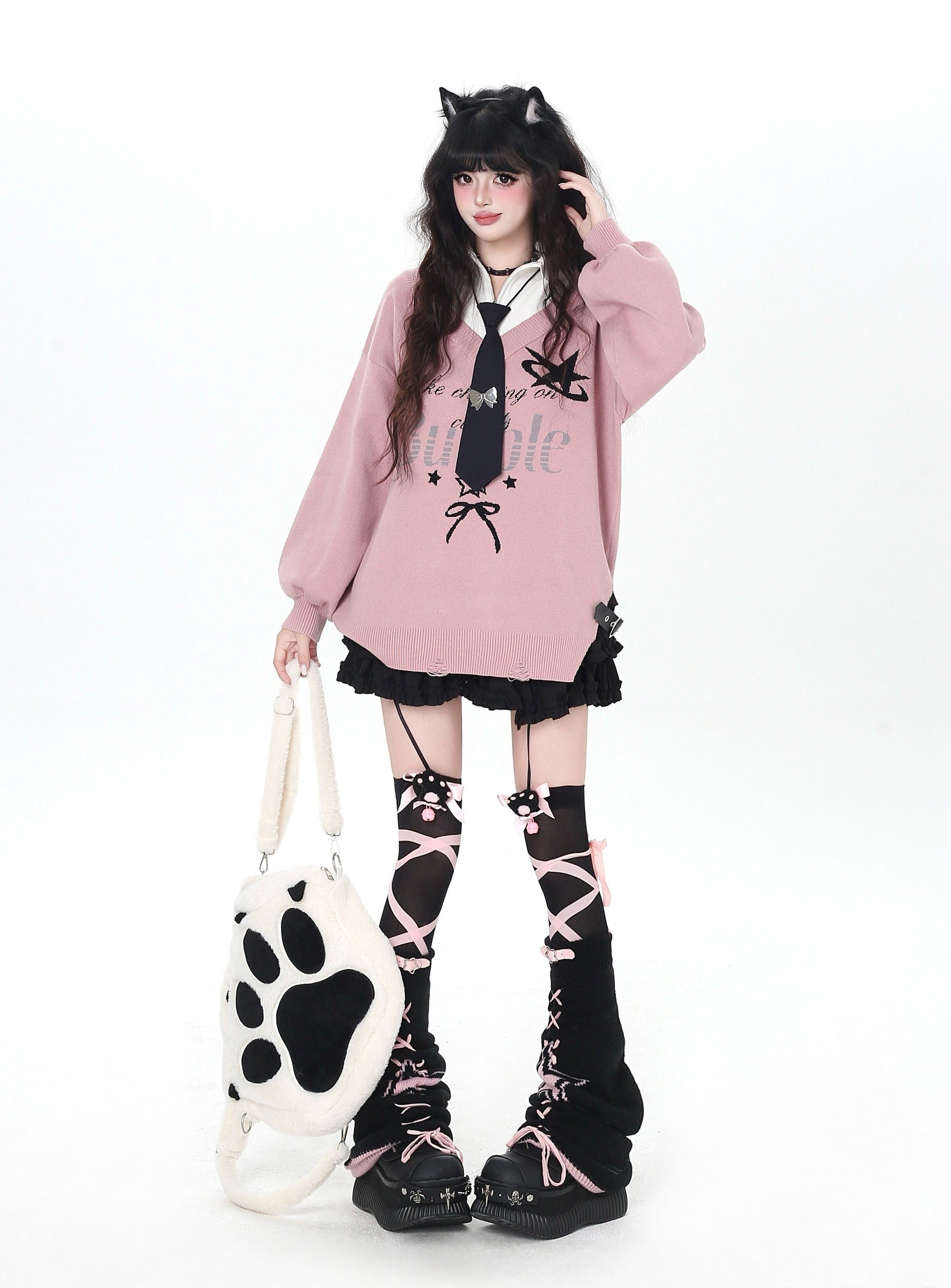 ゆるギャル系 Vネック配色リボンニット♡秋冬甘辛ミックス