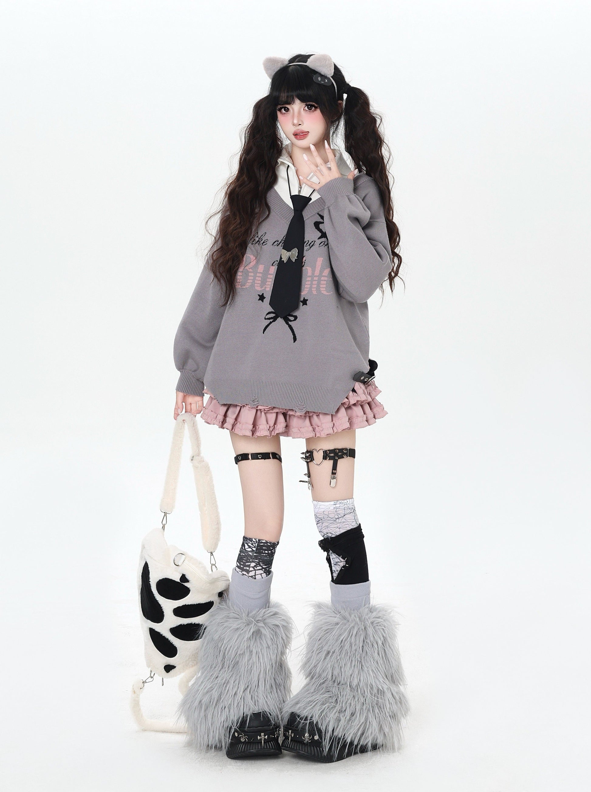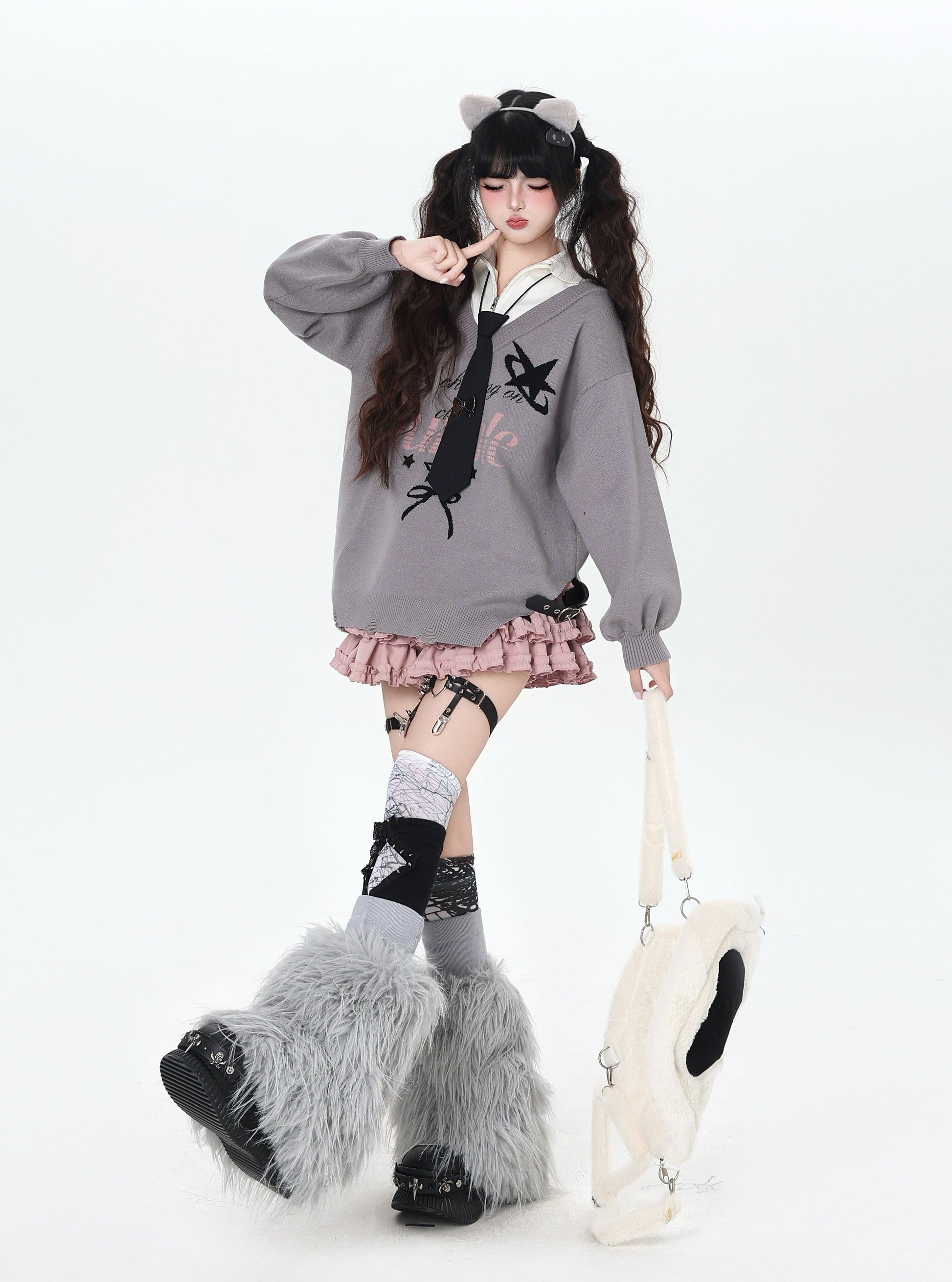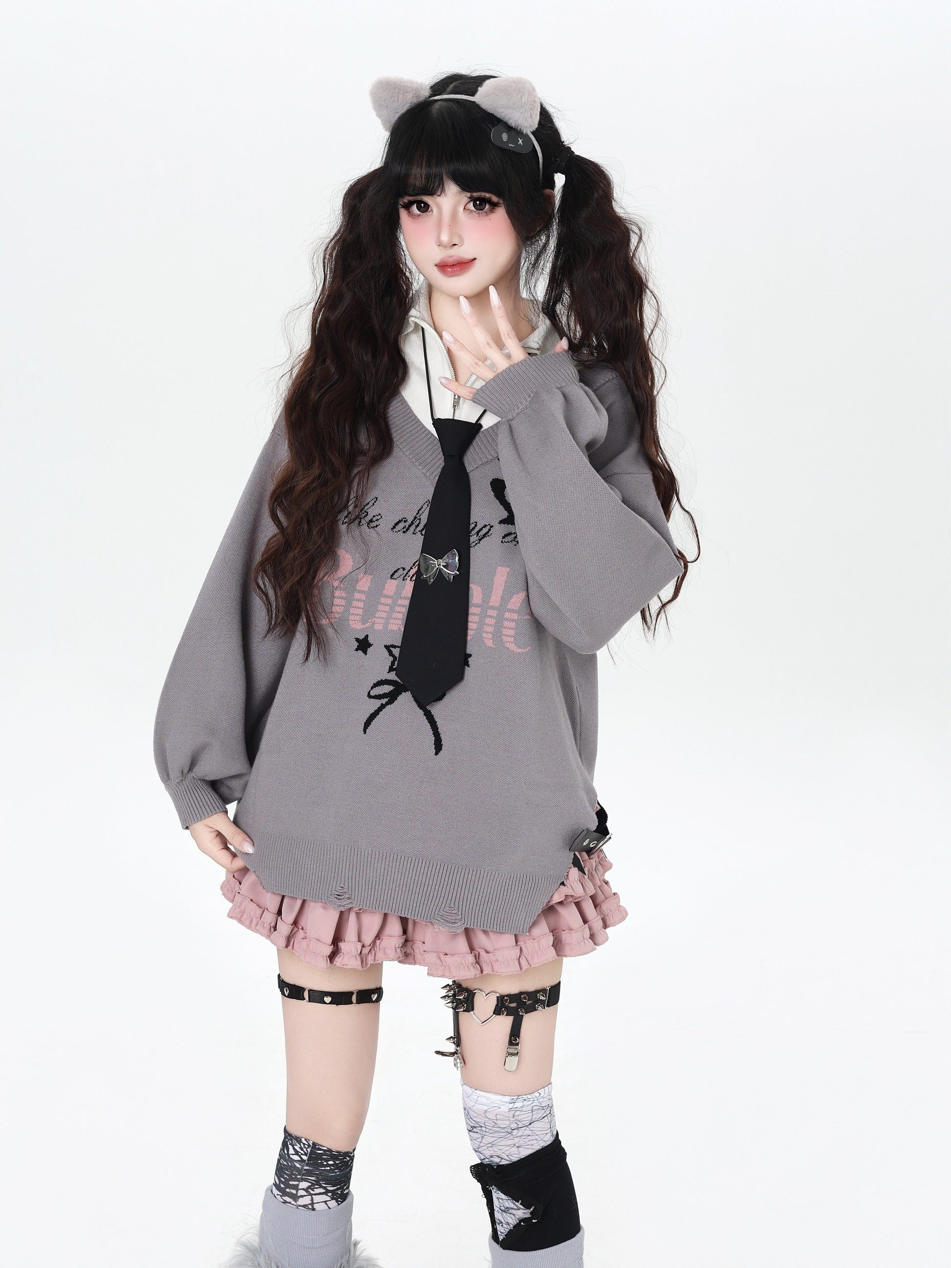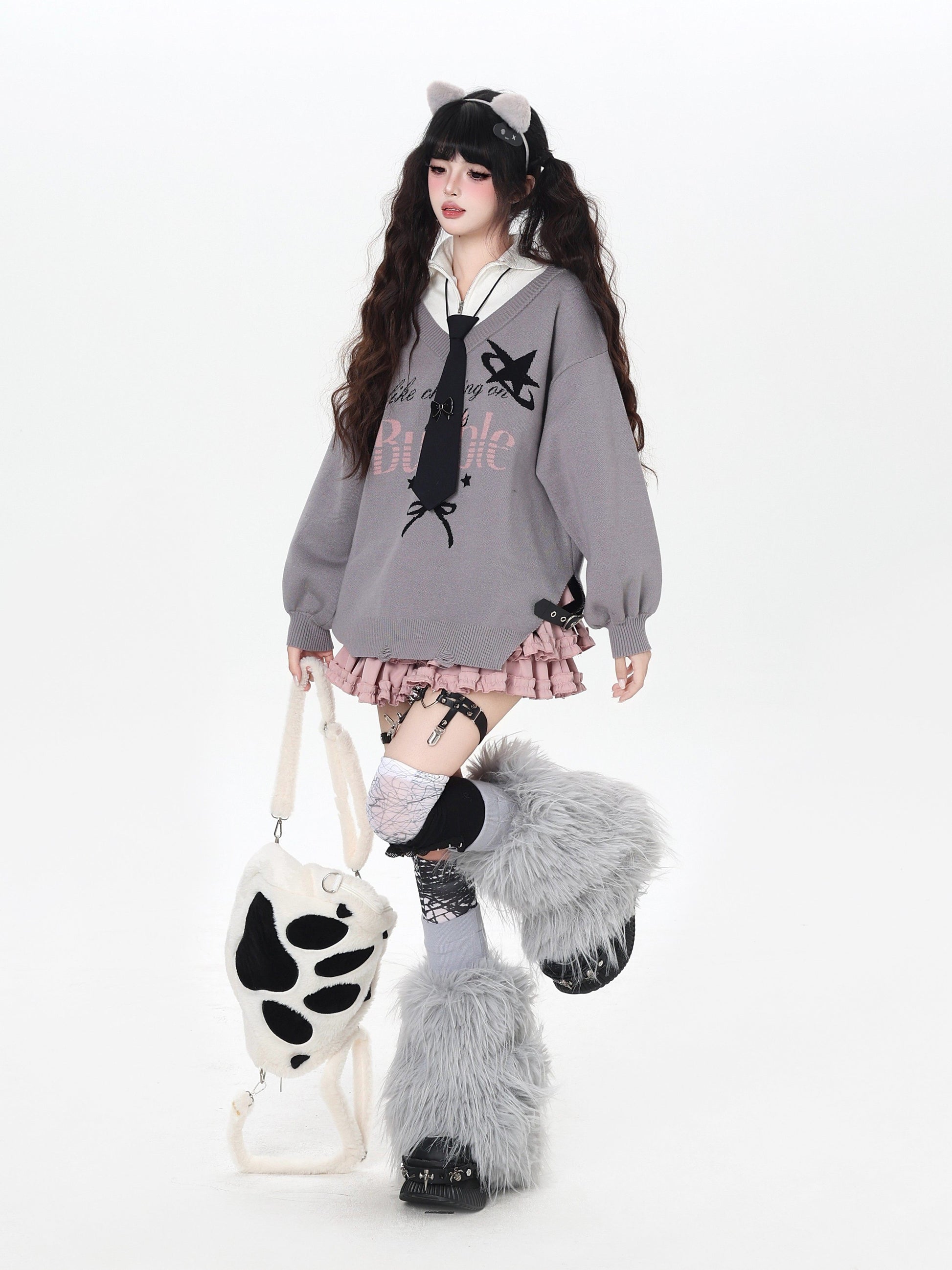ゆるギャル系 Vネック配色リボンニット♡秋冬甘辛ミックス