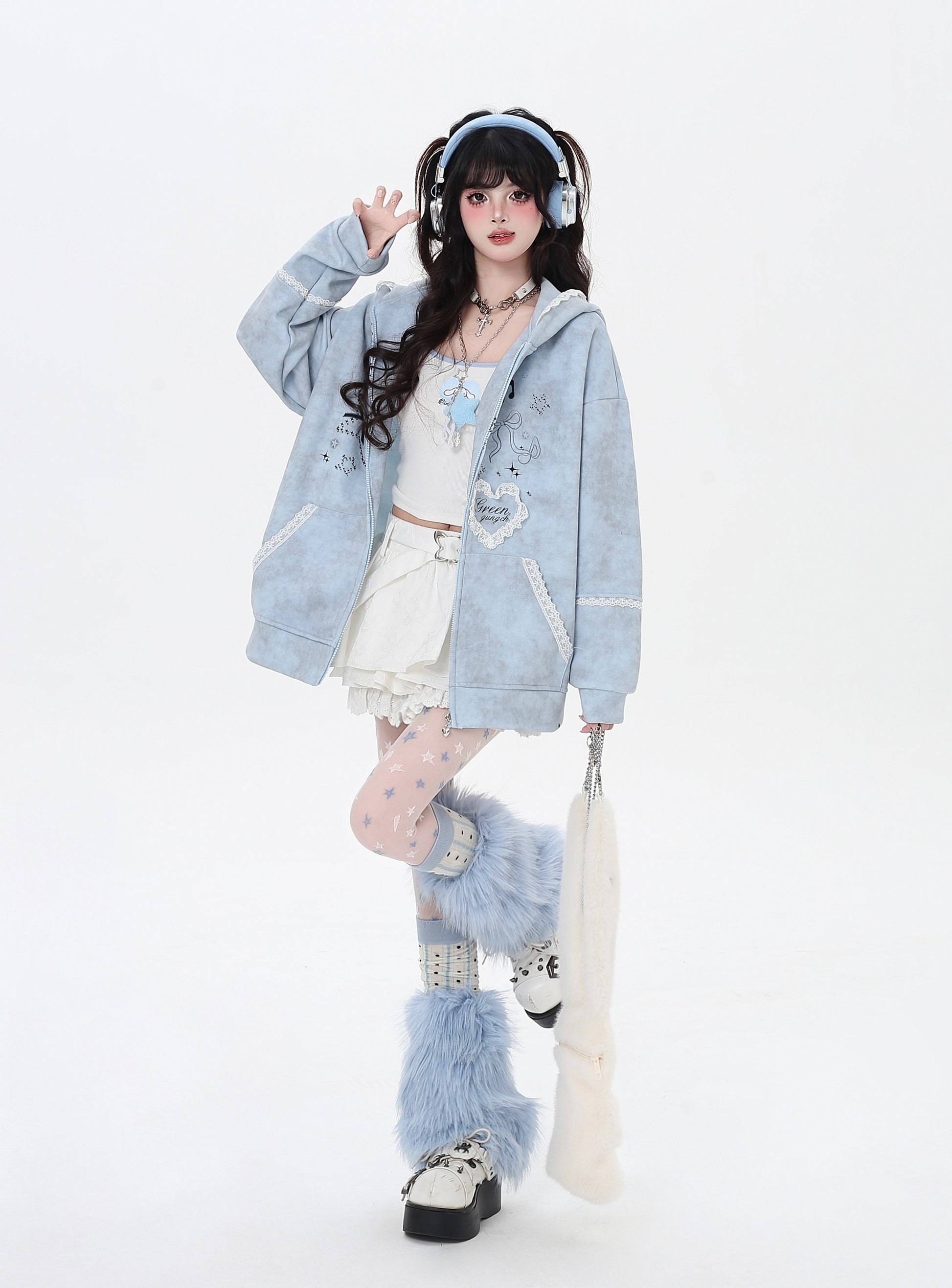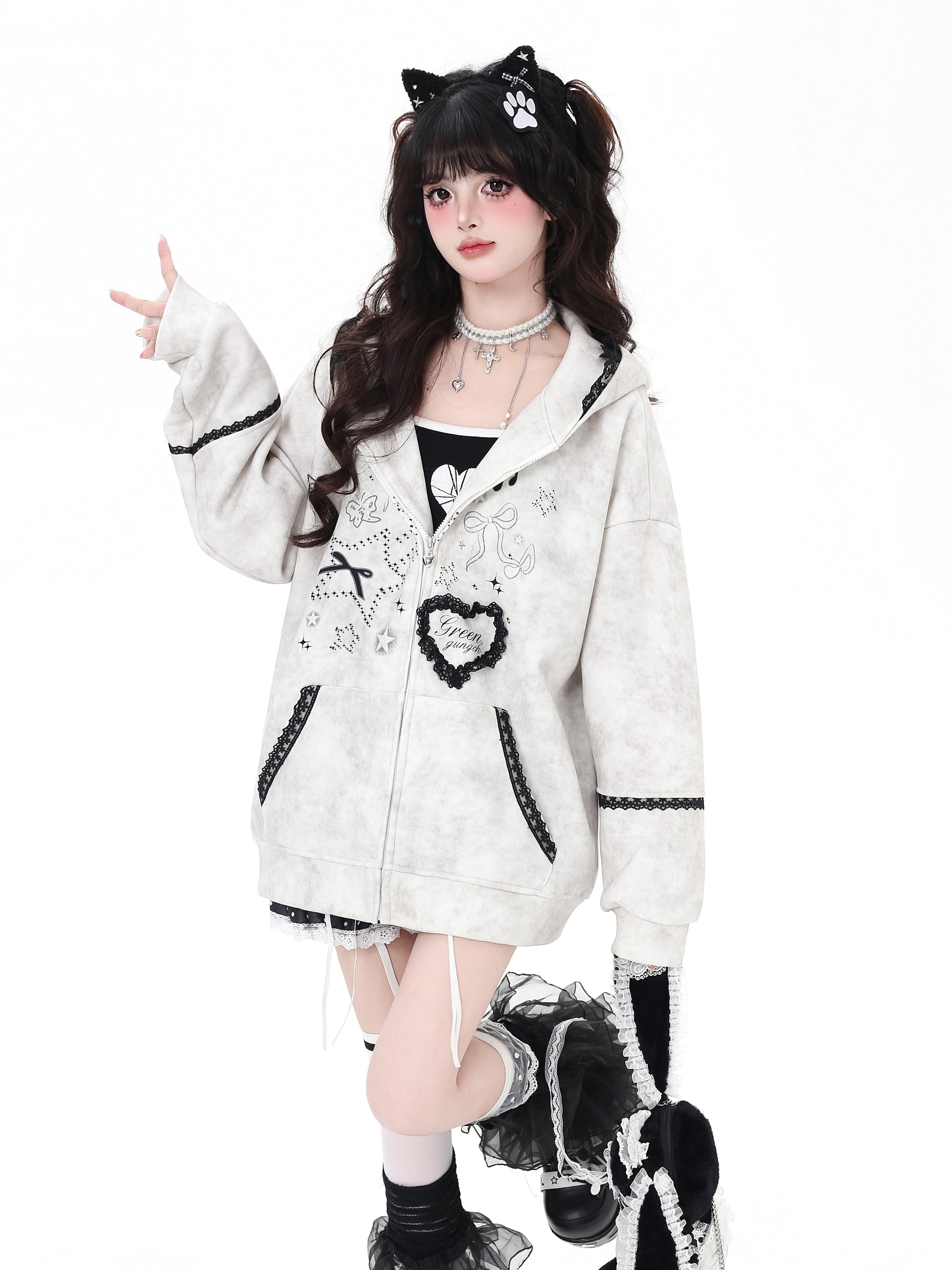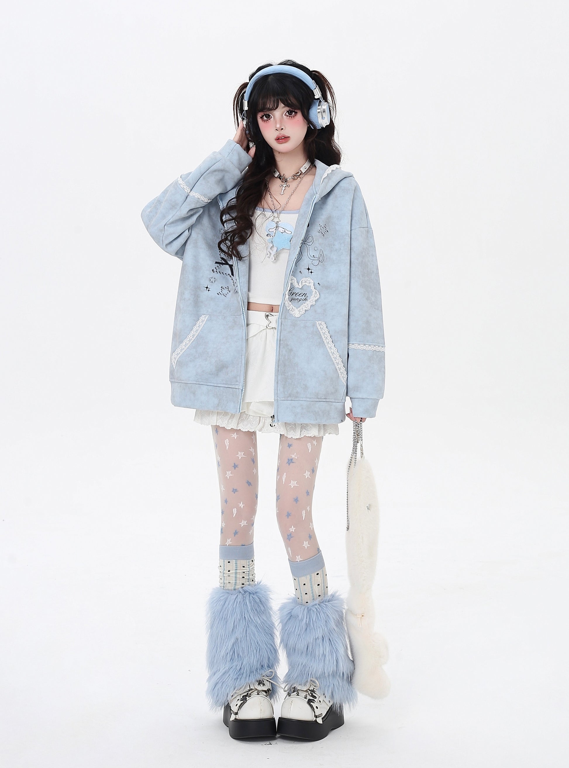 ふわっとしたシルエットにレース×うさ耳フードがポイント。秋冬の甘かわいいゆる地雷系コーデにぴったりな、存在感たっぷりのデザインパーカー。