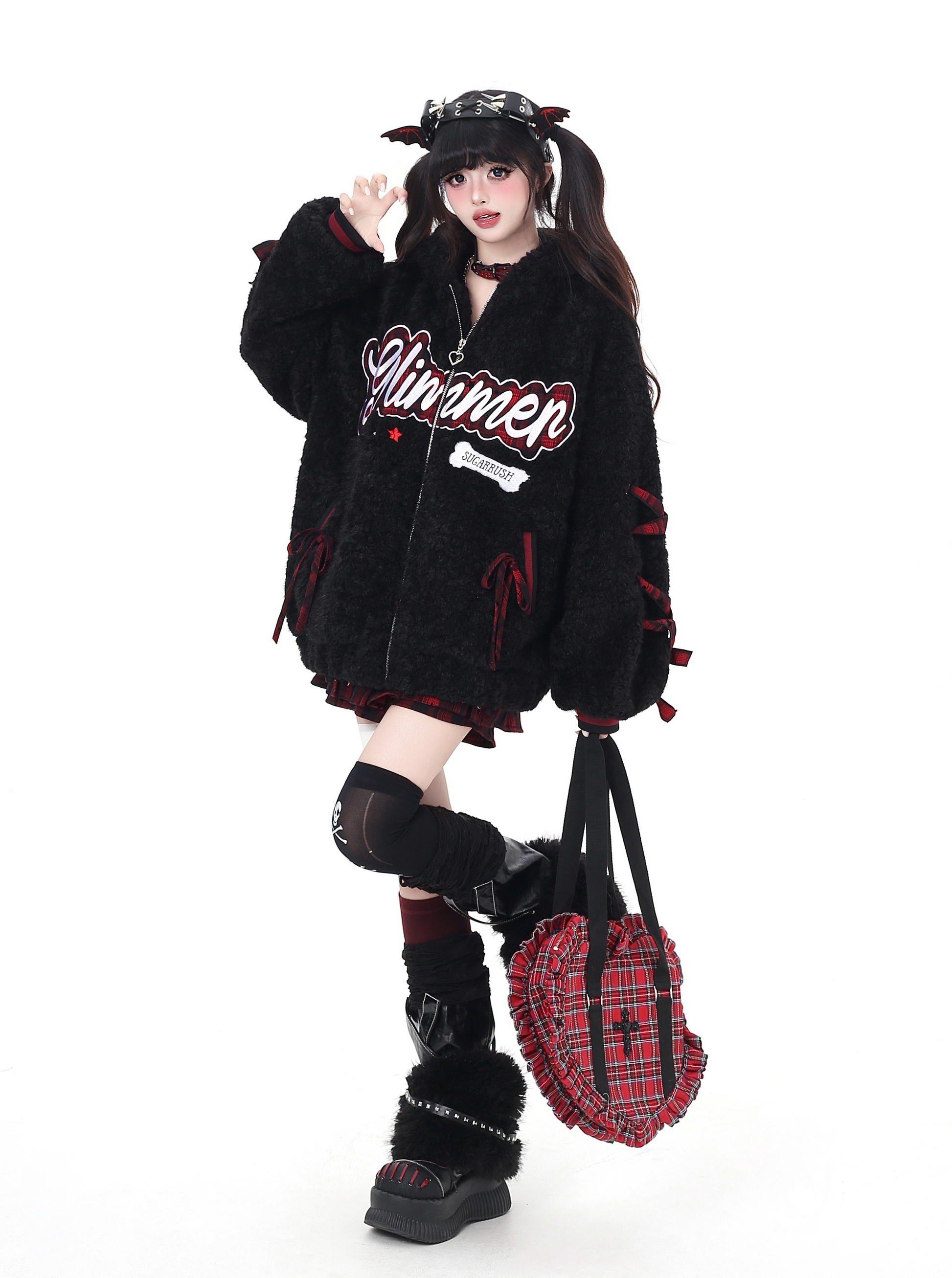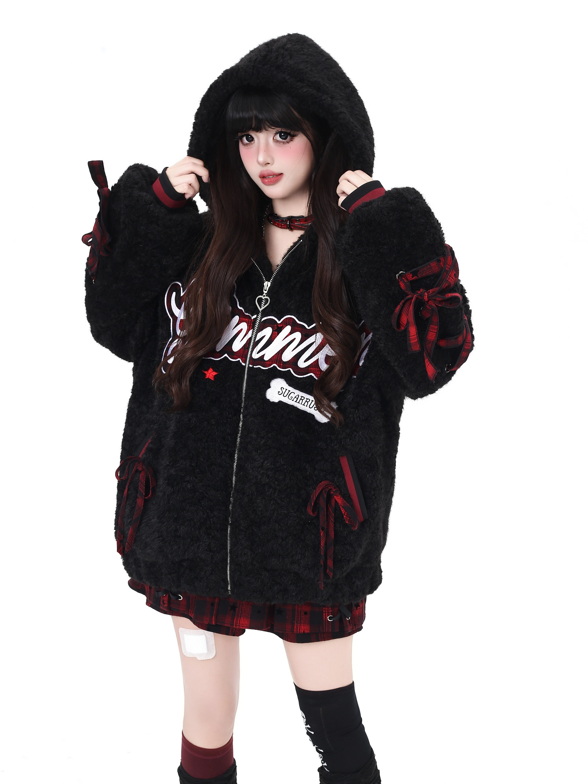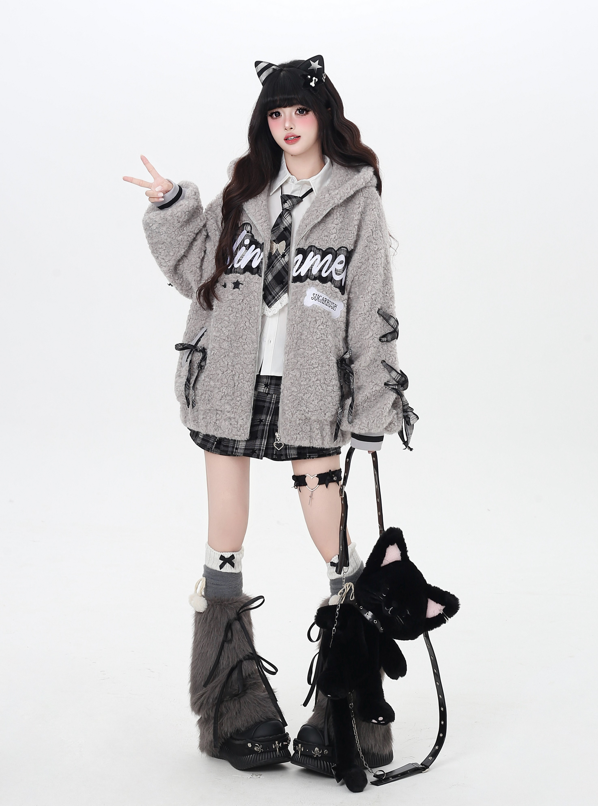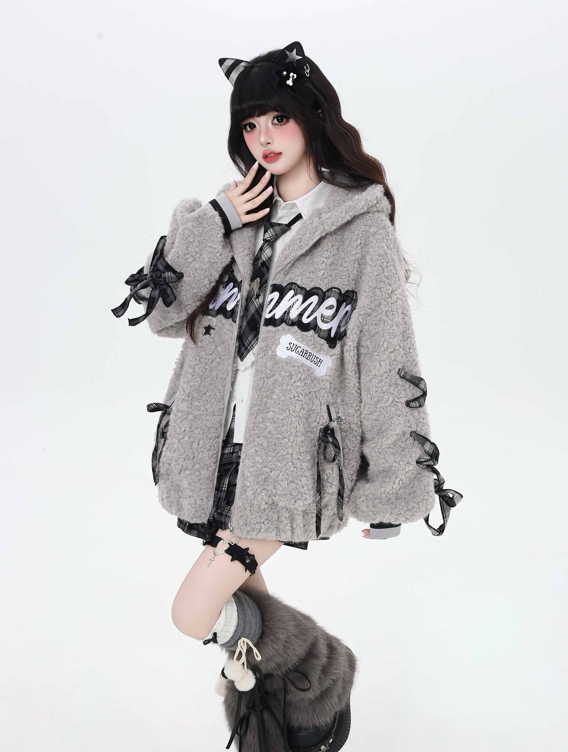 アルファベット刺繍とリボンデザインがポイントの厚手ボアジャケットで、冬のコーデにぴったりの保温アイテム。ゆるカジュアルや量産型、推し活やOOTDにも映える、街中でも写真映えする万能アウターです。