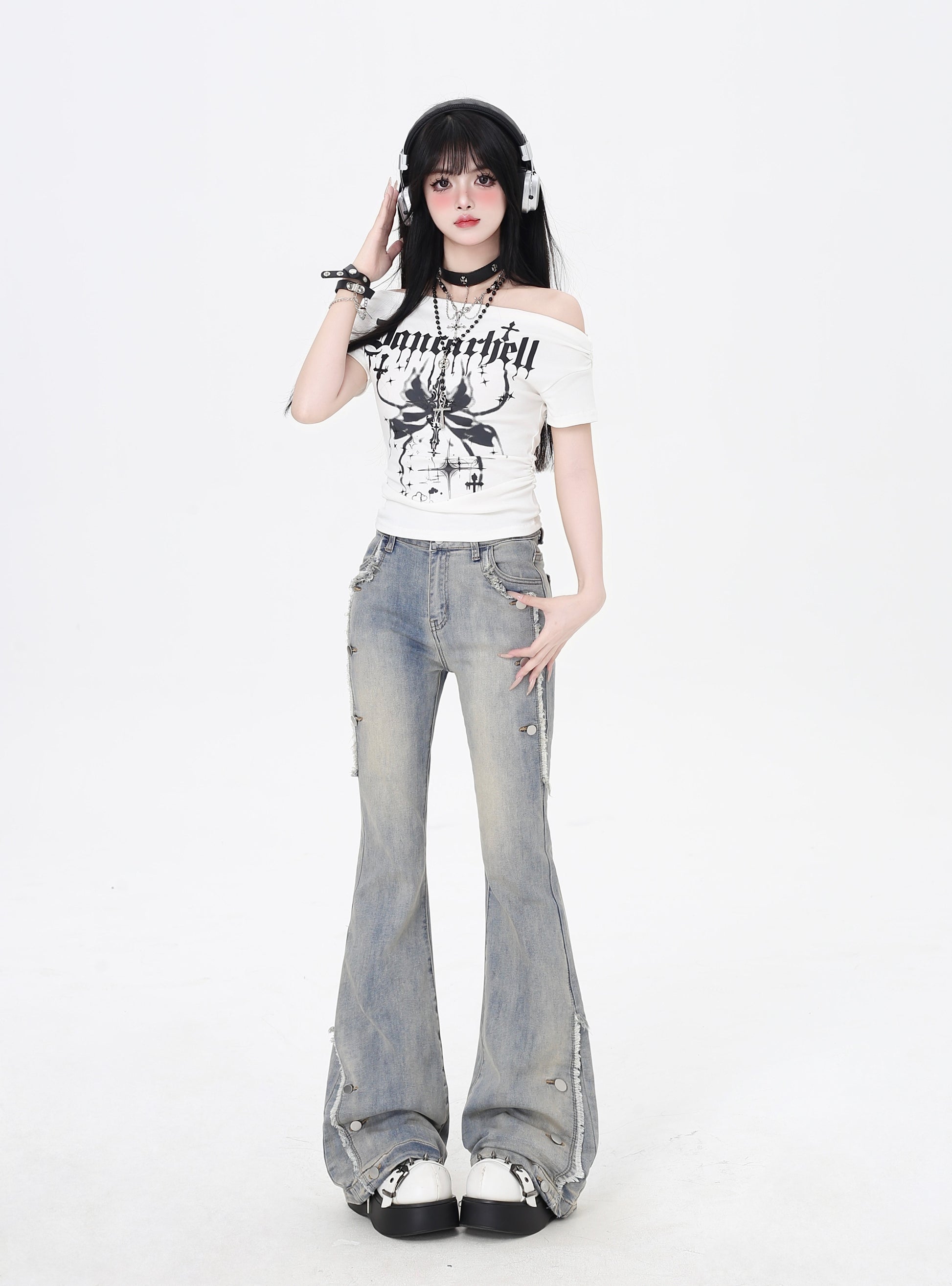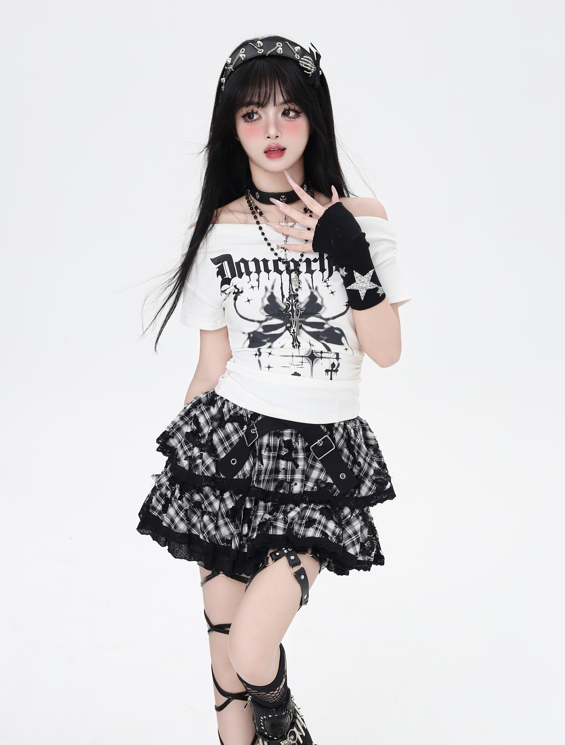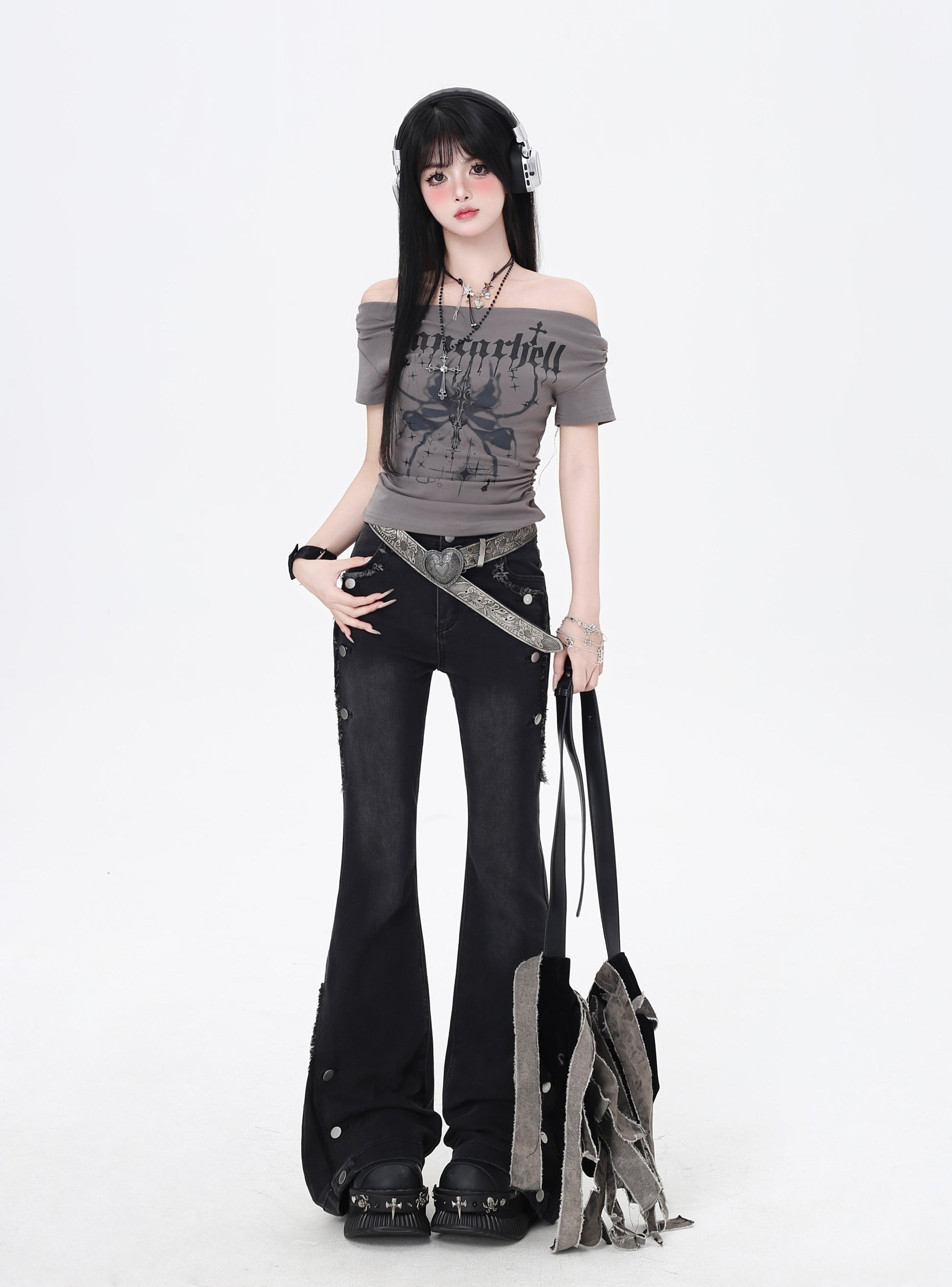 蝶のプリントがアクセントのオフショルダートップス。ウエストを引き締めるデザインで、スタイルアップ効果抜群。甘辛ミックスで、個性的なアジアンストリートファッションにぴったり。少数派なスタイルを楽しむあなたに。