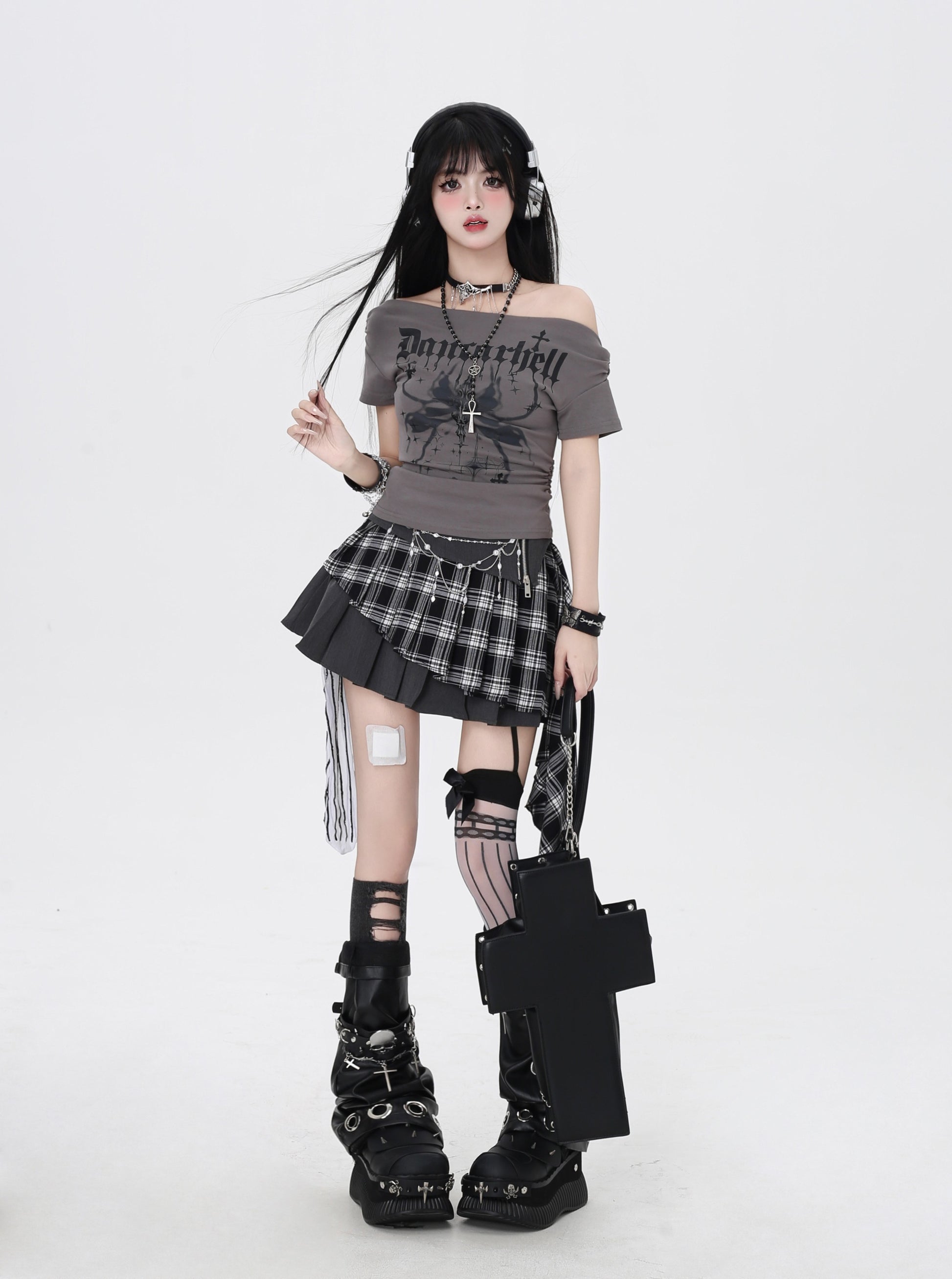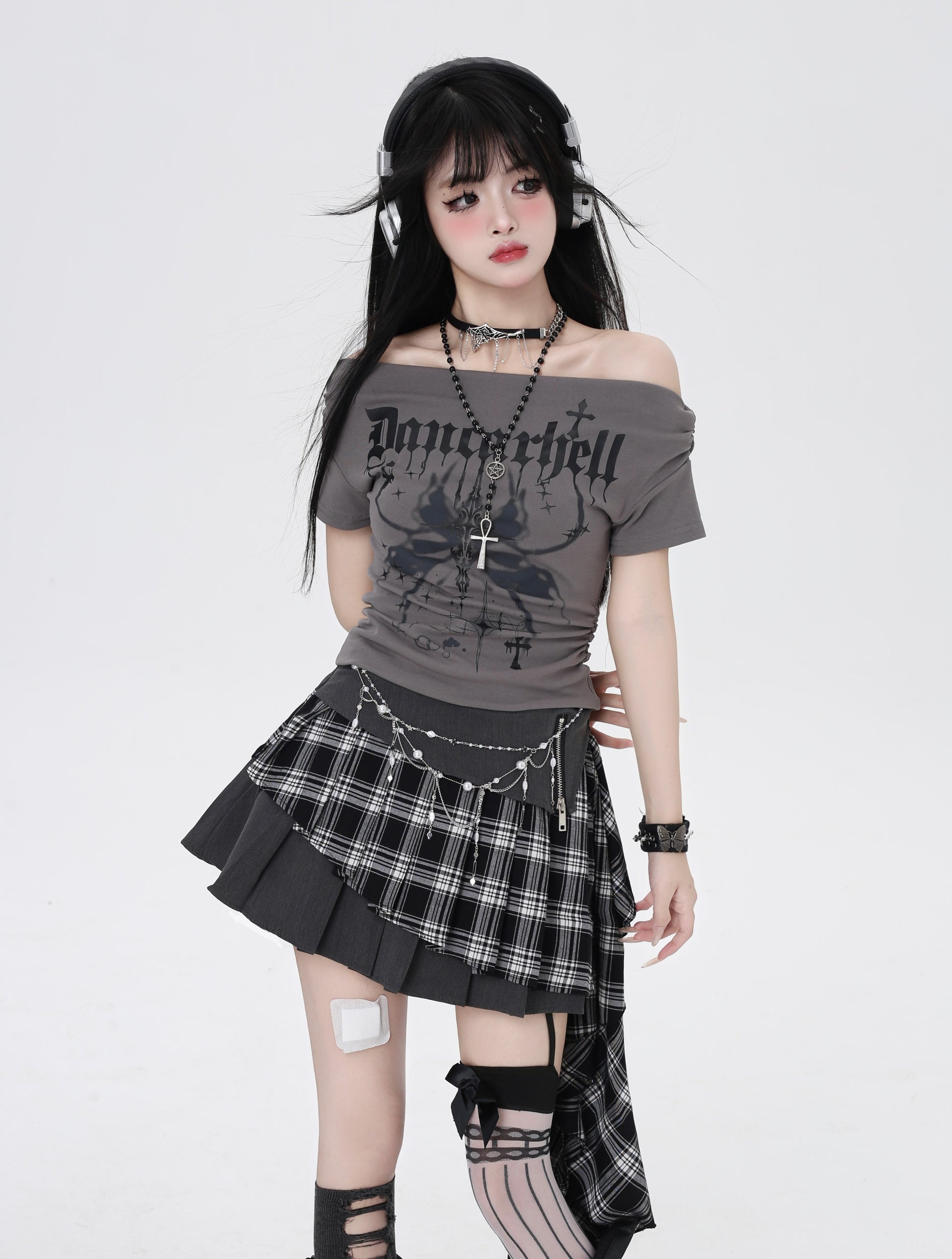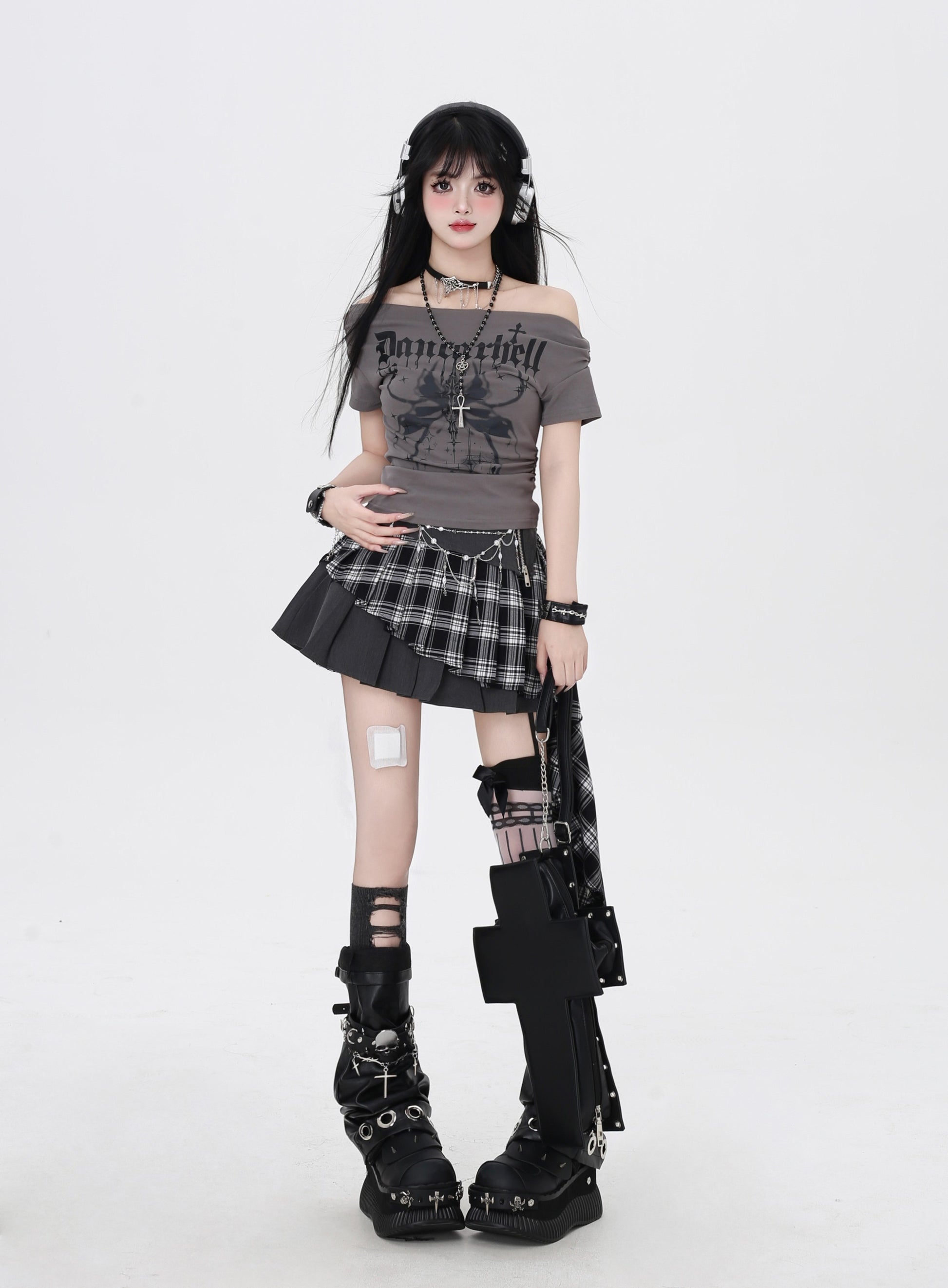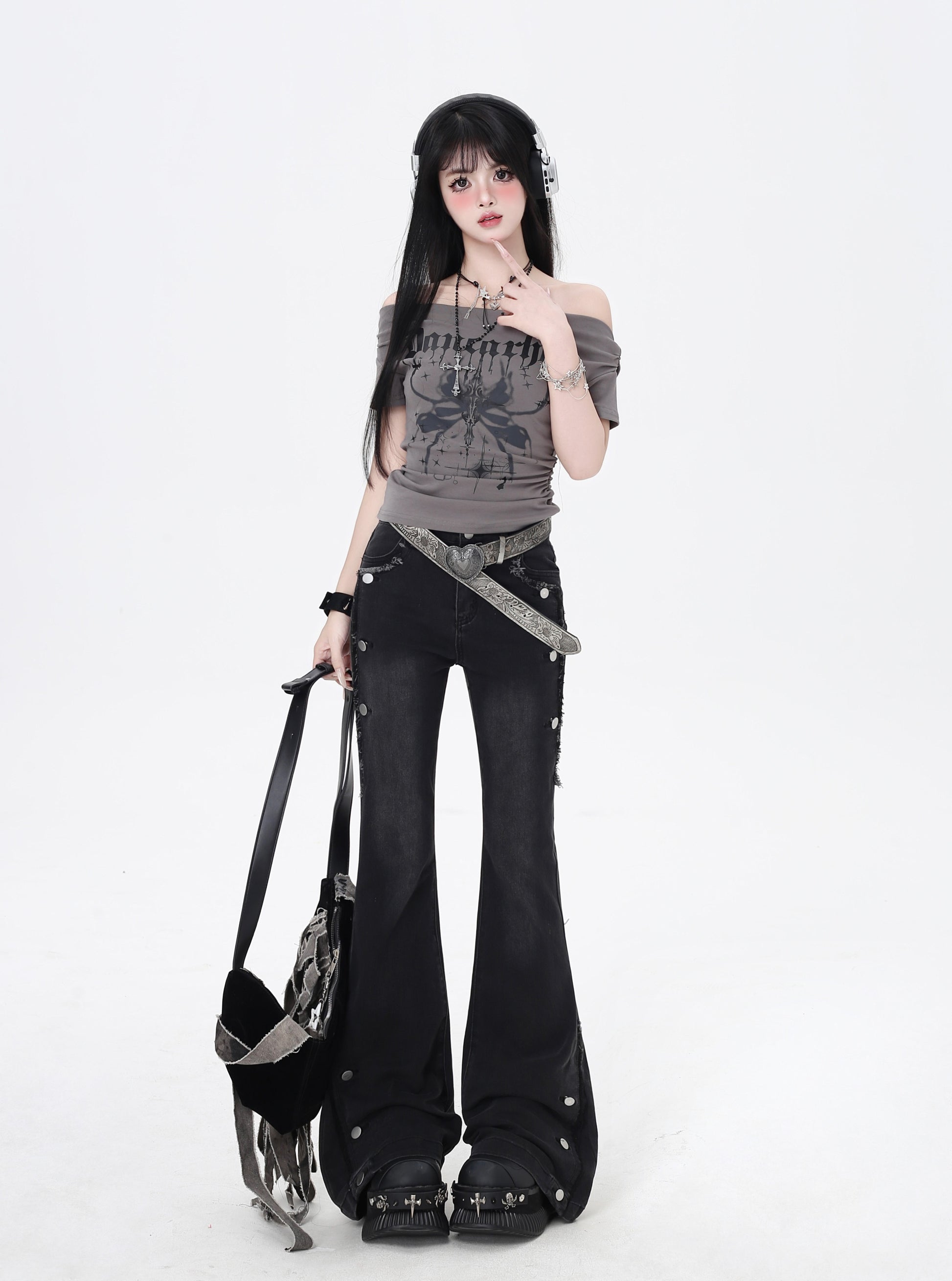 蝶のプリントがアクセントのオフショルダートップス。ウエストを引き締めるデザインで、スタイルアップ効果抜群。甘辛ミックスで、個性的なアジアンストリートファッションにぴったり。少数派なスタイルを楽しむあなたに。
